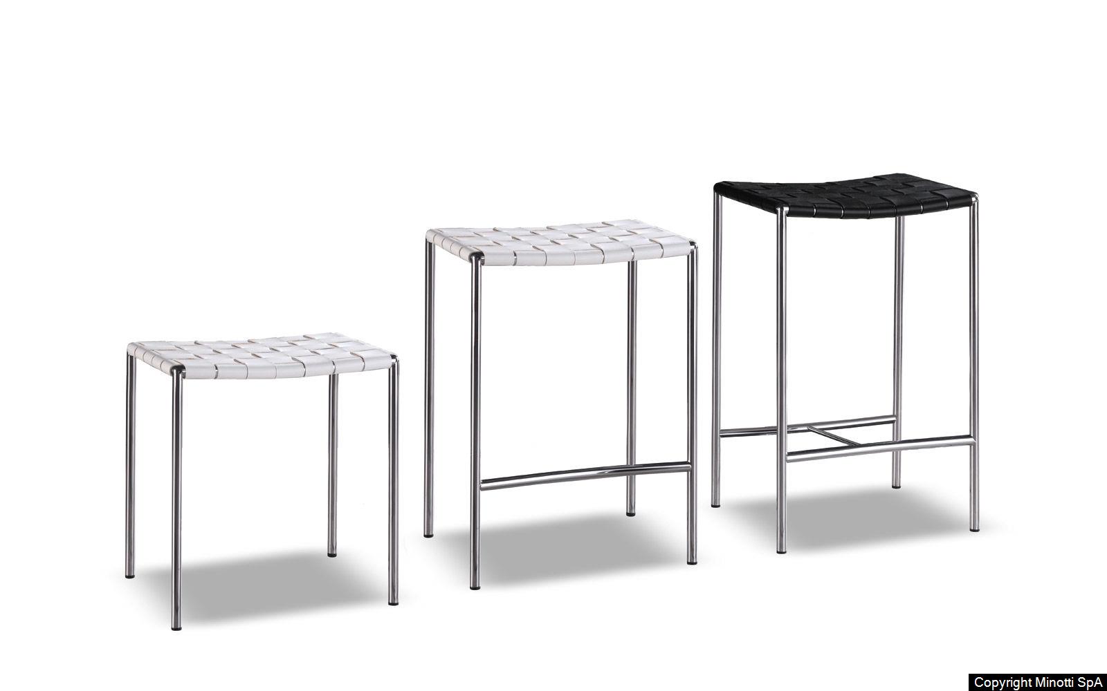 The Klasen stool is available in three heights – 45, 65 and 75 cm – with chrome or Black painted frame and the woven saddle-hide seat in White, Natural, Dark Brown or Black.