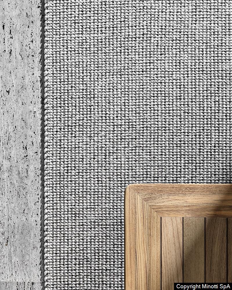 The innovative look of the Kyoto rug is a Minotti exclusive, created using unique looms and multi-coloured cords in shades of white, grey and black.