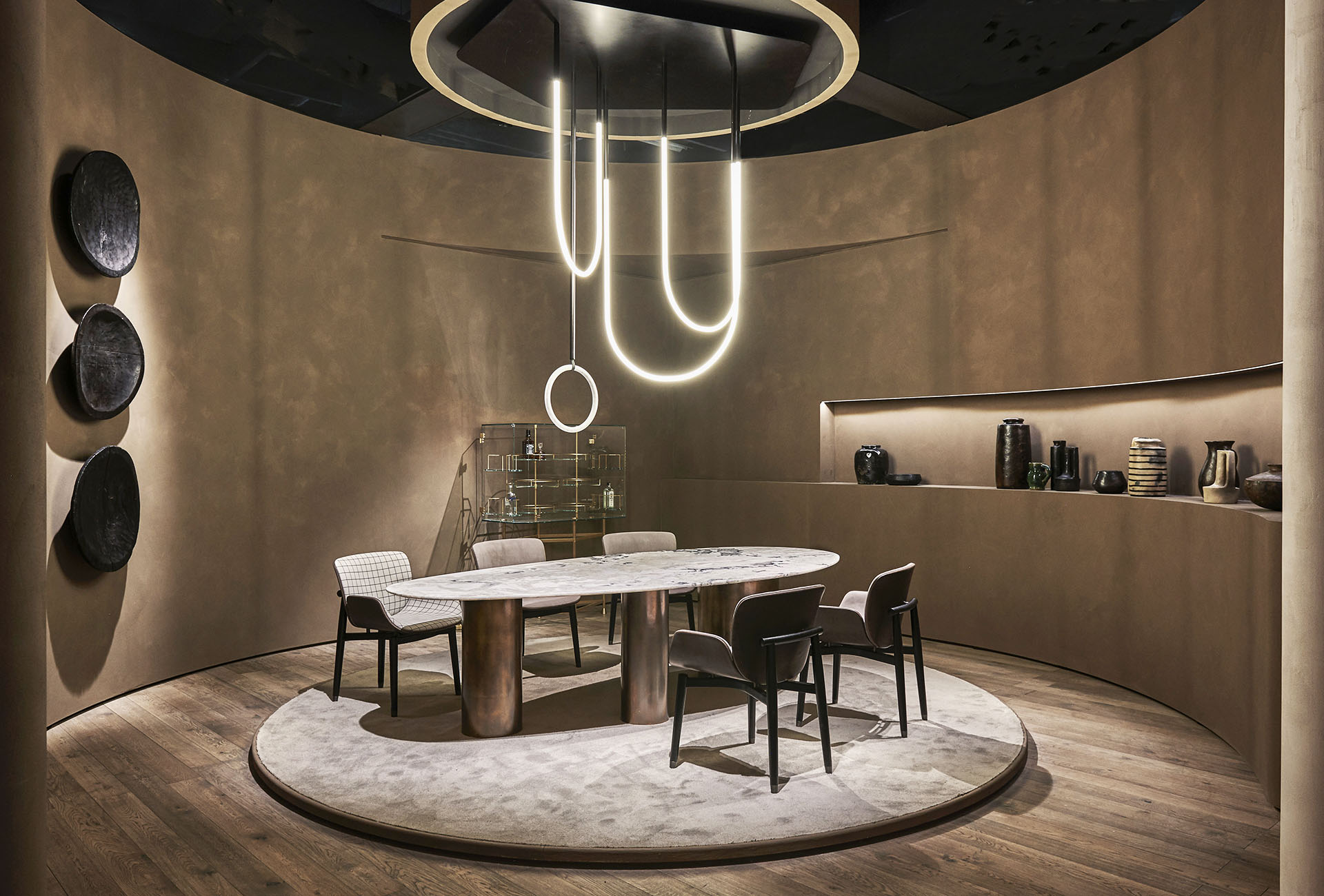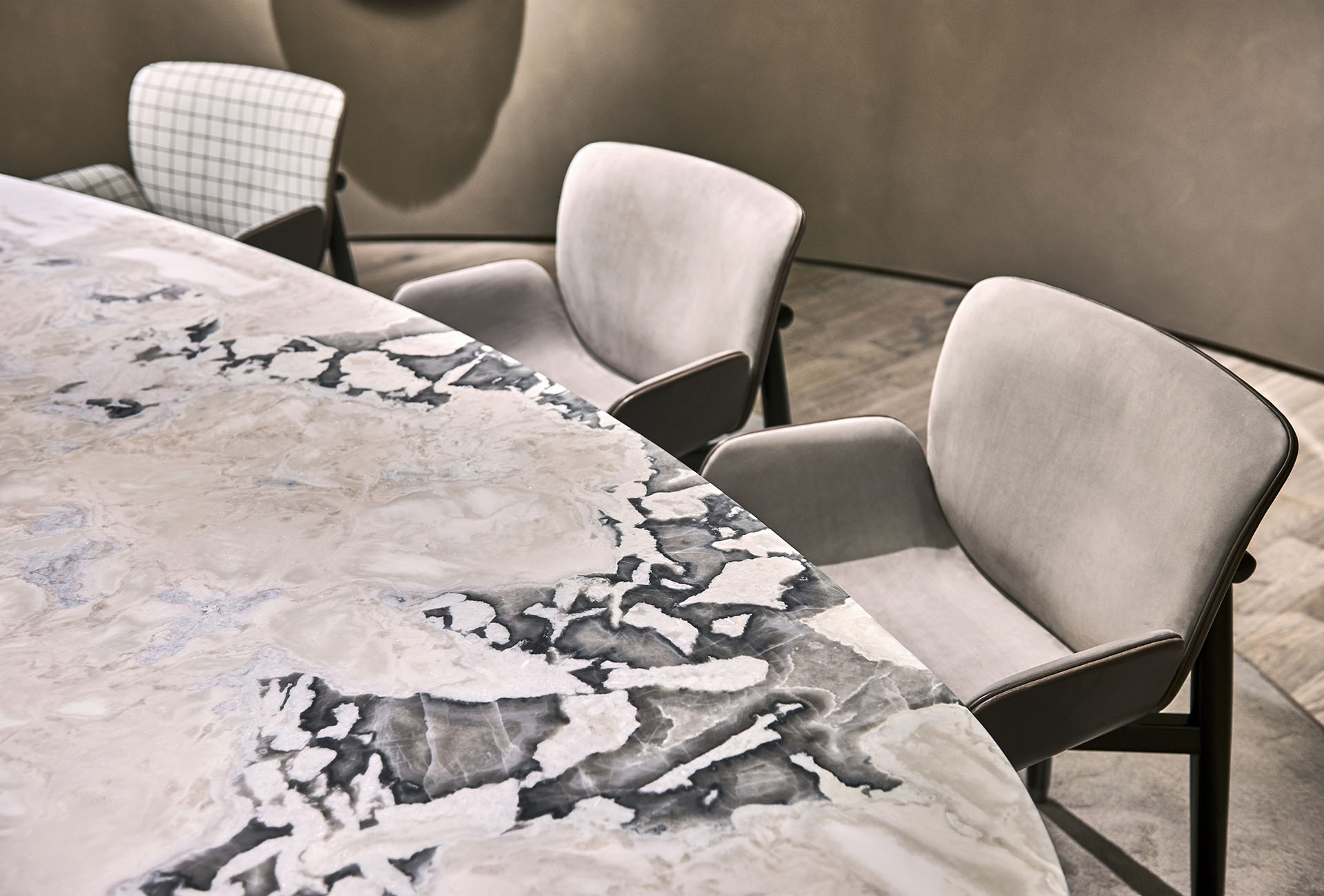 Cylindrical-shaped legs of different dimensions, carried out with a black-stained MDF structure, covered with antiqued brass or antiqued iron. Marble top with supporting bearing in varnished sheet metal. Marble top versions: Patagonia Granite (Special Edition available only for this table), Elegant Brown Marble, Geode Marble, glossy Gold Calacatta Marble, glossy Gioia White Marble.