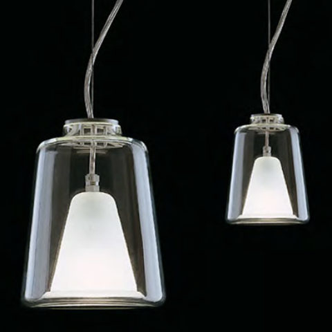 With their two lamps Lanterna and Lanternina, Marta Laudani and Marco Romanelli succeed in enclosing light in a casing made of air. The two different-sized models share the pure shape, composed of two bell-shaped Murano glass diffusers one inside the other: the first, transparent diffuser, hosts the second sand-blasted one, containing the light source.
