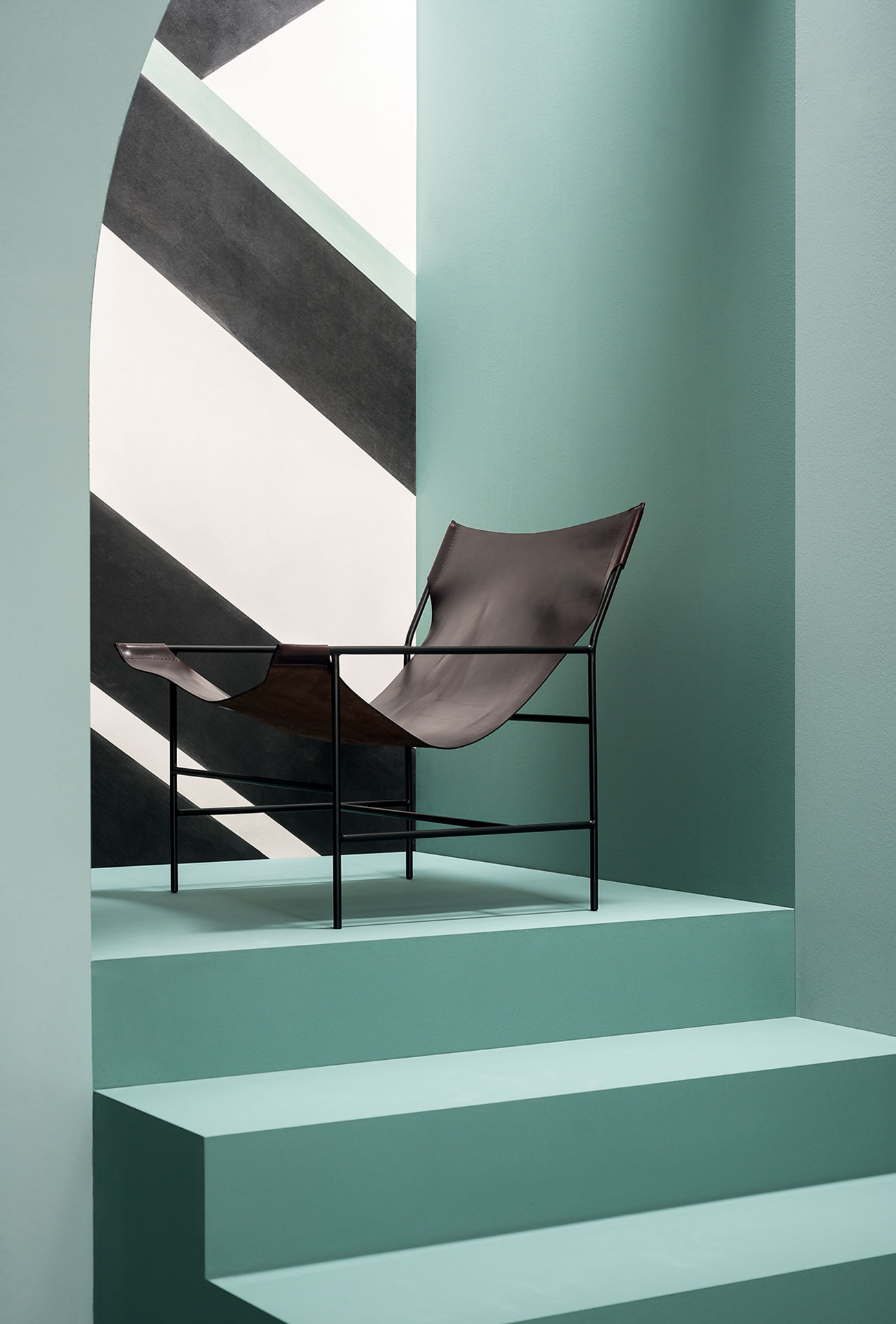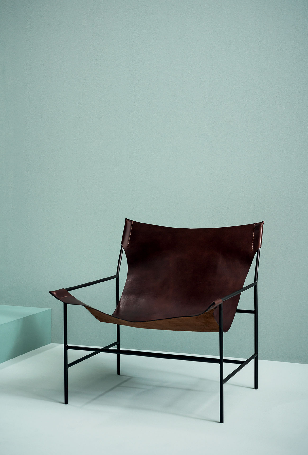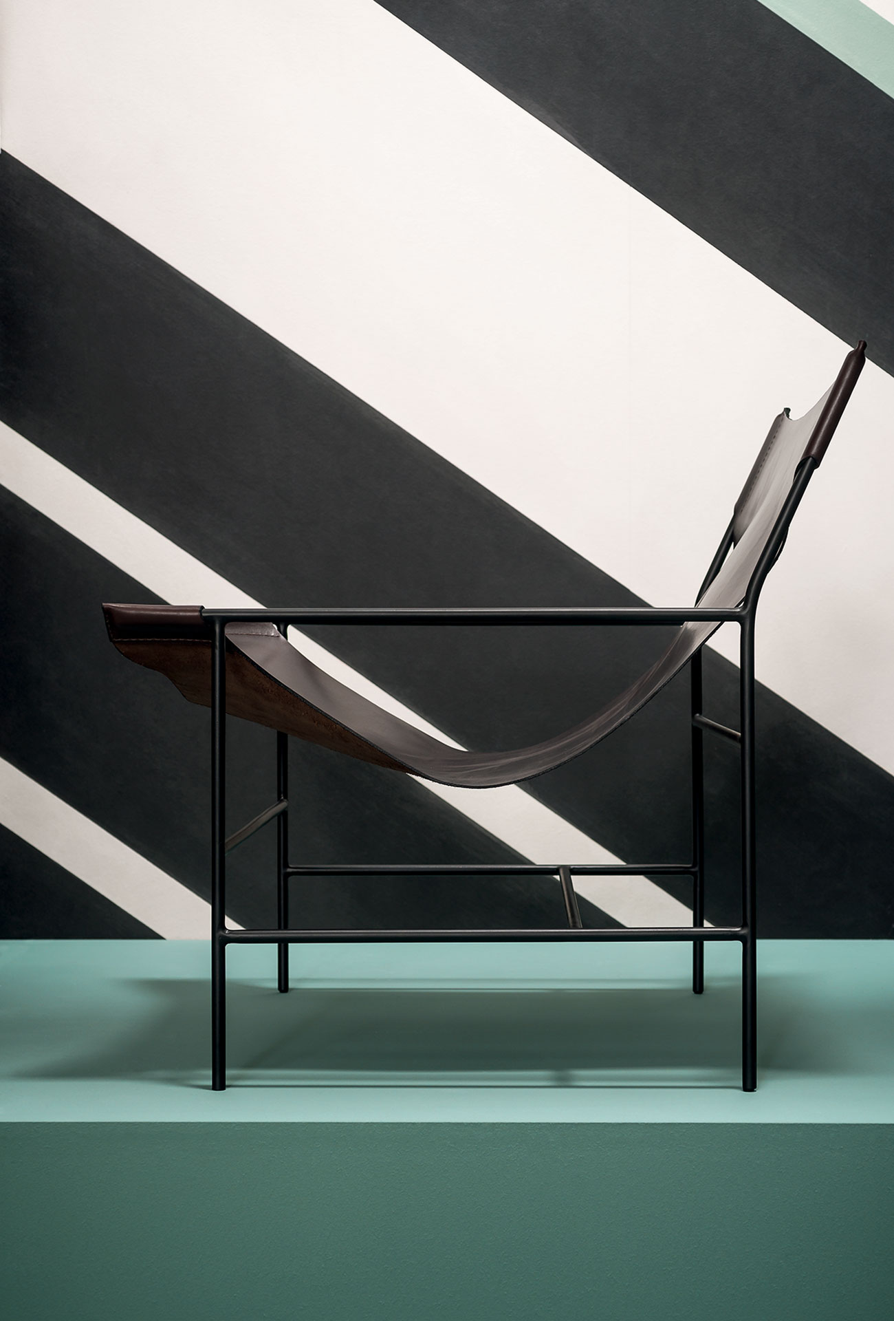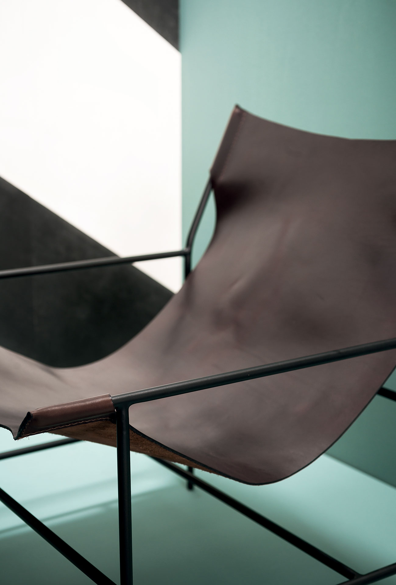 Frame in zinc-coated and matte black-varnished metal reinforcing rod. Available in Hydro and Pluvia leather only.