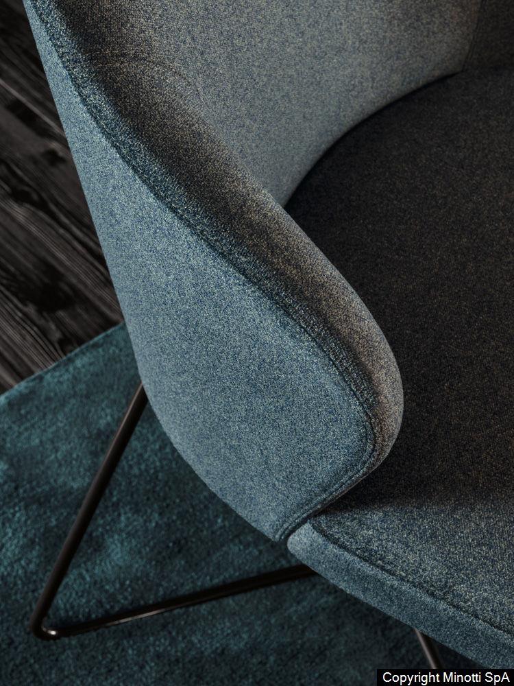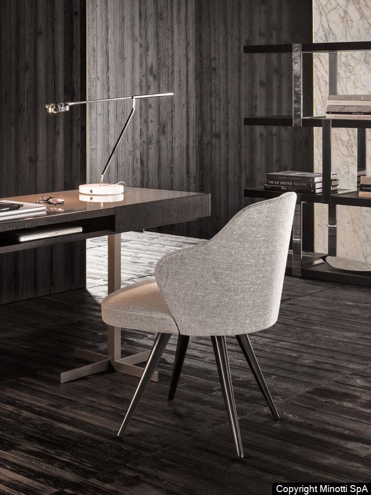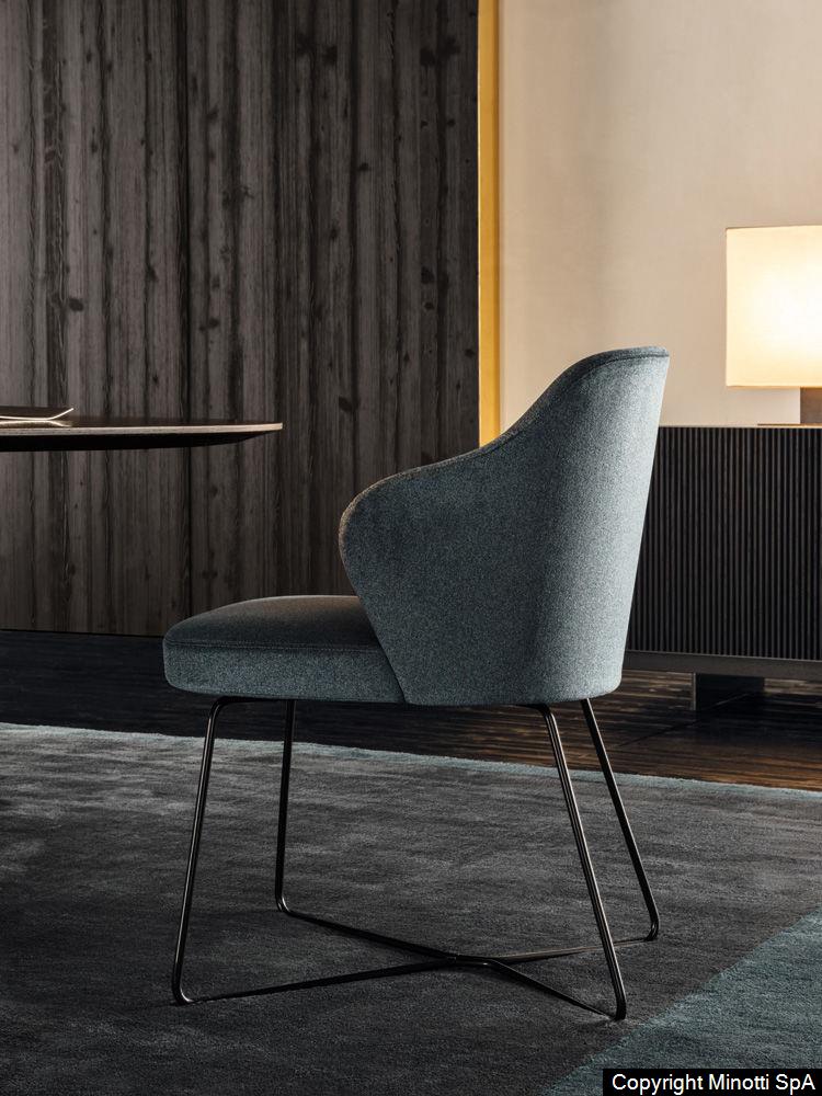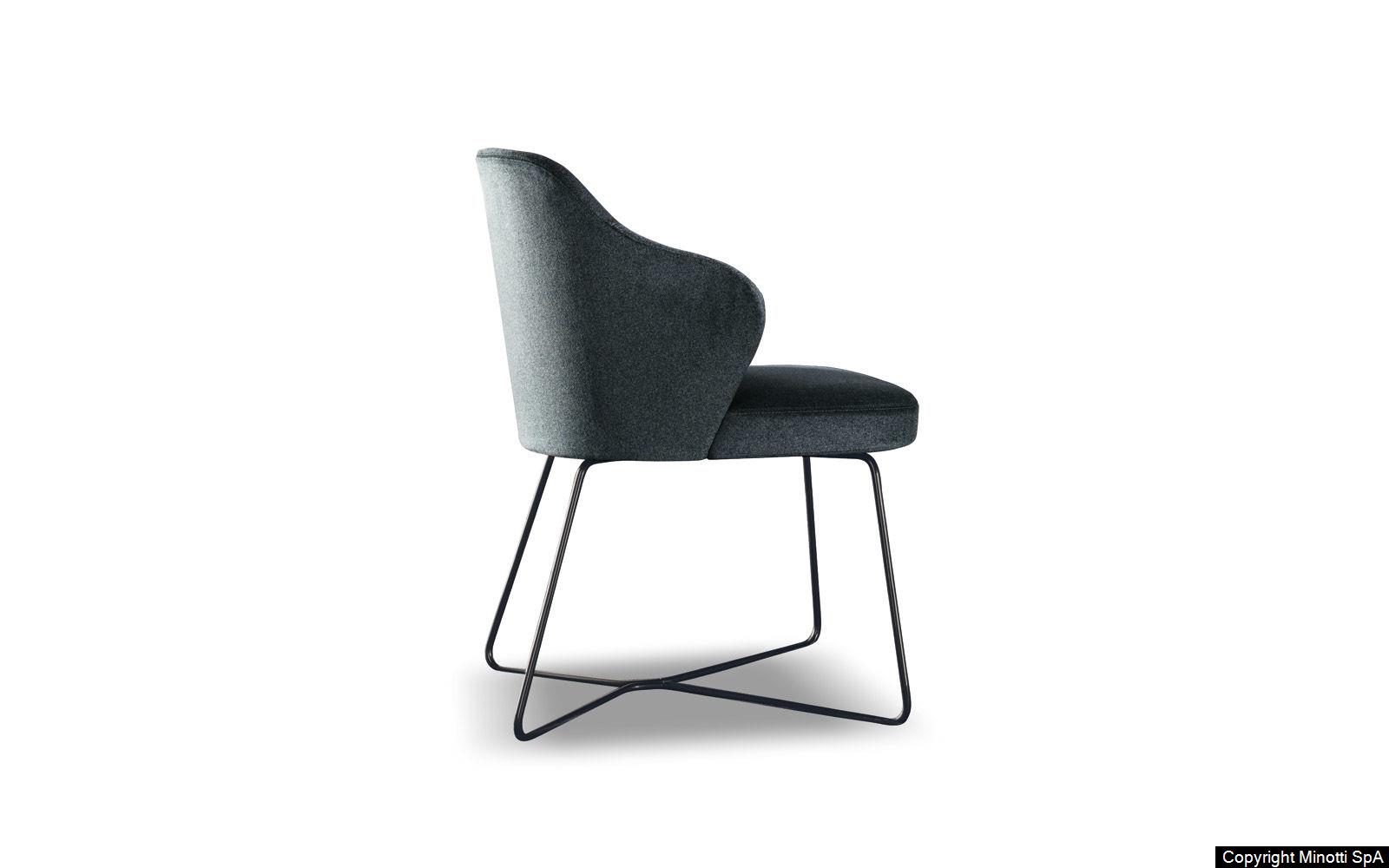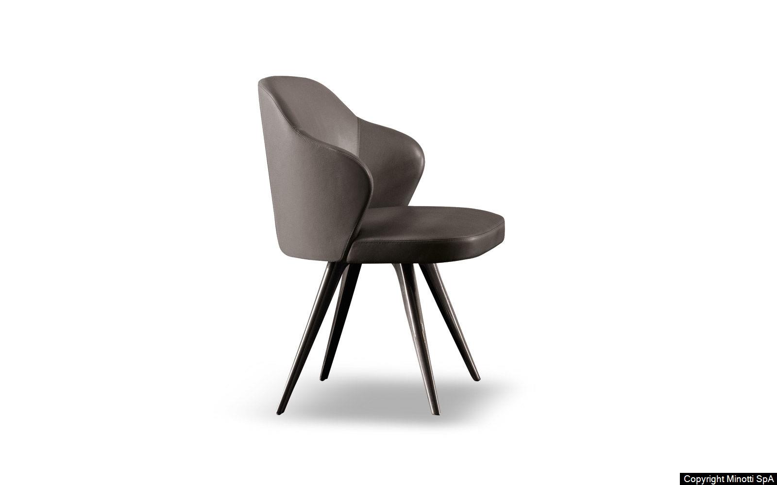 The Leslie “Dining” chairs echo the same soft, shapes and balanced proportions as the Leslie armchair. Leslie “Dining” features an enveloping backrest crafted from a cold-formed foam shell covered in soft padding. Its expertly-crafted tailoring ensures the upholstery fits like a glove. The Leslie “Dining” chairs can be covered entirely in fabric or leather, or with the backrest in fabric and the seat in leather for a tastefully-orchestrated contrast between the two materials. The Leslie “Dining” chair comes in three versions: with base in painted Pewter-color steel wire, or with painted Pewter color, cast aluminum legs, or in a swivel base version that also rests on painted Pewter-color cast aluminum legs.