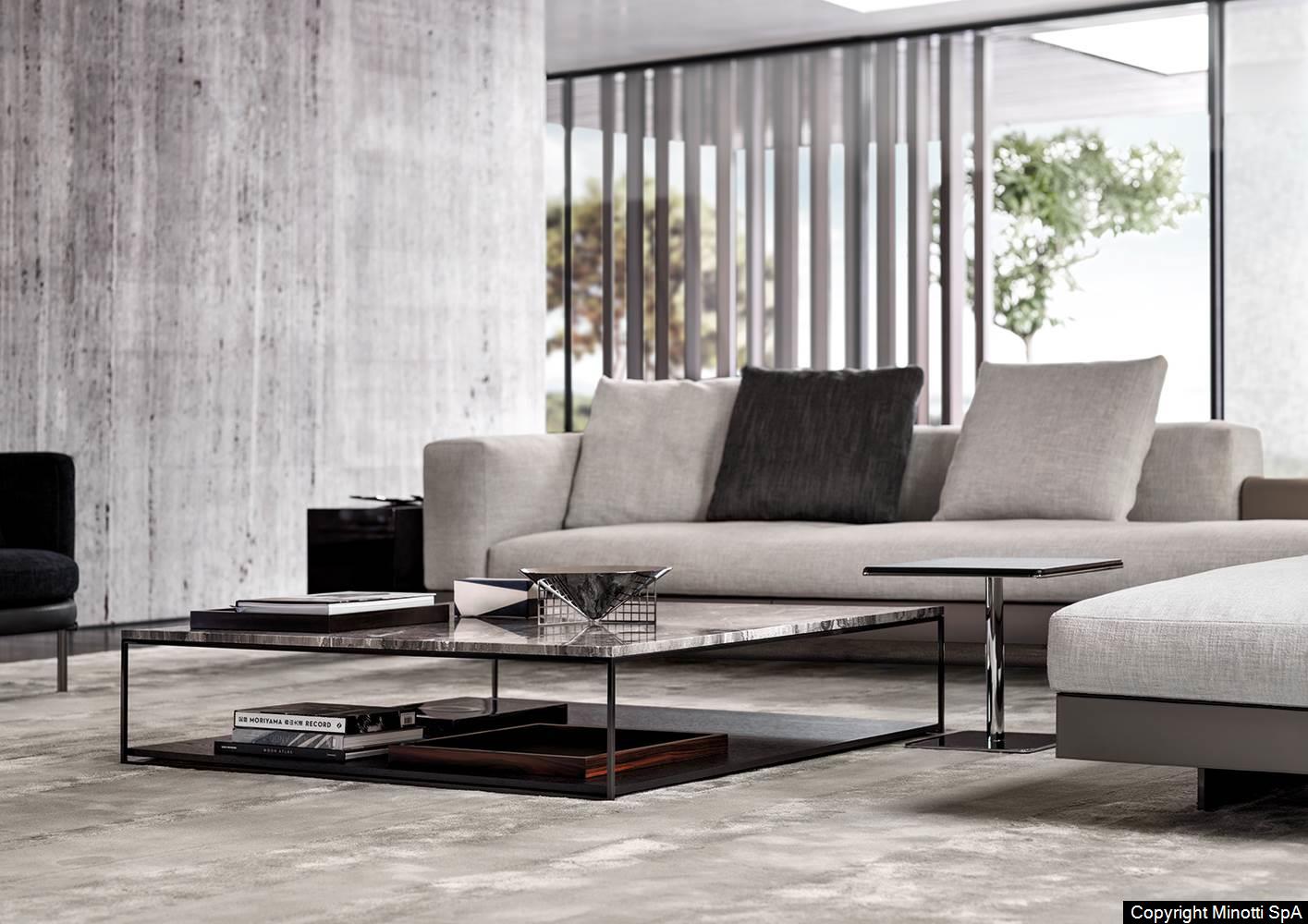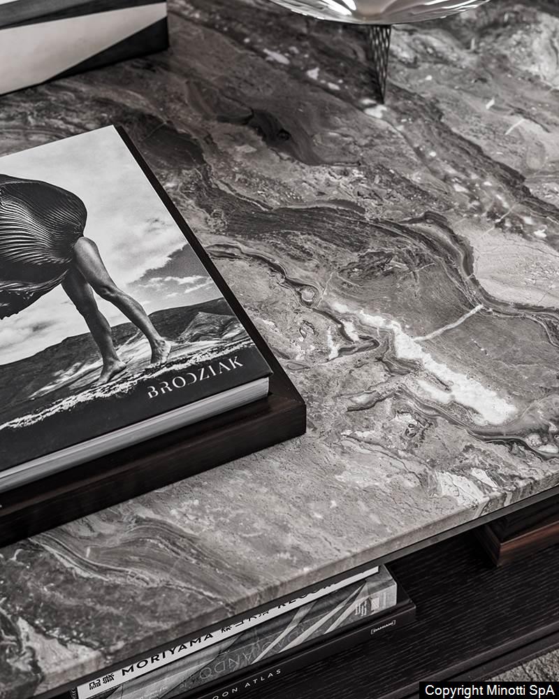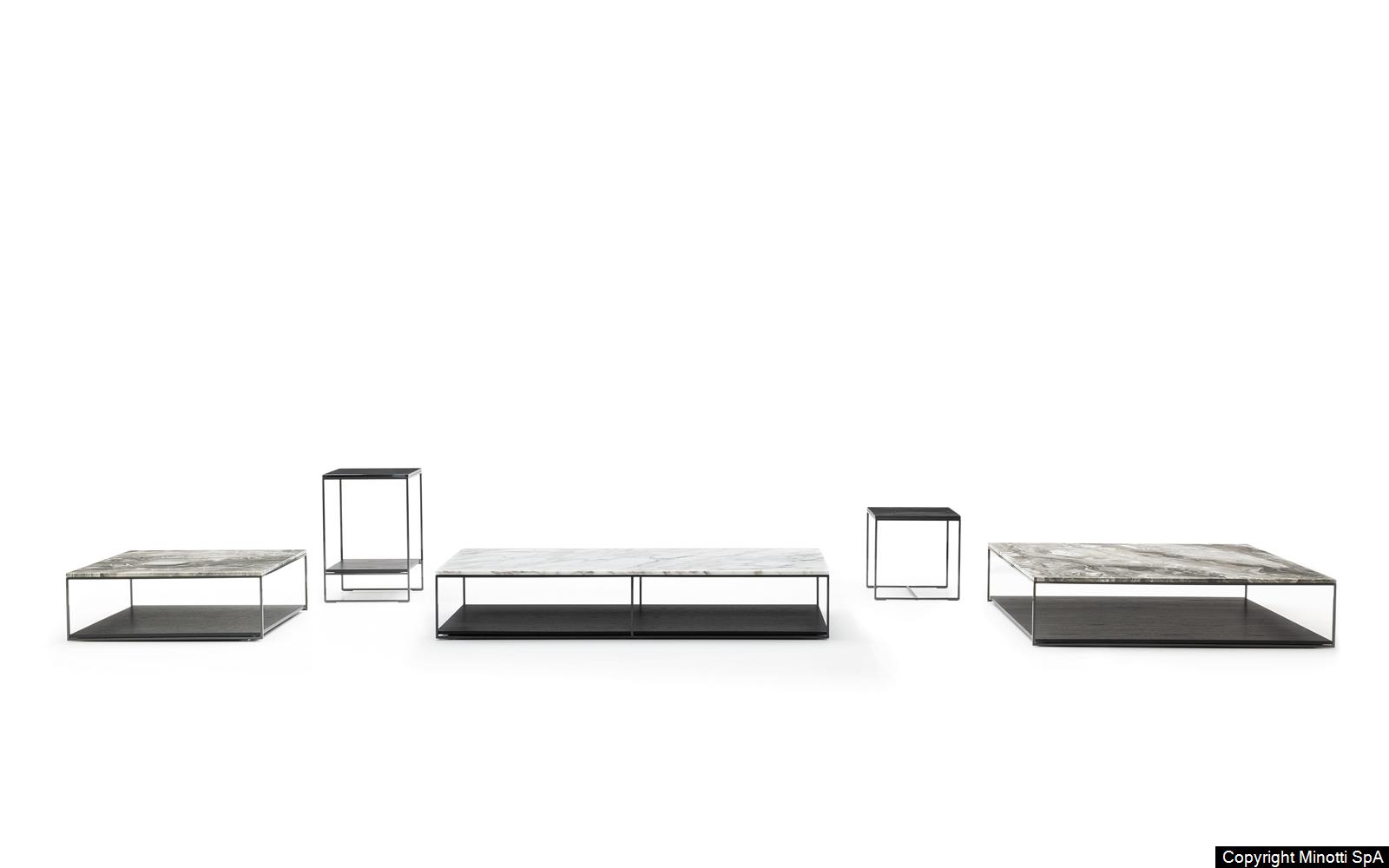 The family of Liam coffee tables is characterized by the airy 1 cm square steel structure, which designs a lightweight volume, defined by a polished Pewter colour finish. It hosts a top in Calacatta marble, Grigio Orobico marble, Black pâte de verre glass or brushed oak with Moka colour lacquer finish. In some elements, it also accommodates a lower, wooden surface for holding books, magazines and objects, also in brushed oak with Moka colour lacquer finish.