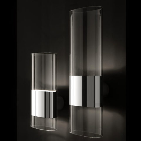 The Line wall lamp uses the special oval Pyrex glass to portray an essential, minimal image, yet at the same time which is strongly characterised. The generous size, the importance of the material, the partial polished aluminium coating, the existence of two light sources that diffuse the light both upwards and downwards, make Line a versatile product.