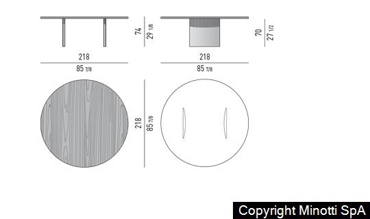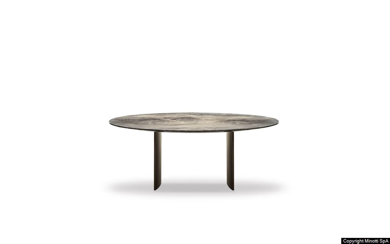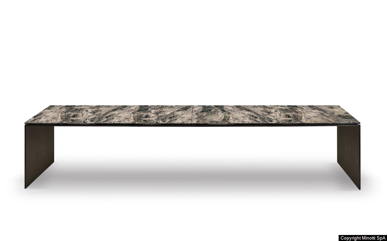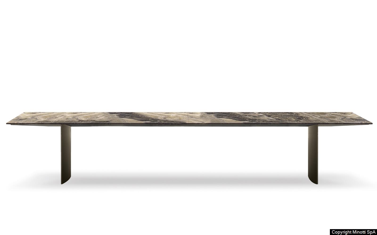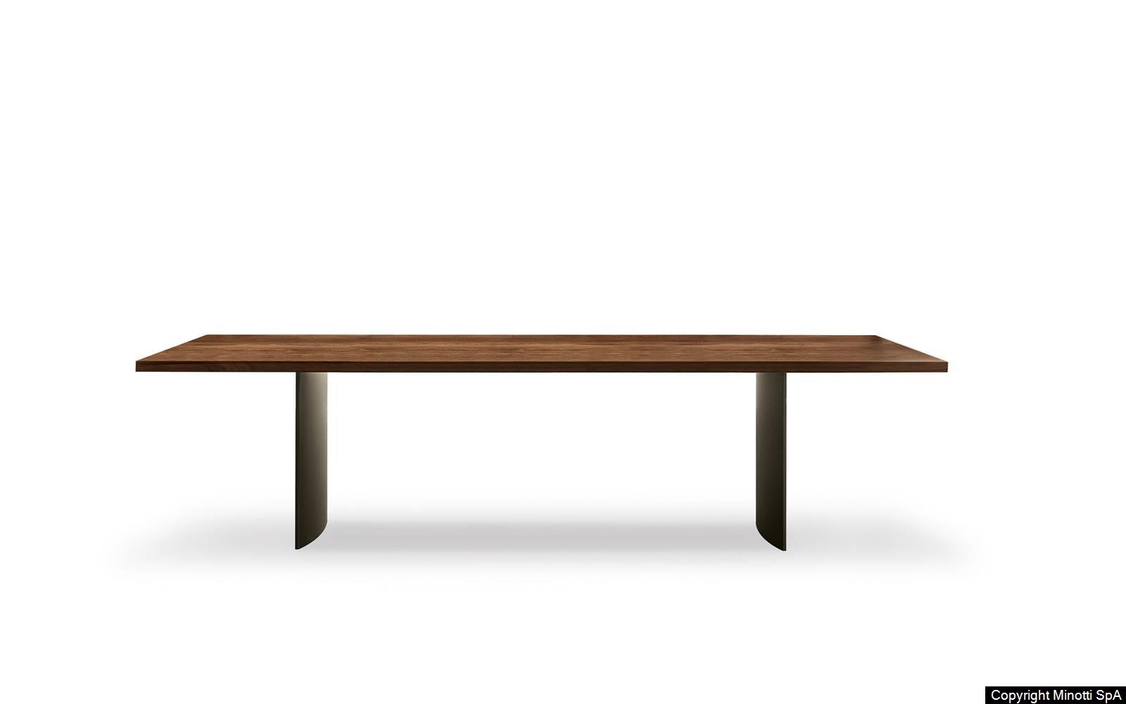 In the more sculptural version, the structure designs a bridge, with the top being flush with the sides, whereas in the other tables the blade-like legs, with the section curved on the inside, are set back from the top.