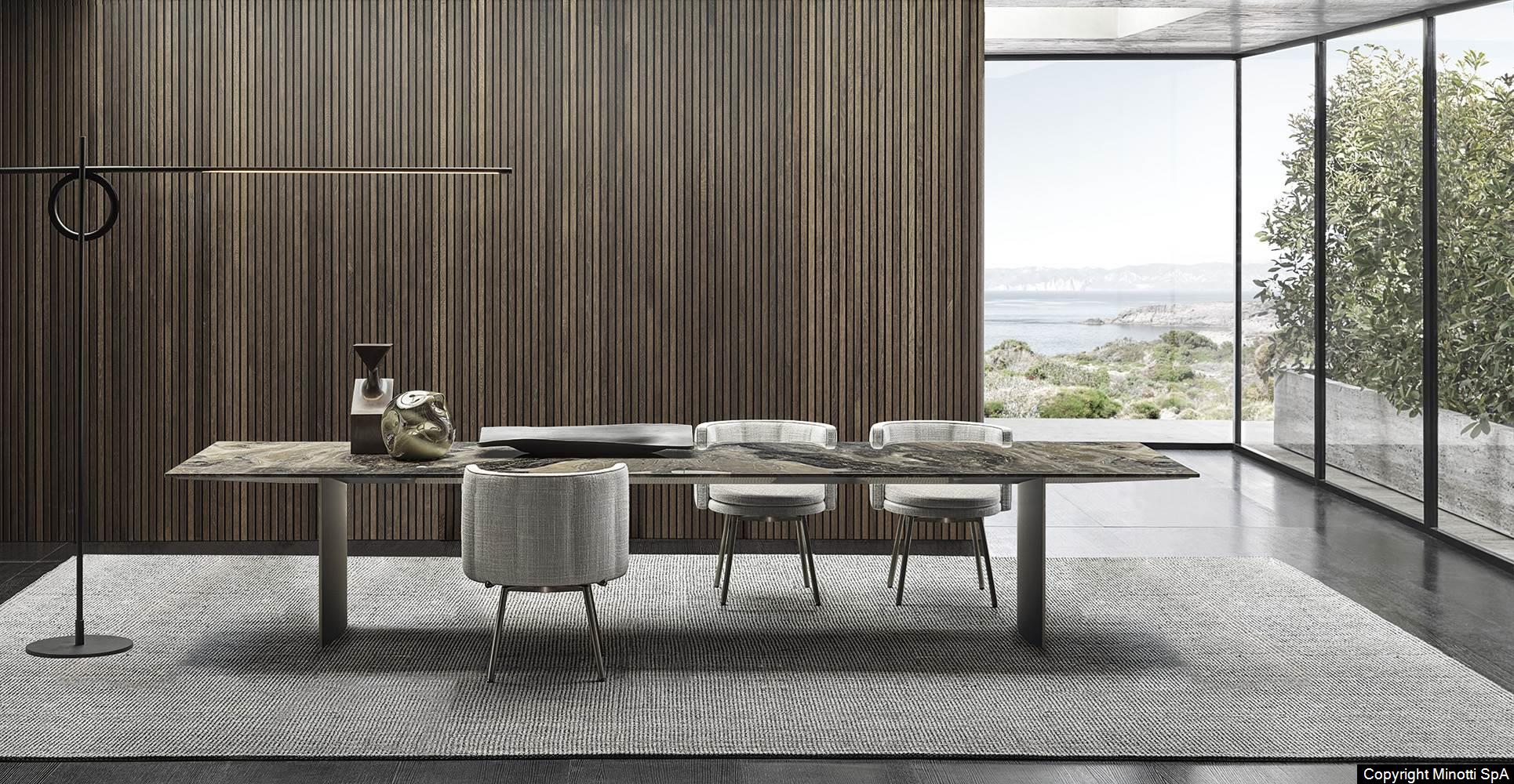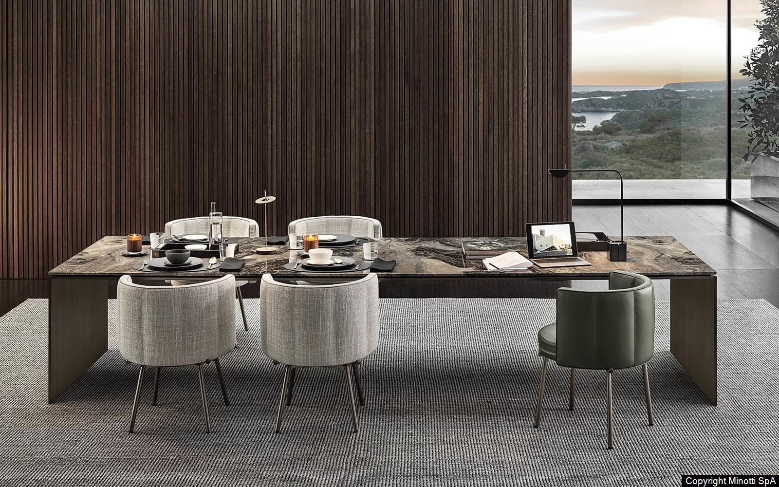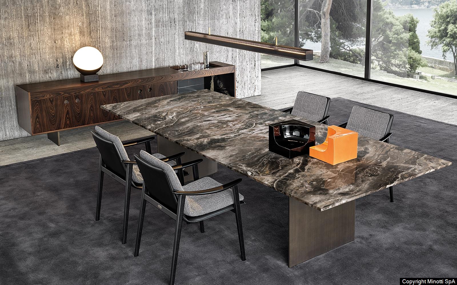 Linha, or “line” in Portuguese, is his response to the challenge of designing a dining table with a large span, a structure only 16 mm thick and a top that can reach up to 4 metres in length. Visually, it appears extremely lightweight and airy, despite the strong impact of the materials used, in which marble boldly takes centre stage.