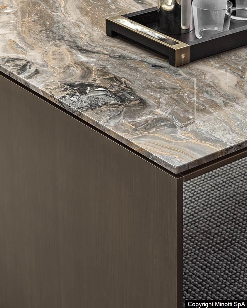 The stratified bearing structure with matt black lacquered finish features aluminium sides with Golden Brown finish and a top in Grigio Orobico marble.