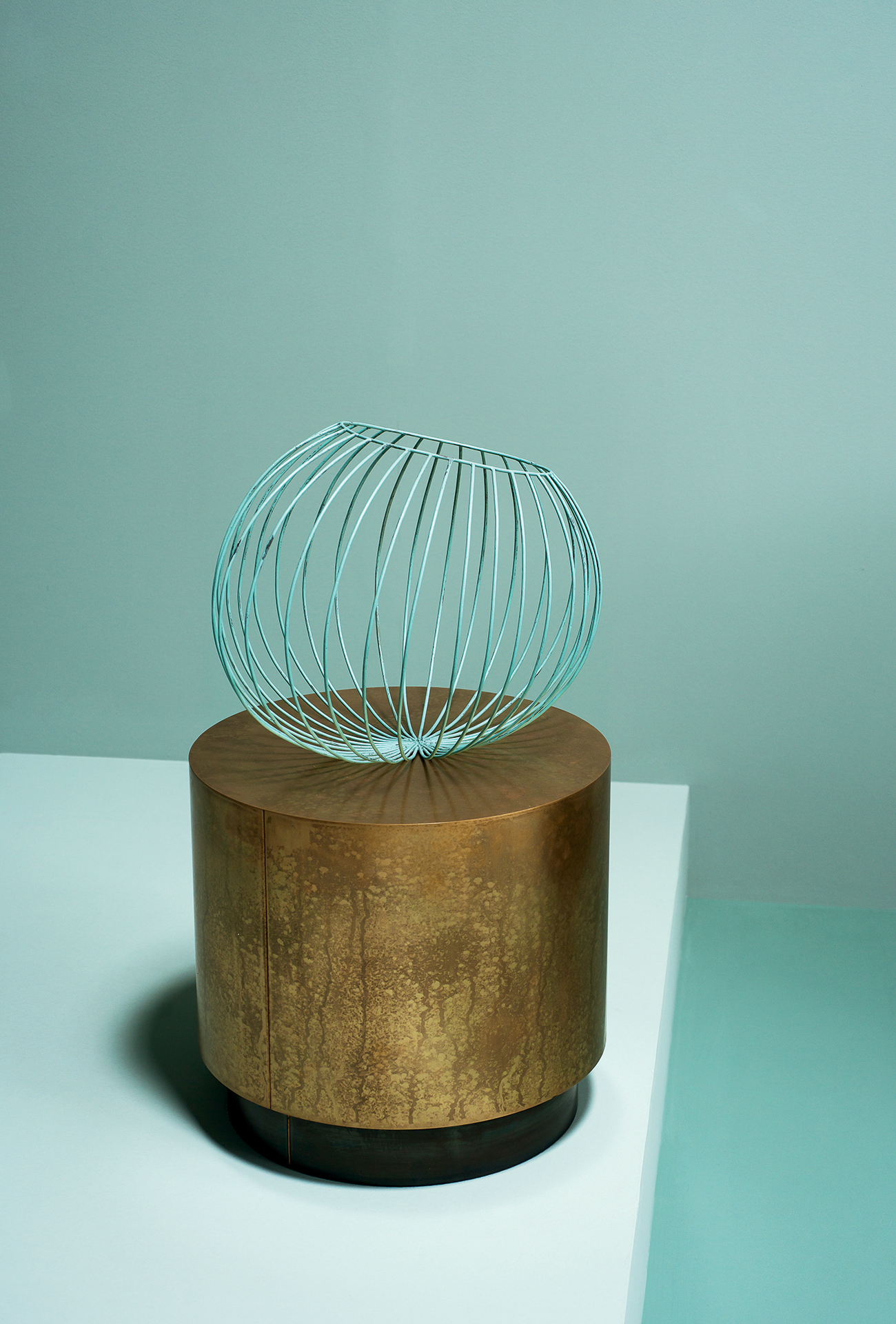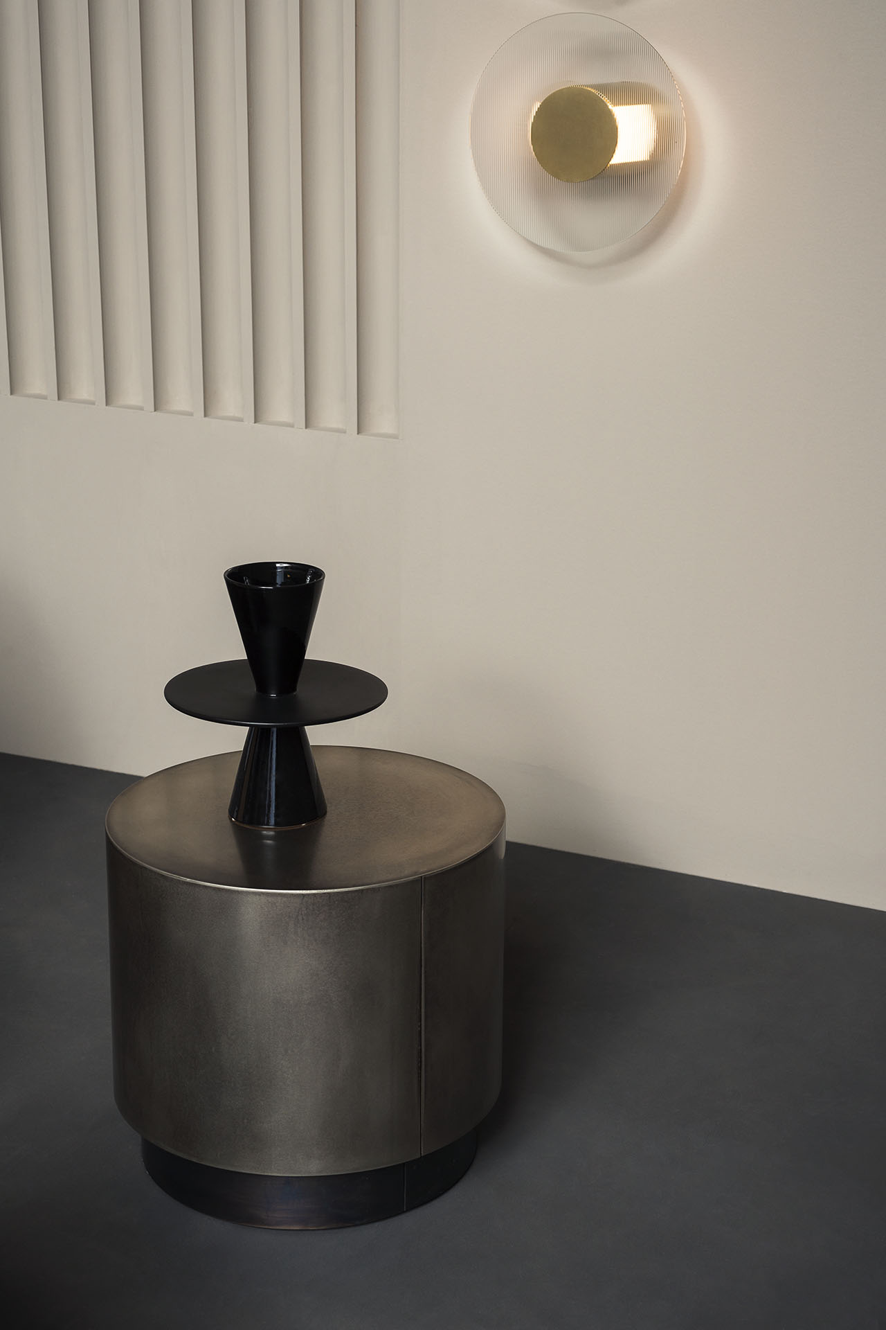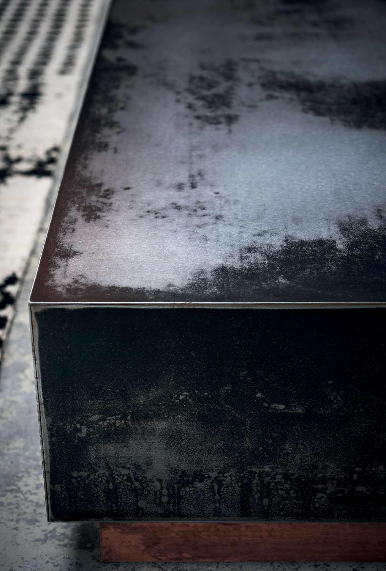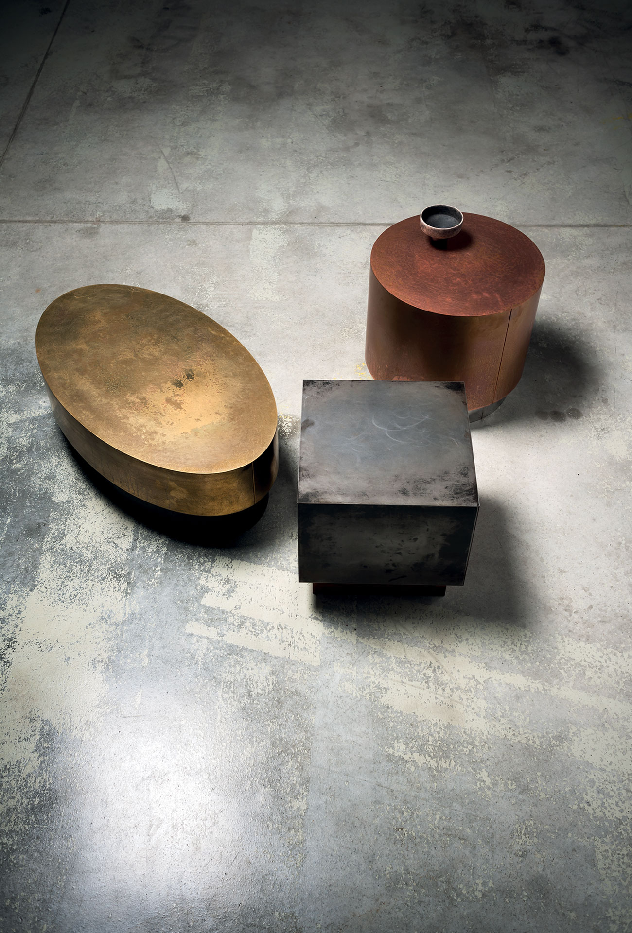 Availables in four different shapes and in three different finishings: top part in antiqued iron with semi-gloss antiqued copper base, in matte antiqued copper with glossy chromed steel base, in antiqued brass top with burnished brass base.