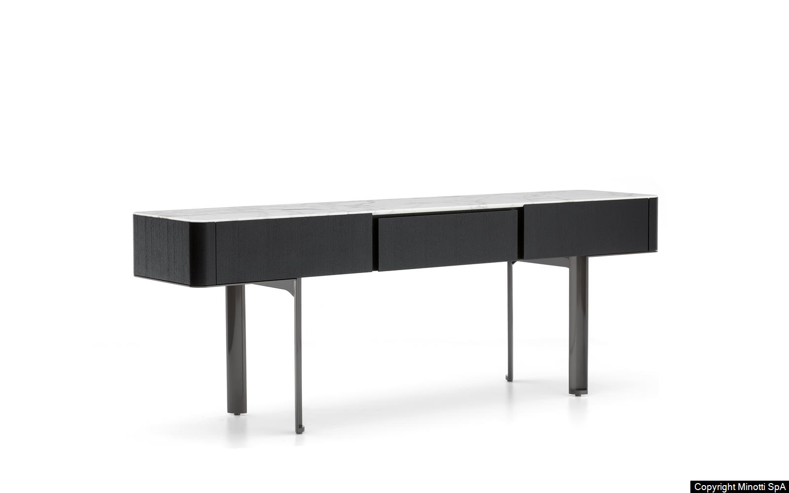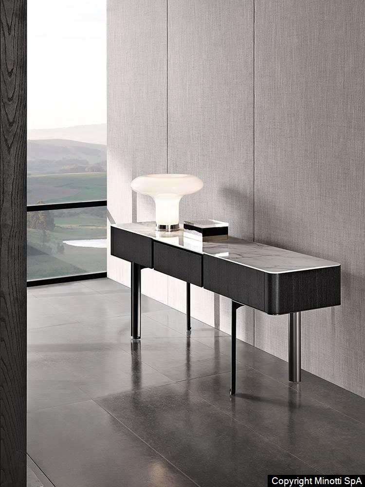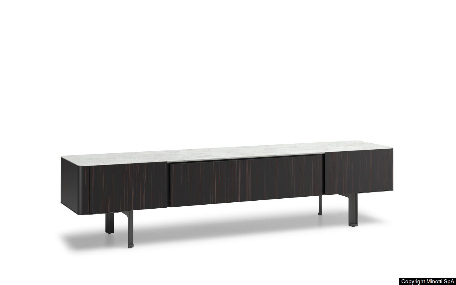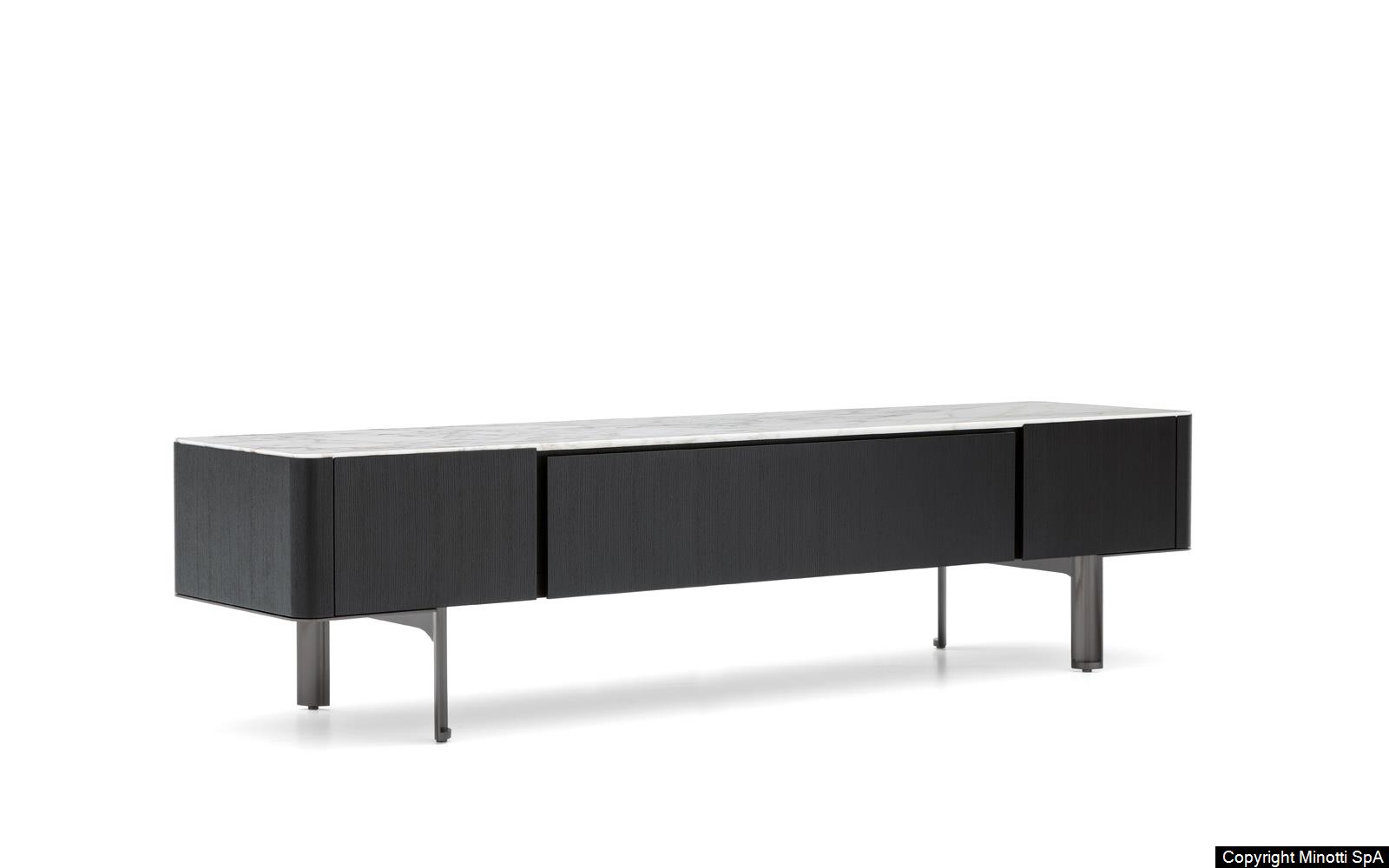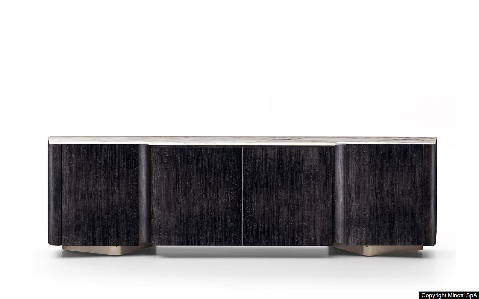 Synonym of refined cabinet-making and high-end technology, they have in common the preciousness of the materials, from the brushed ash or the opaque ebony of the structure to the Calacatta marble or the flush-fitted tops in wood matching the colour of the structure, to the glossy painted metal base.