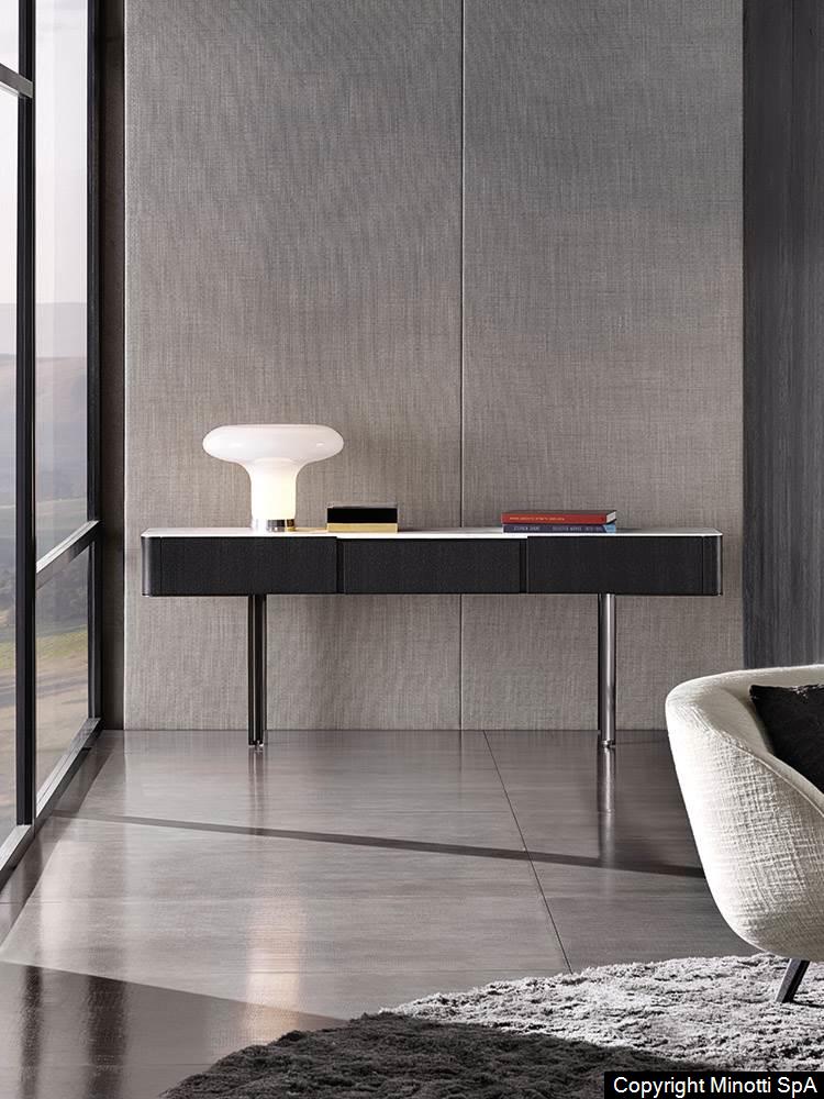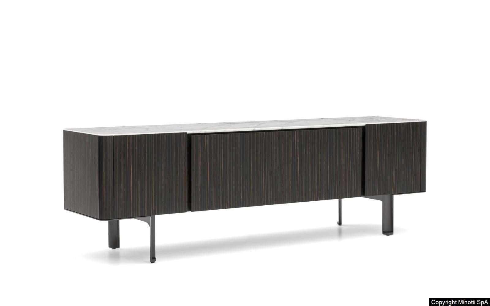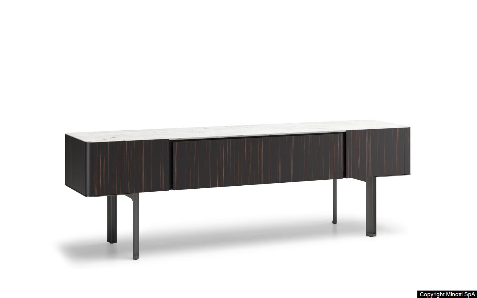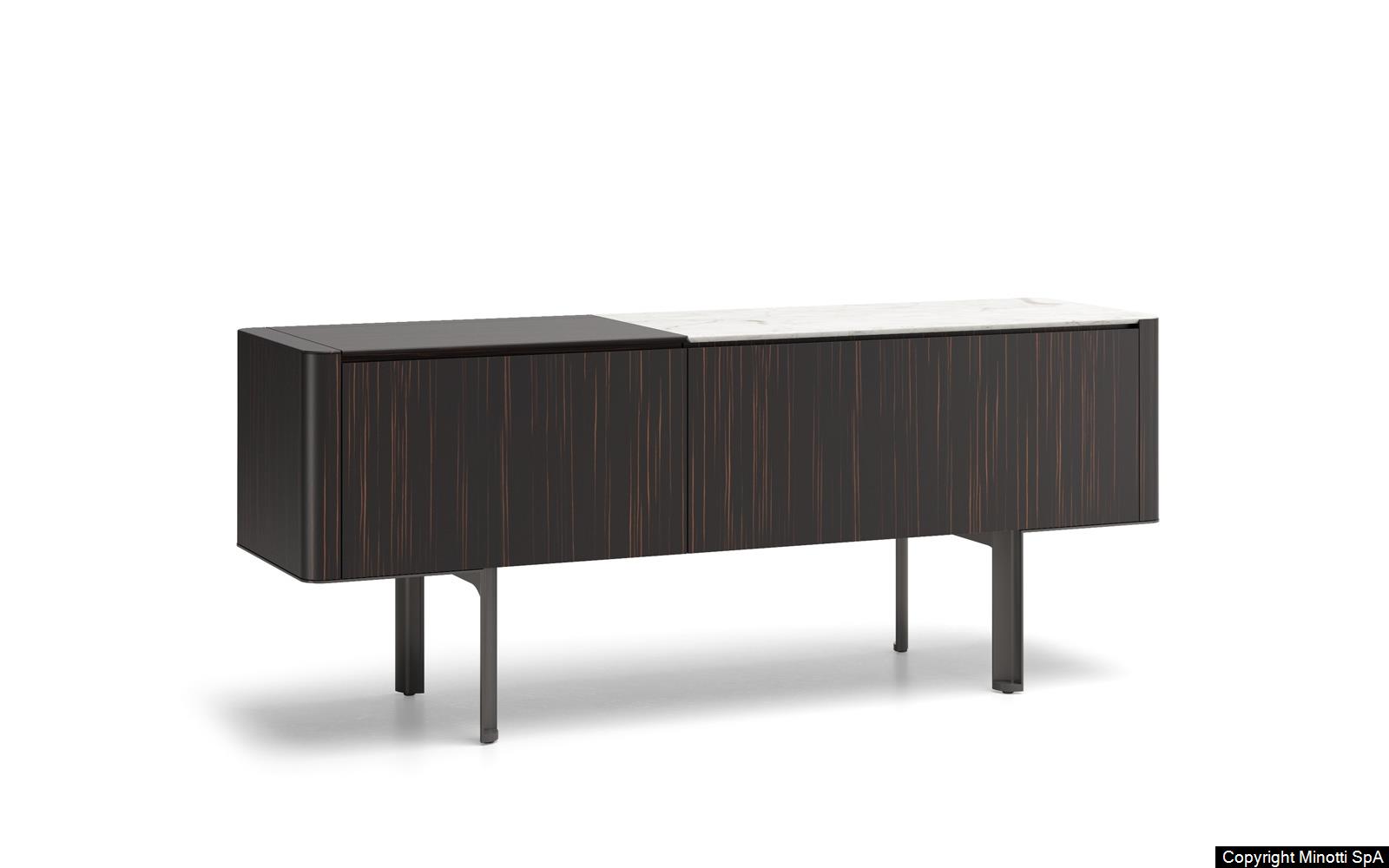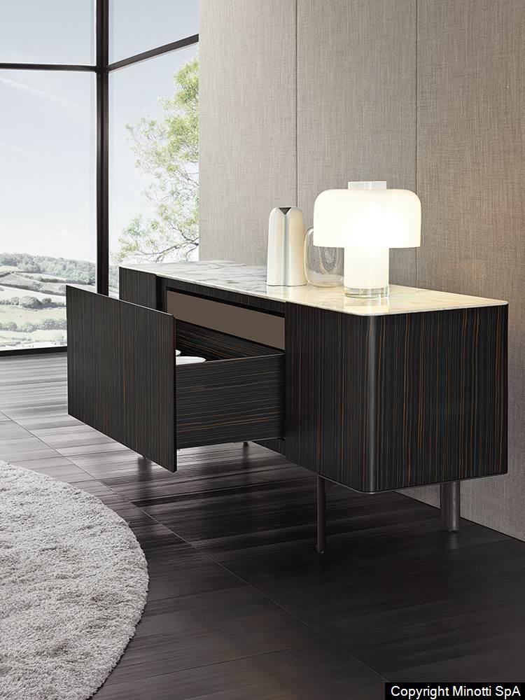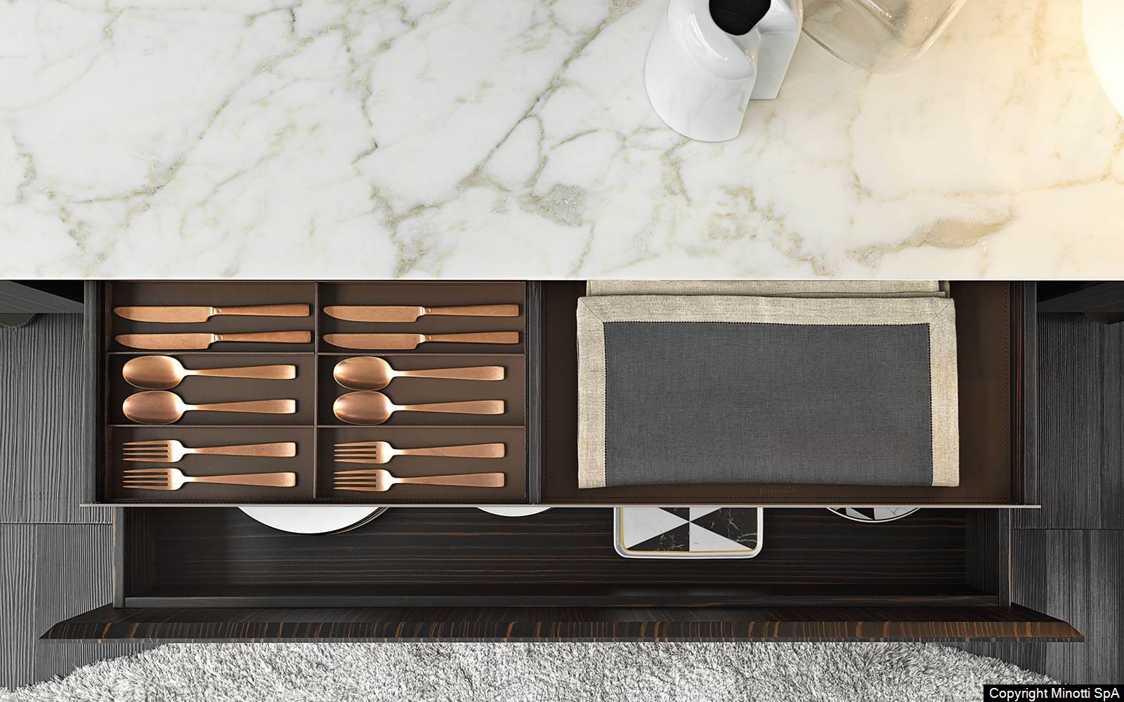 Synonym of refined cabinet-making and high-end technology, they have in common the preciousness of the materials, from the brushed ash or the opaque ebony of the structure to the Calacatta marble or the flush-fitted tops in wood matching the colour of the structure, to the glossy painted metal base.