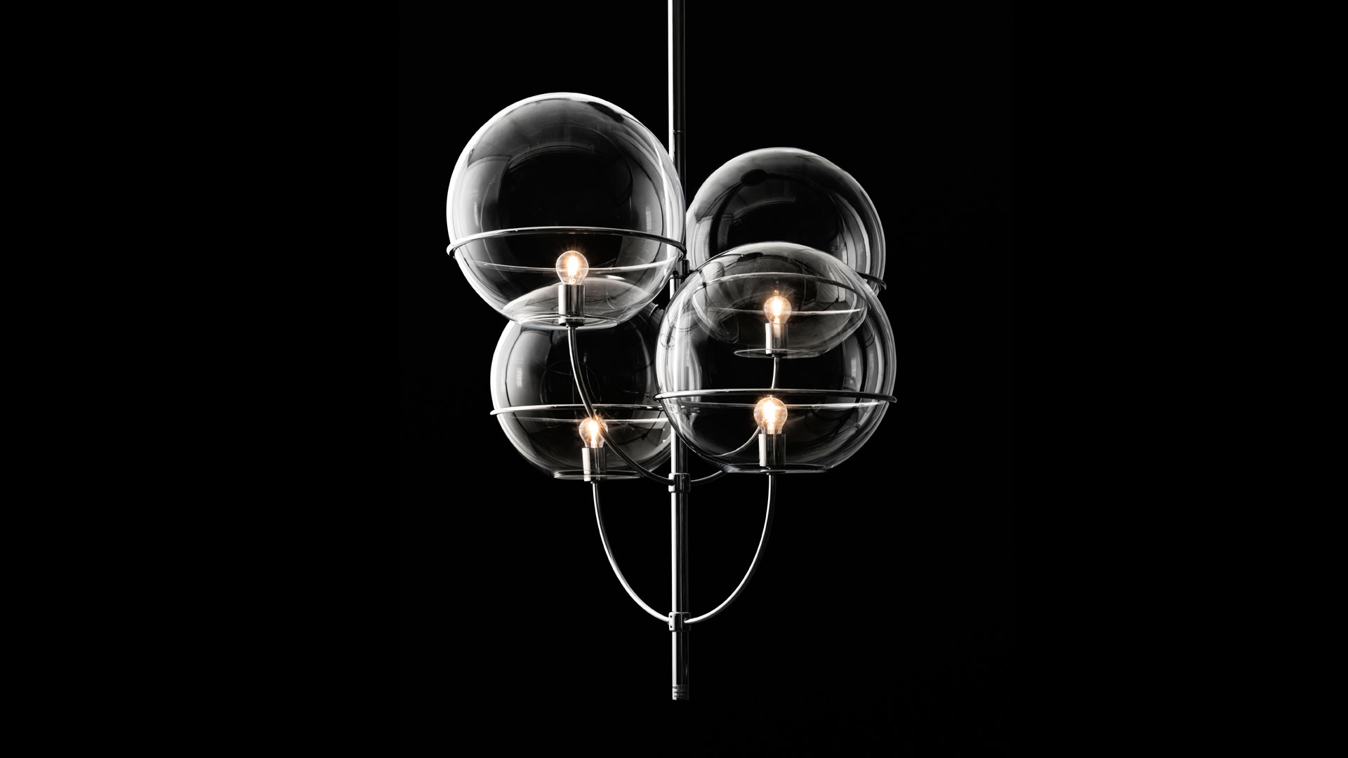 The chrome-plated finished candelabra-style body, typical of the family of lamps designed by Magistretti, can, from time to time be bent according to the required use of the lamp, extending to enclose the transparent glass spheres, inside which the light bulb is hosted.
