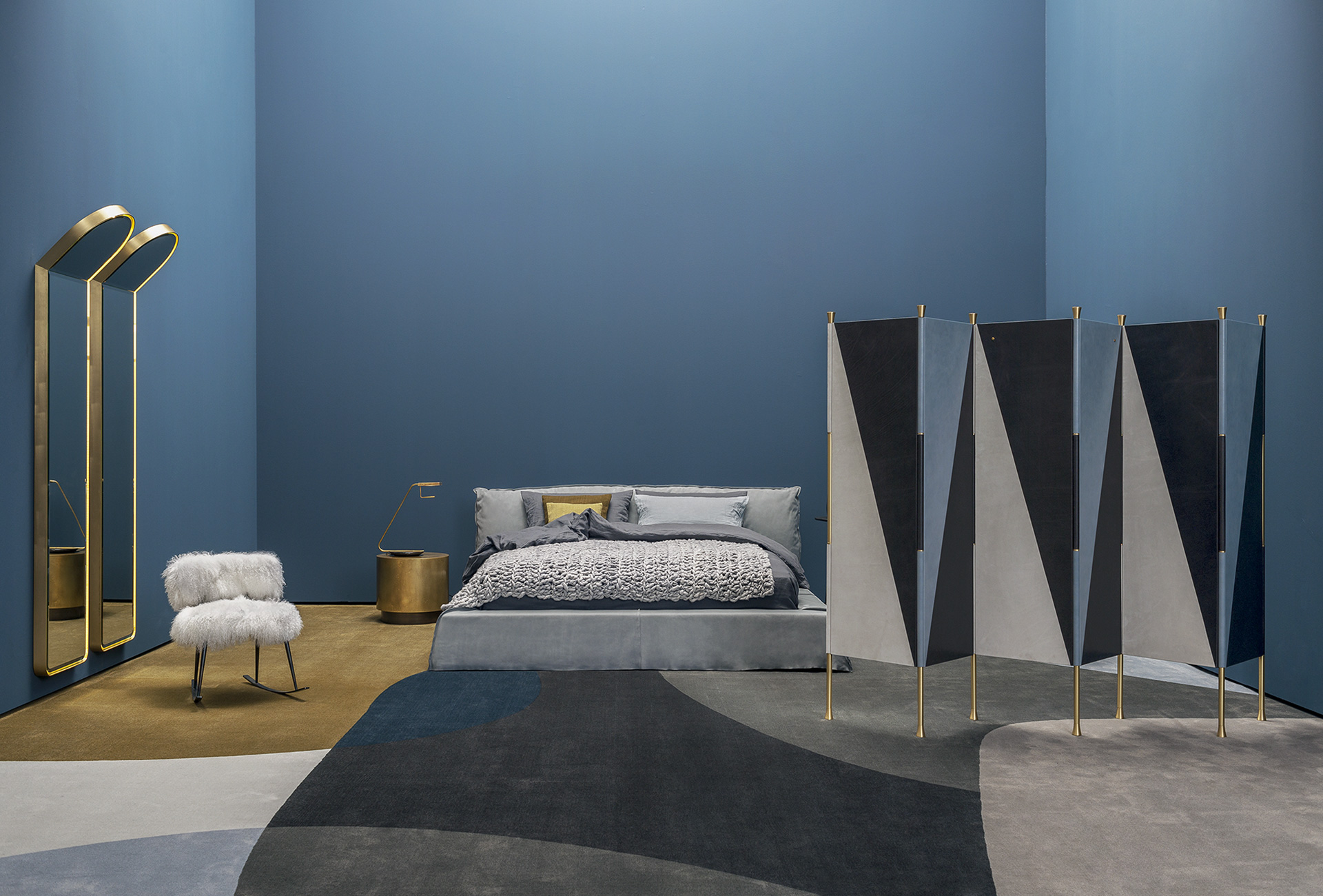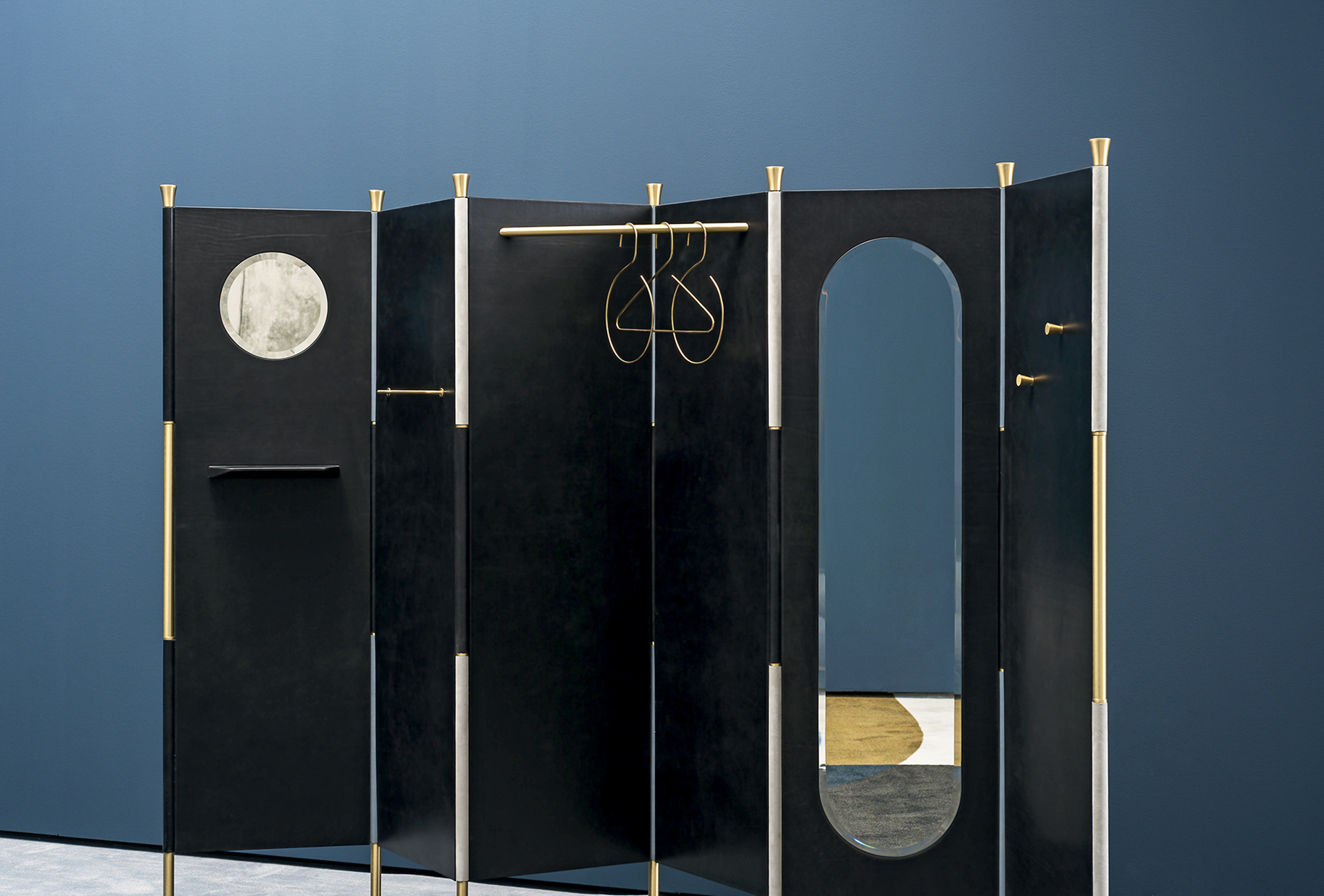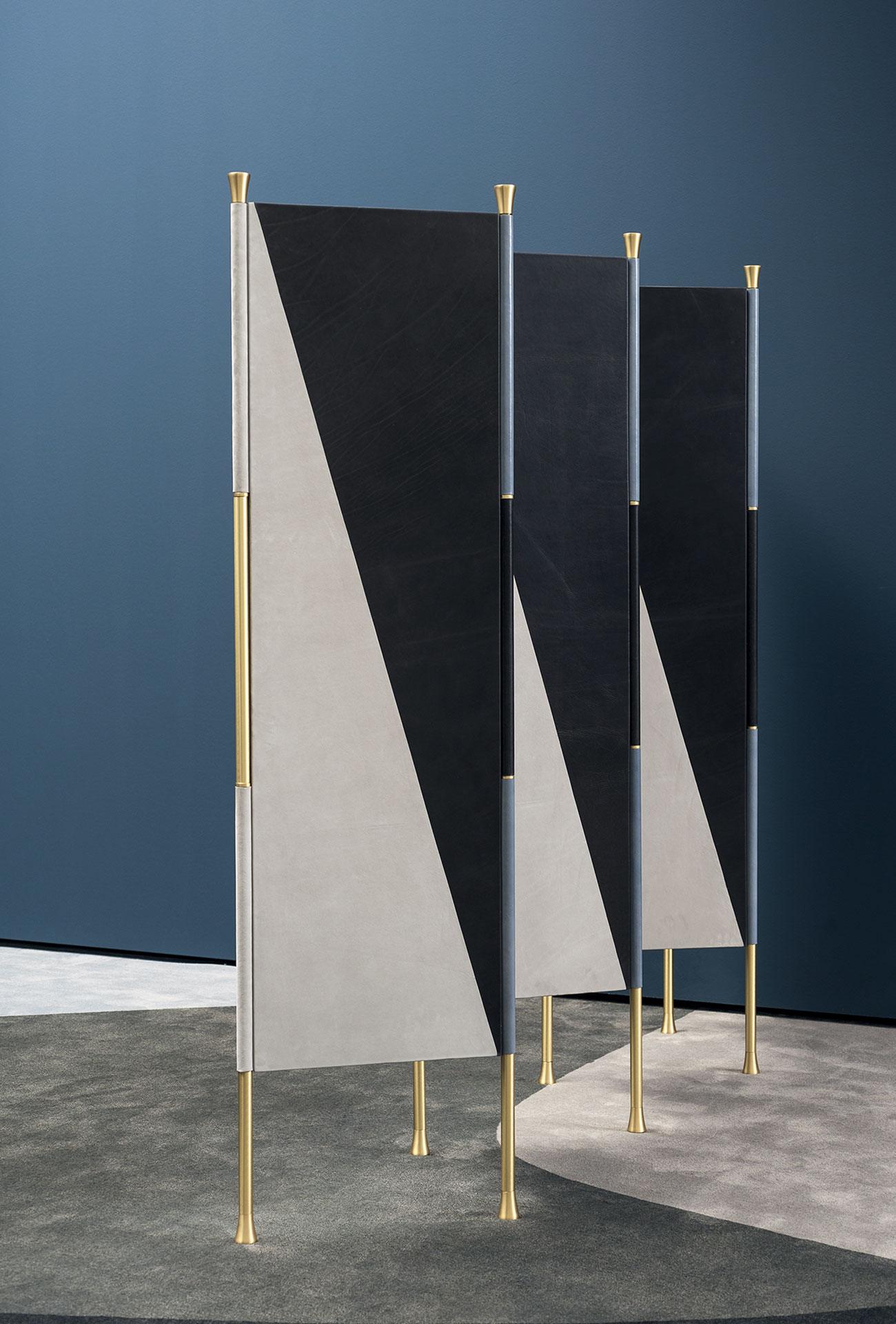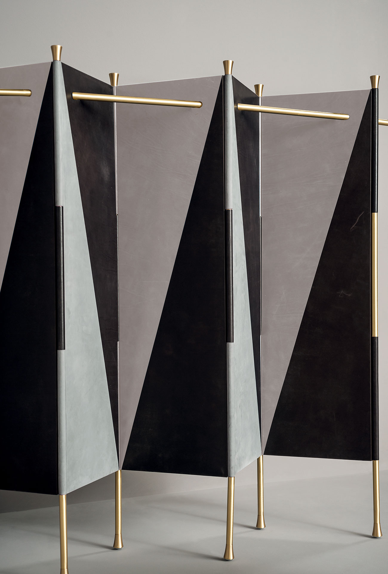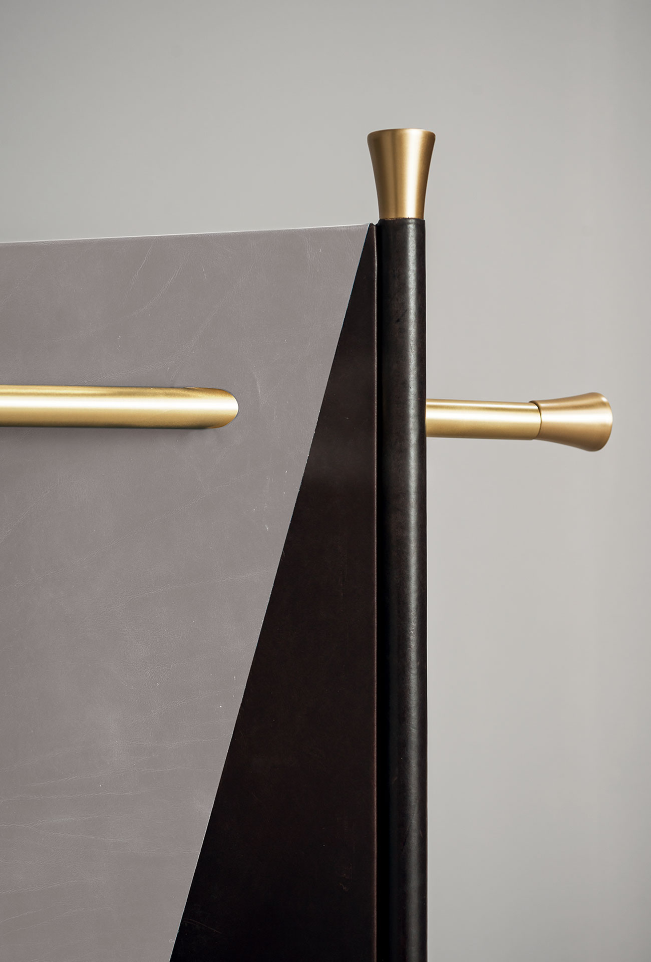 Tubular satin brass frame. Panelling with 4 or 6 modules in birch multilayered wood, matched with the aluminium leather-covered thin layer.