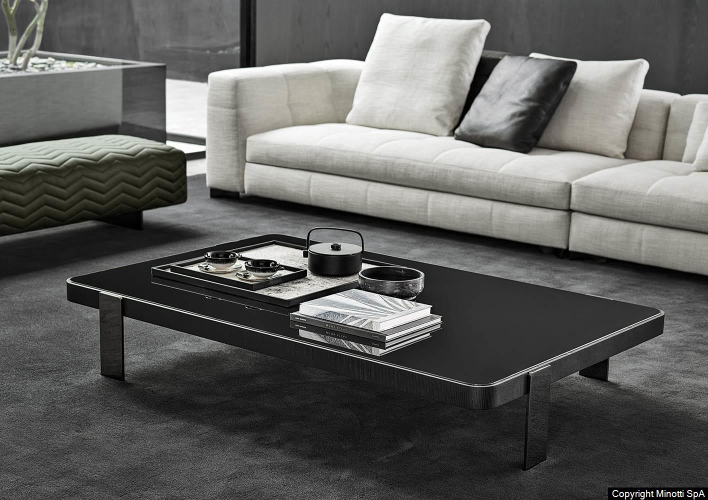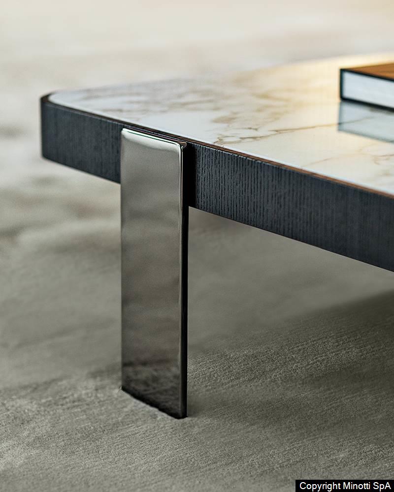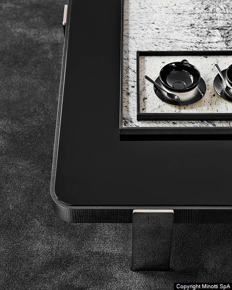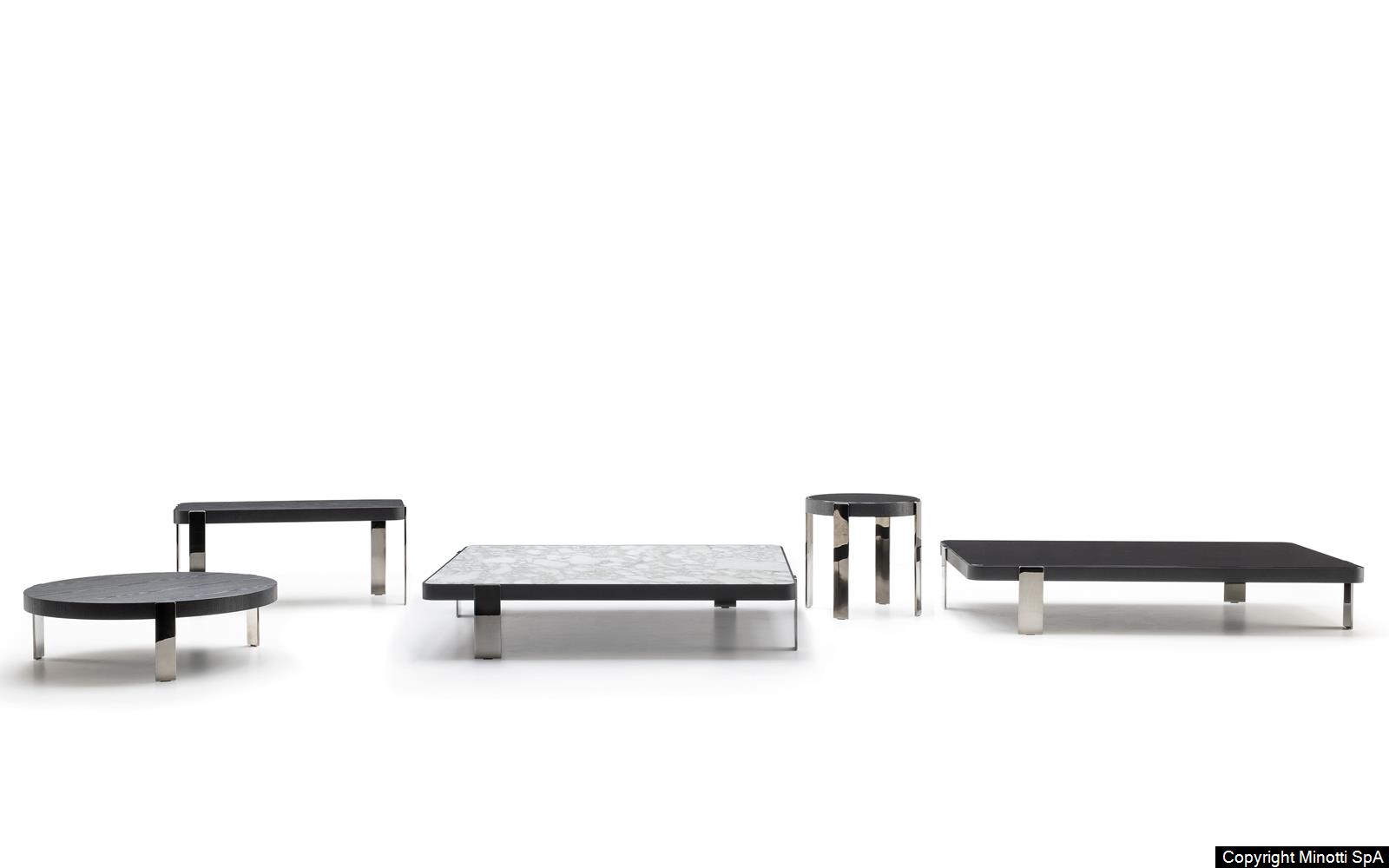 A series of round, rectangular and square coffee tables in different sizes and heights, available in three versions: with top in Calacatta marble or Black pâte de verre – inserted in a frame in brushed ash wood featuring a Liquorice colour lacquered finish – or entirely in brushed ash wood with Liquorice colour lacquered finish. The coffee tables sit on steel legs with a Black-Nickel finish.