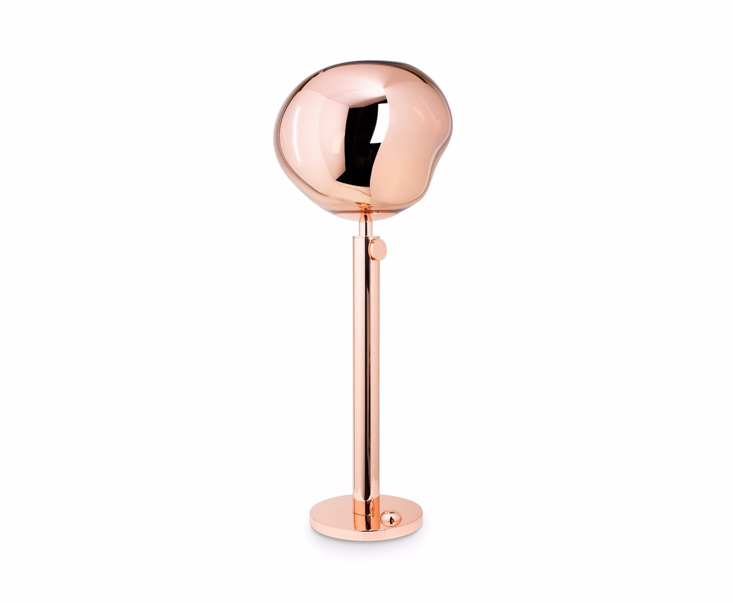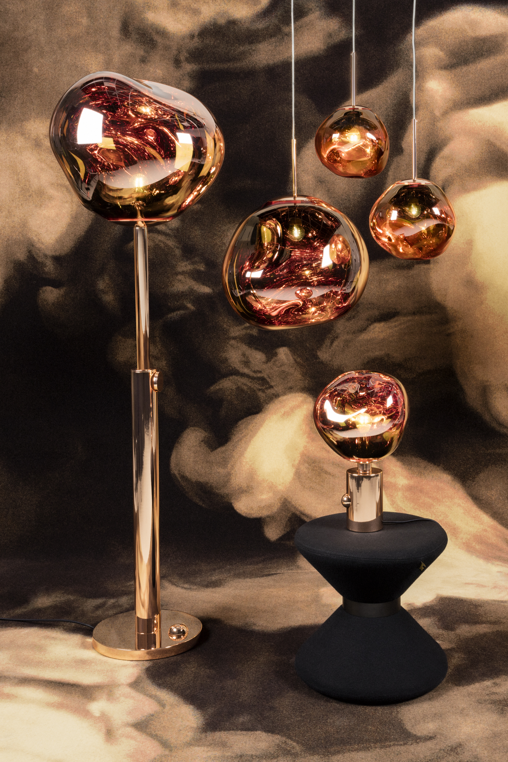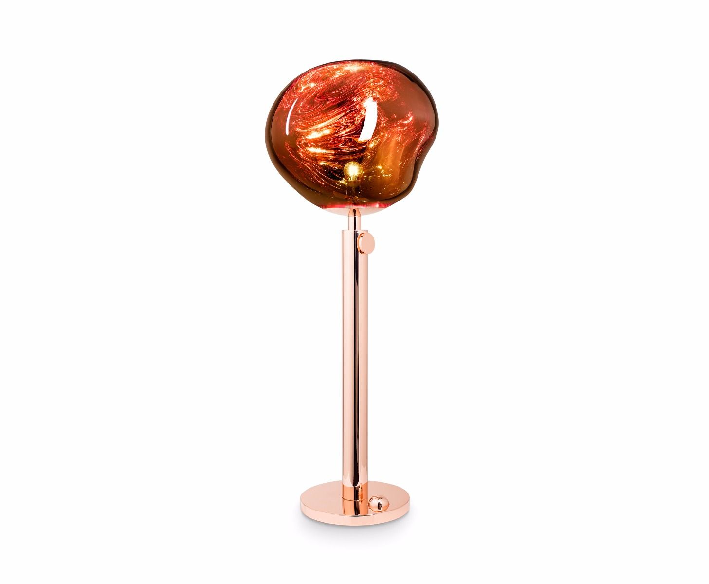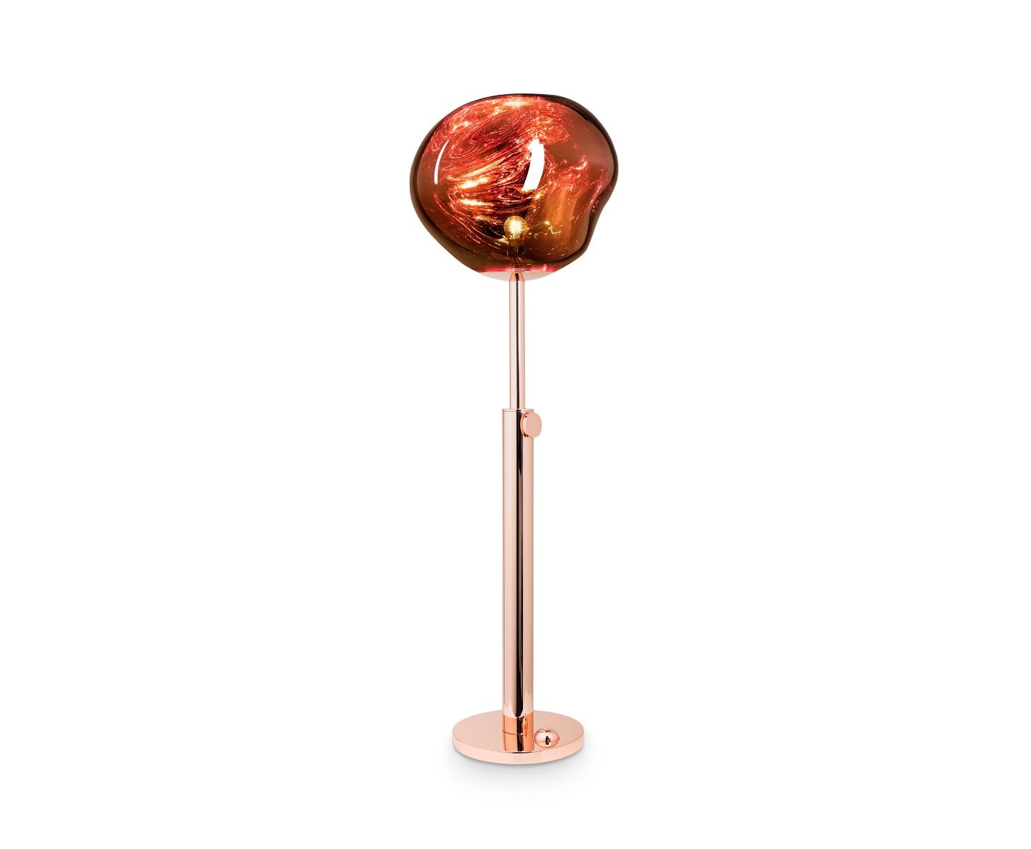Melt is a beautifully distorted lighting globe that creates a mesmerizing melting hot blown glass effect. Translucent when on and mirror-finish when off, it emits an attractive, mildly hallucinogenic light. Available in copper, as a floor and table standing lamp.
