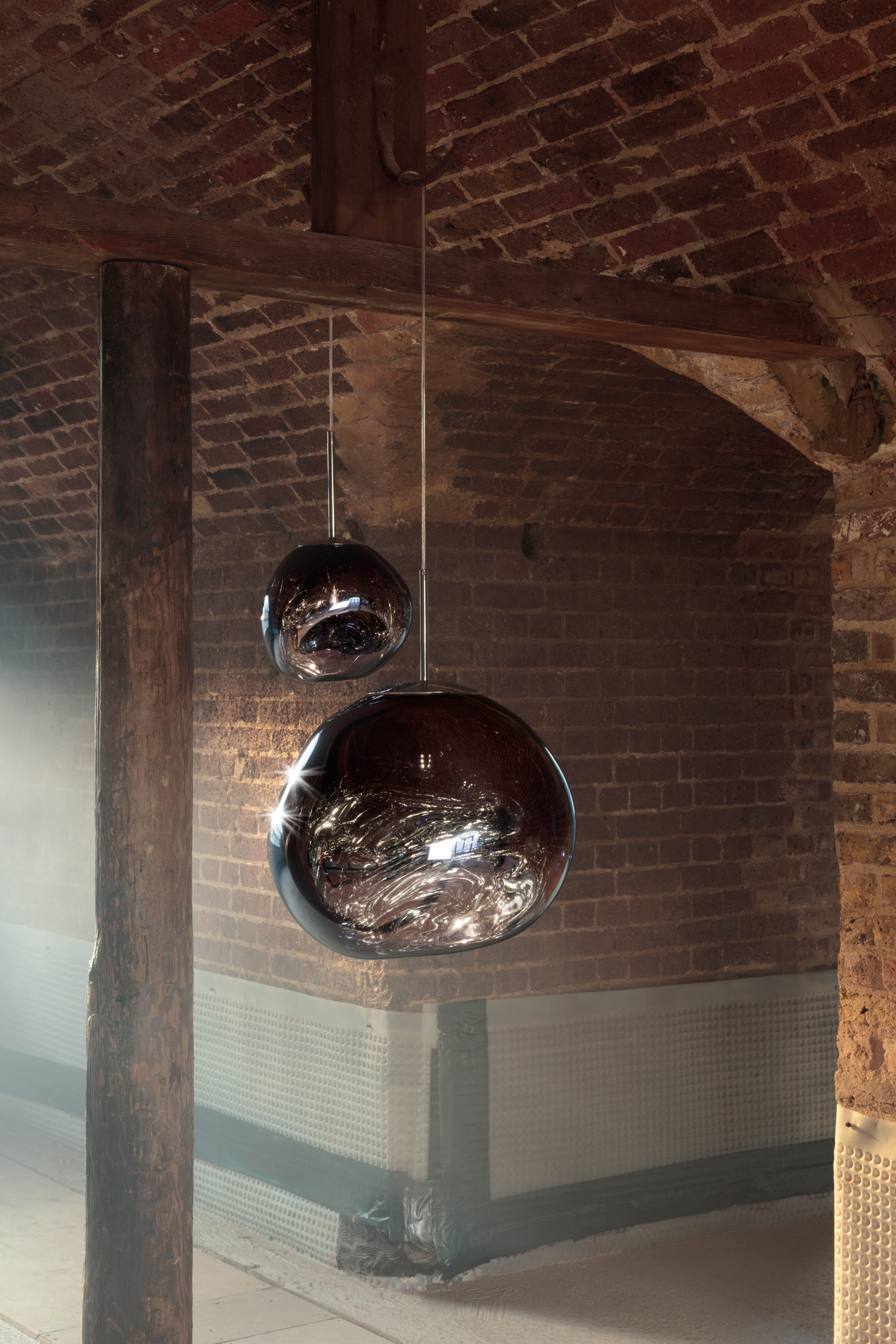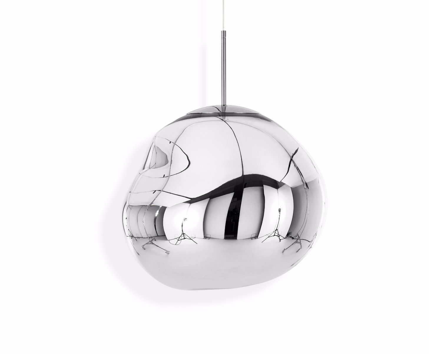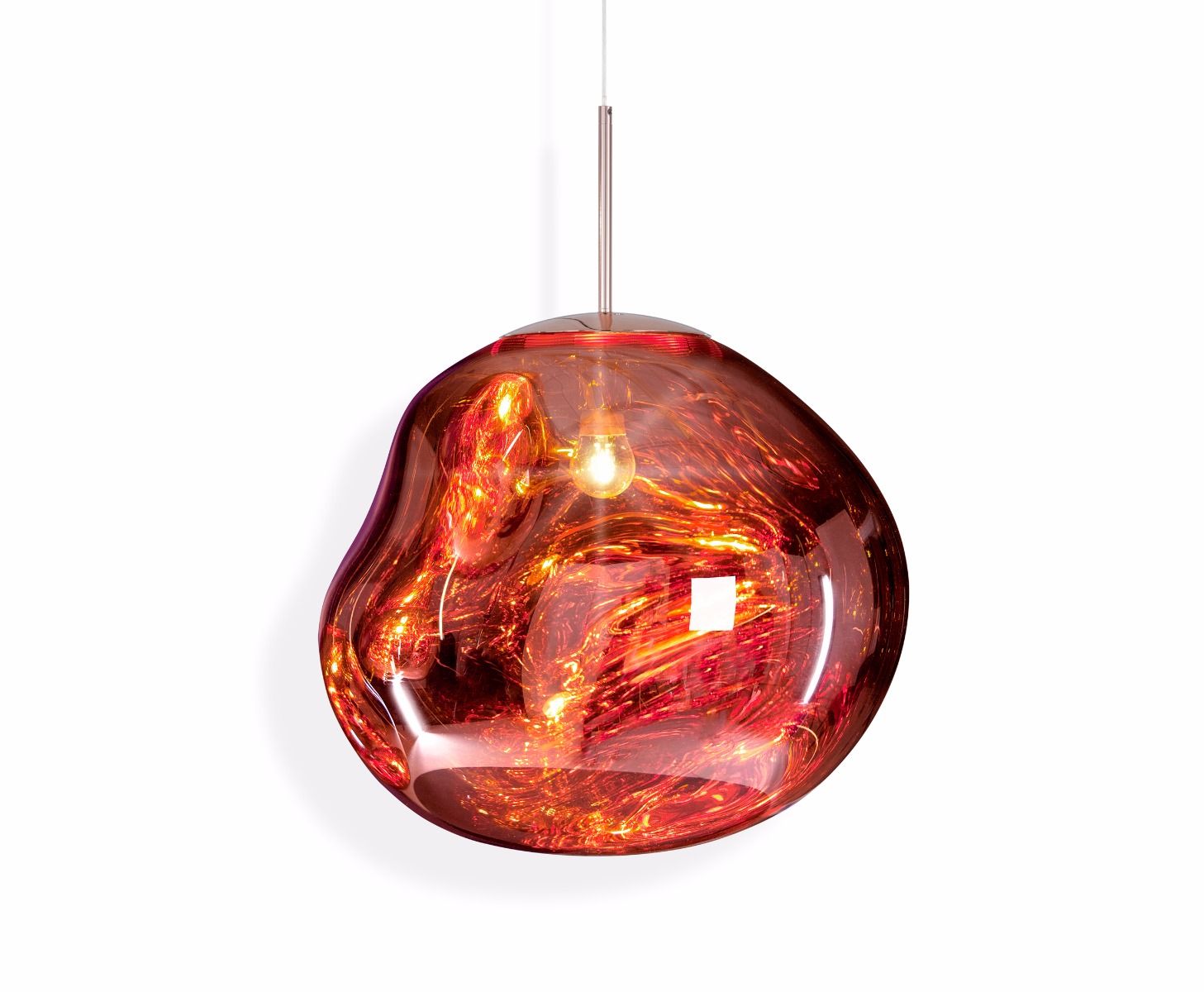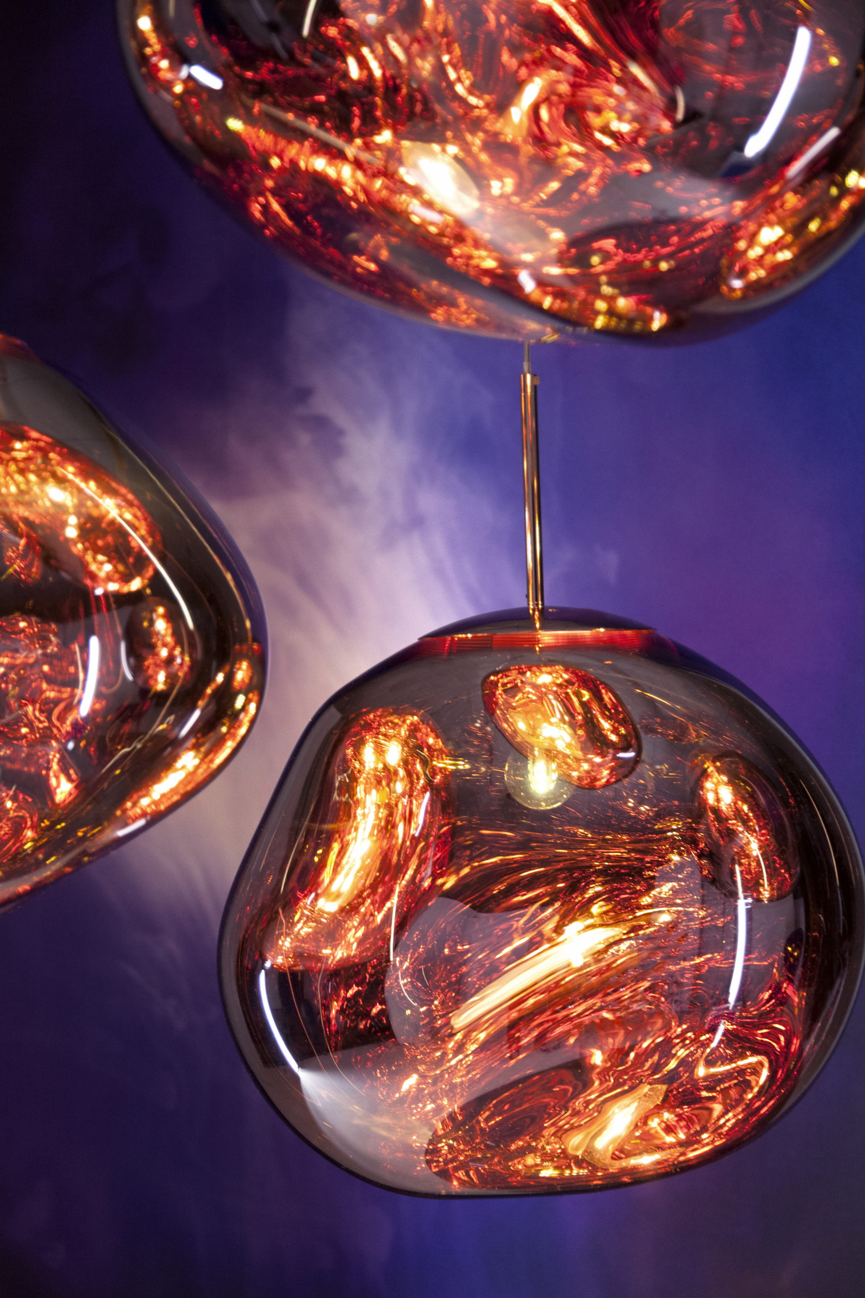 Melt is a beautifully distorted lighting globe that creates a mesmerizing melting hot blown glass effect. Translucent when on and mirror-finish when off, it emits an attractive, mildly hallucinogenic light. Available in copper, gold, chrome and smoke and a mini versions.