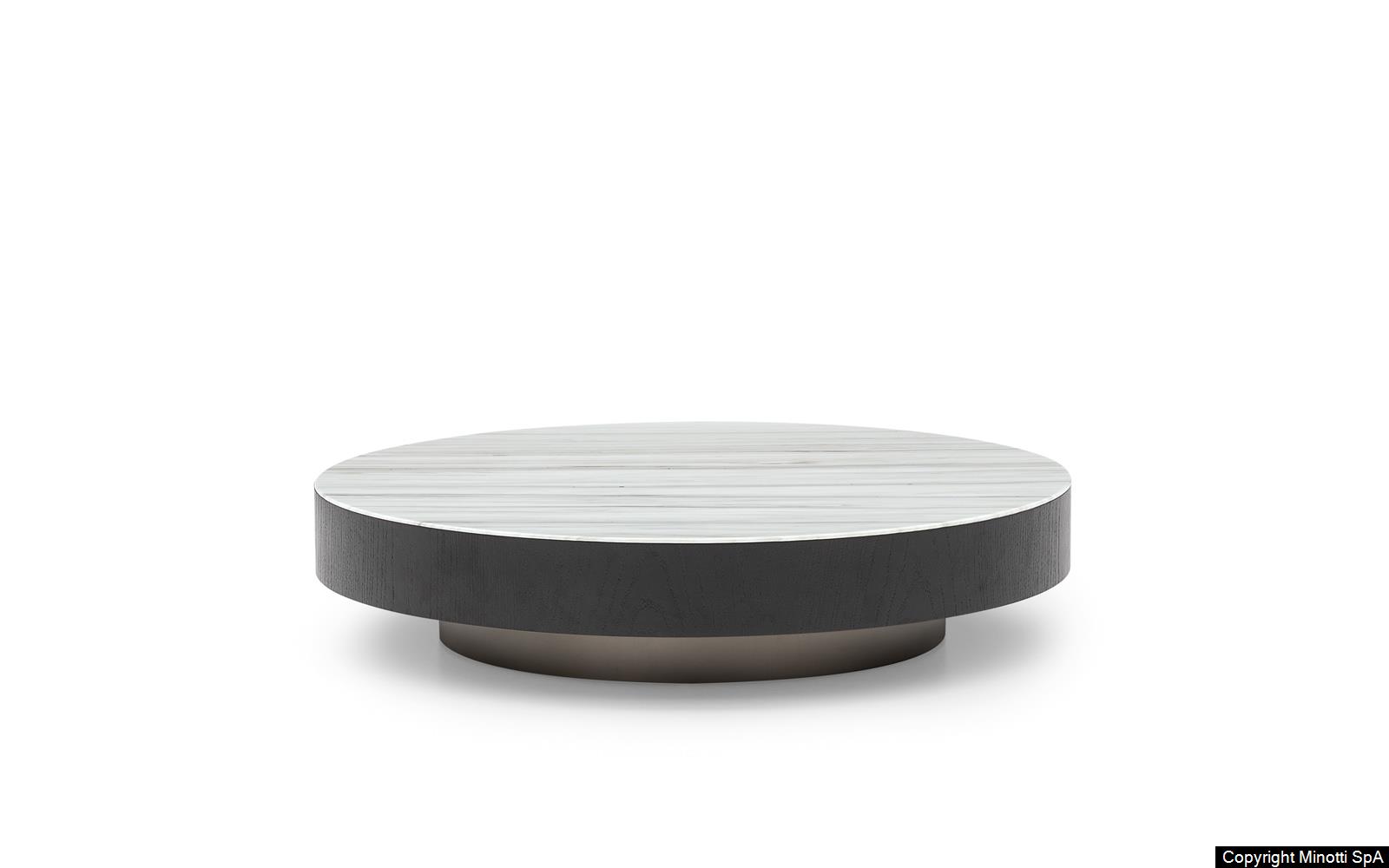 The recessed plinth in Bronze-painted satin metal transforms the supporting structure in a seemingly floating element. Closed by a band in Moka-tainted brushed oak, the frame holds the top in Zebrino marble or Black pâte de verre.