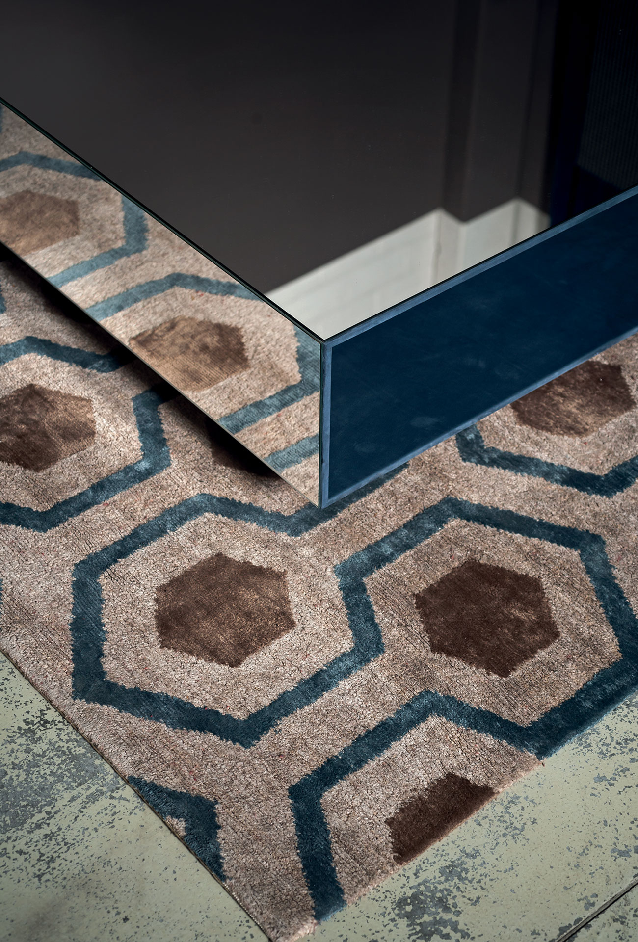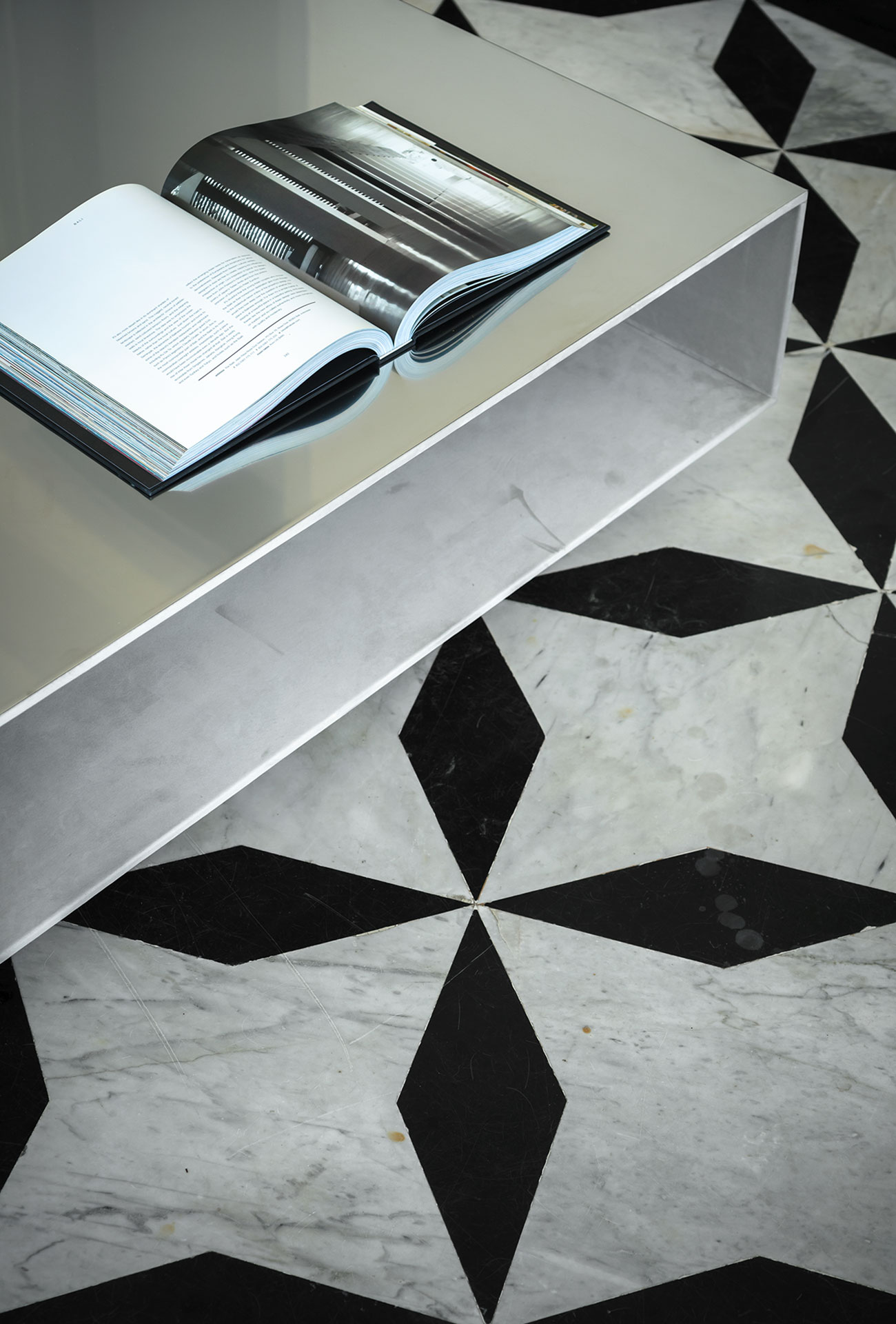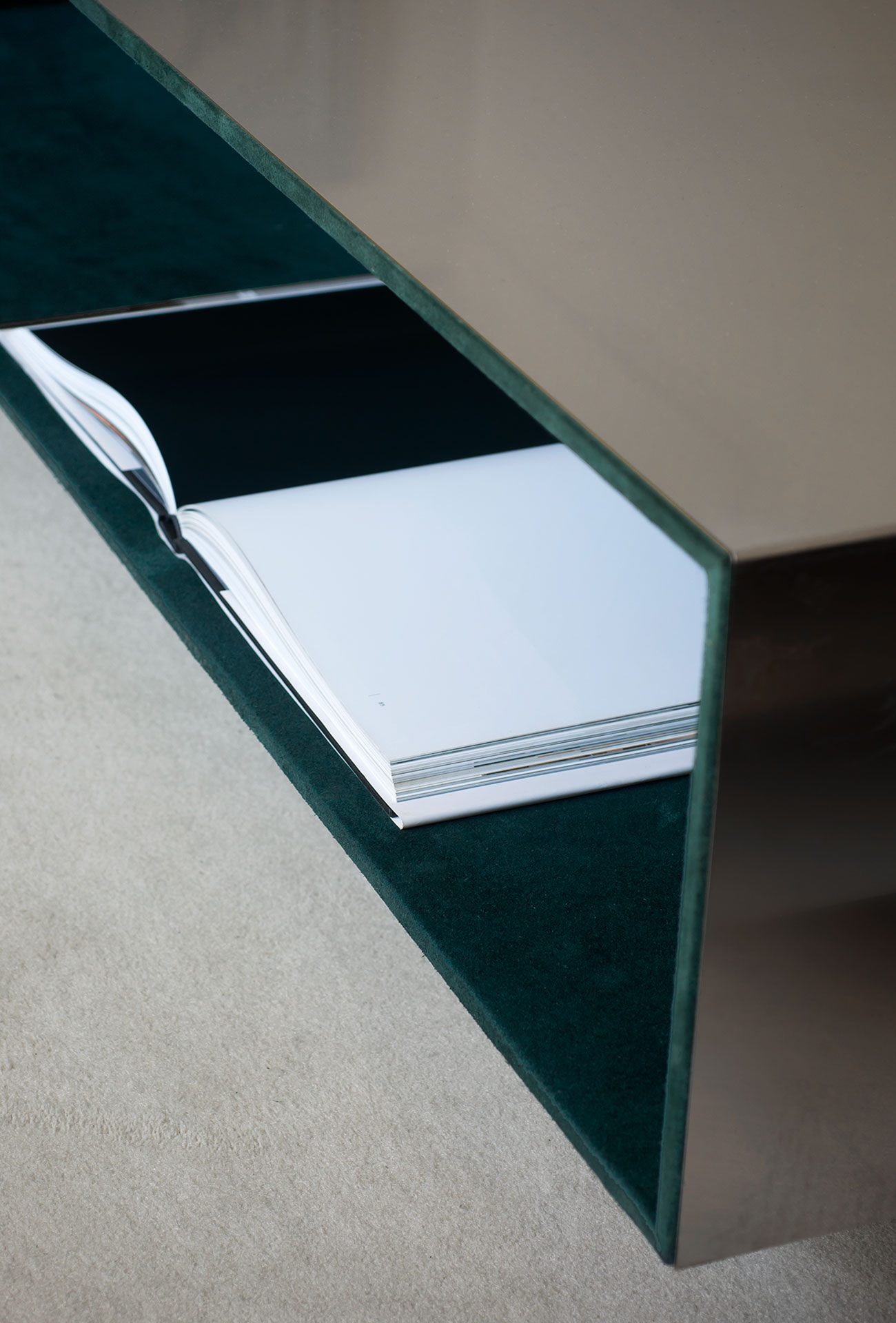 Assembled MDF frame covered with thin layer of aluminium. Exterior in shiny stainless steel sheet thickness 1mm. Internal leather upholstery. Walnut base.