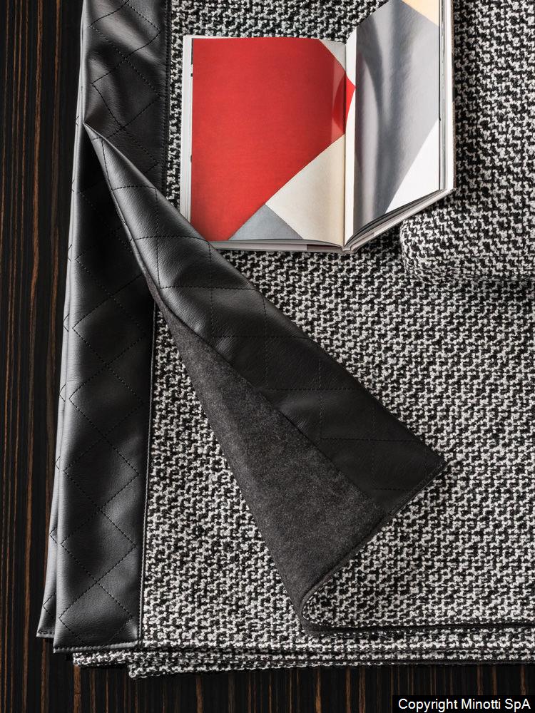 The throws come in two sizes and are finished on two sides with a 10 cm border in eco-leather with stitching that creates a diamond pattern.