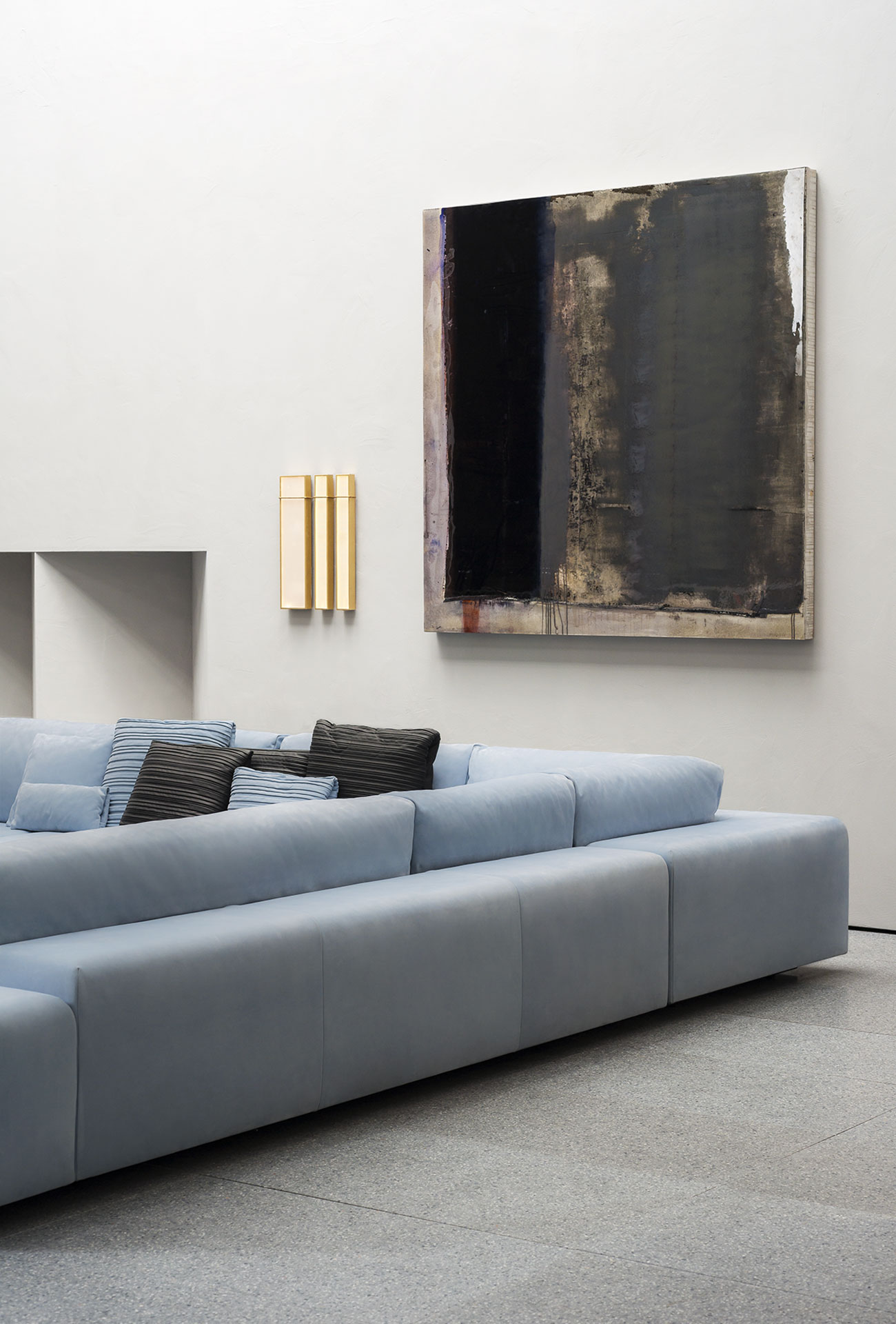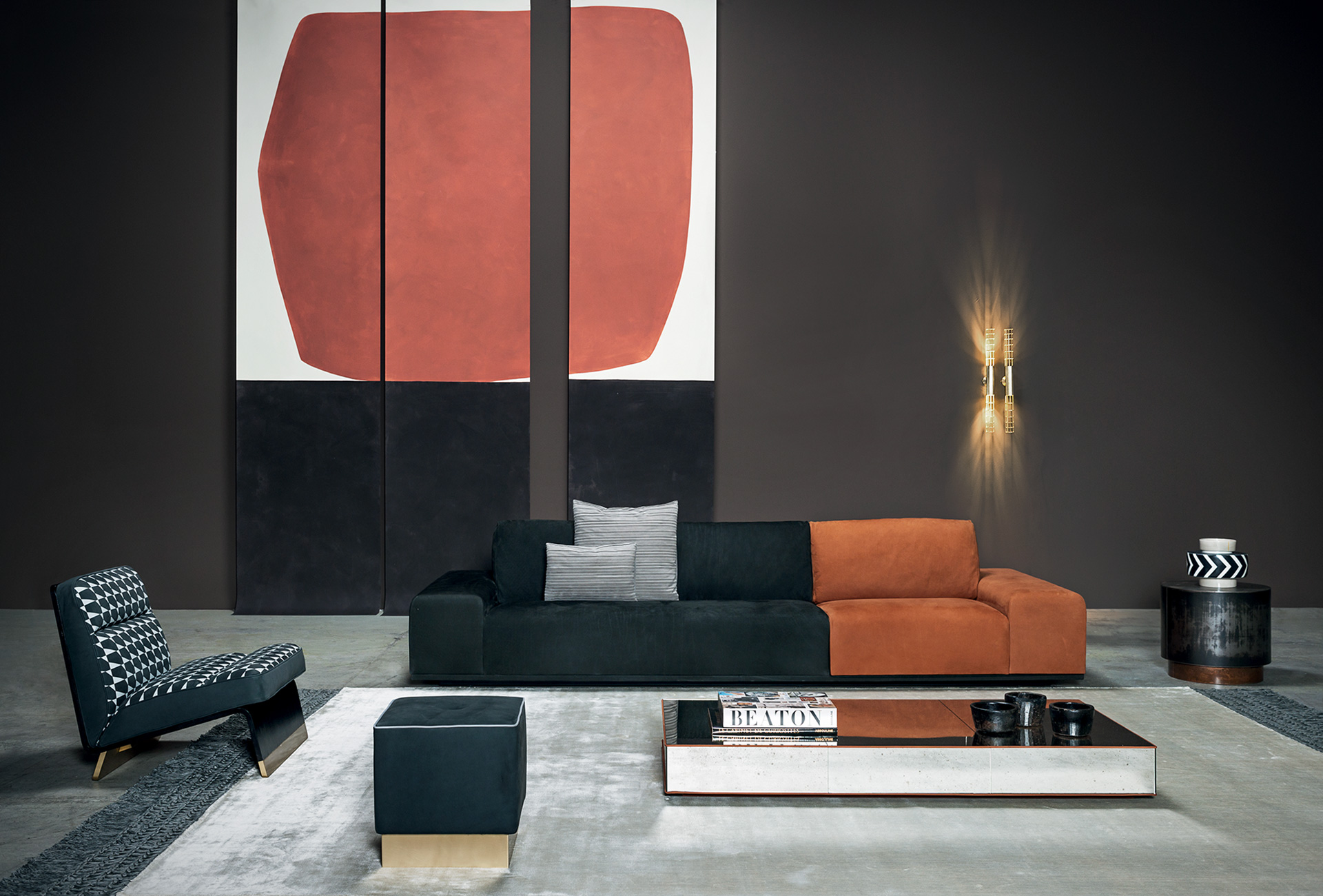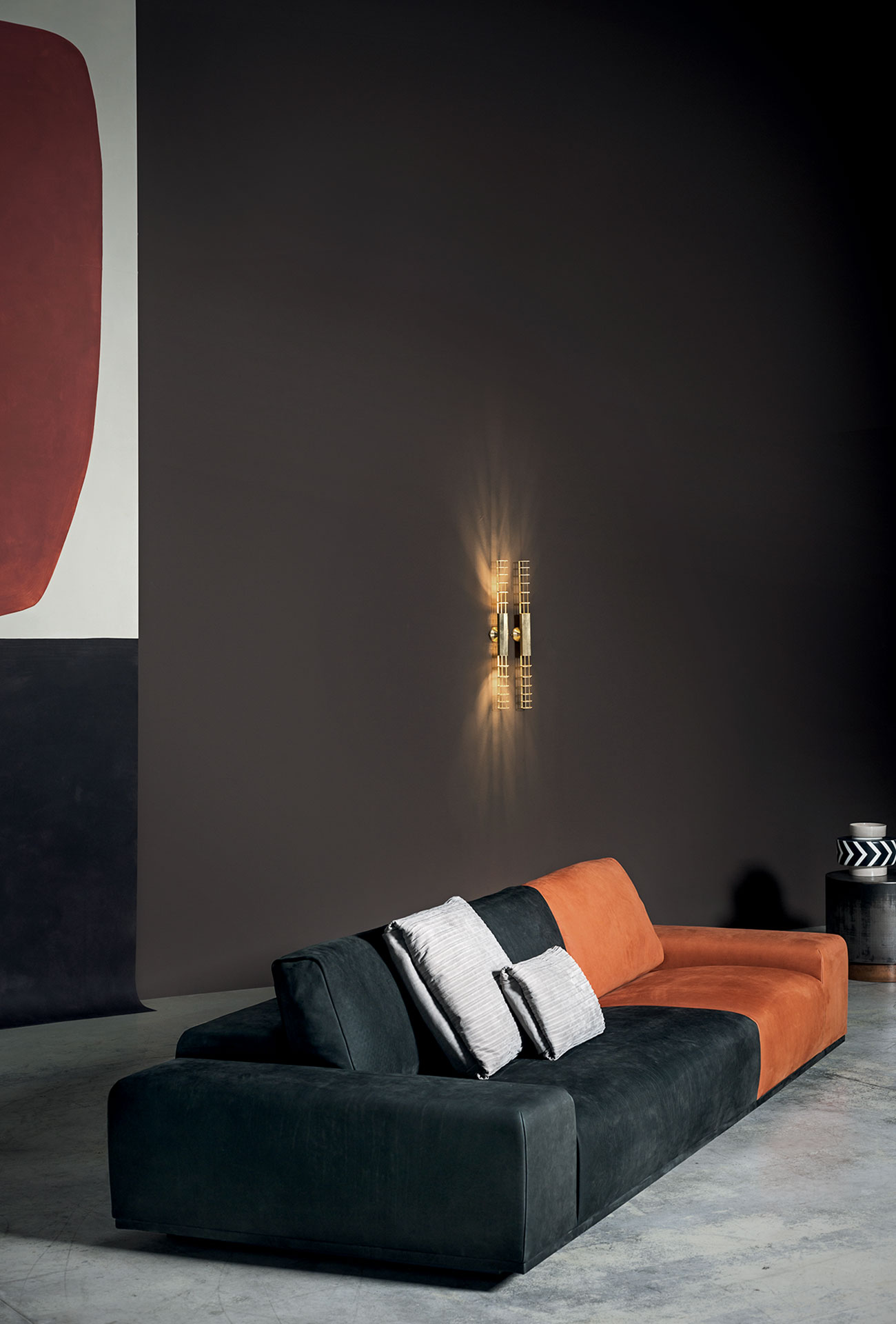 Modular article. Double-panelled fir and polar frame. Base in black-stained wood. Padding in differentiated density foam padding with acrylic fibre covers. Back cushions in washed and sterilized goose down with polyurethane foam insert. The sofa in two different kind of leather or colour is available on request.