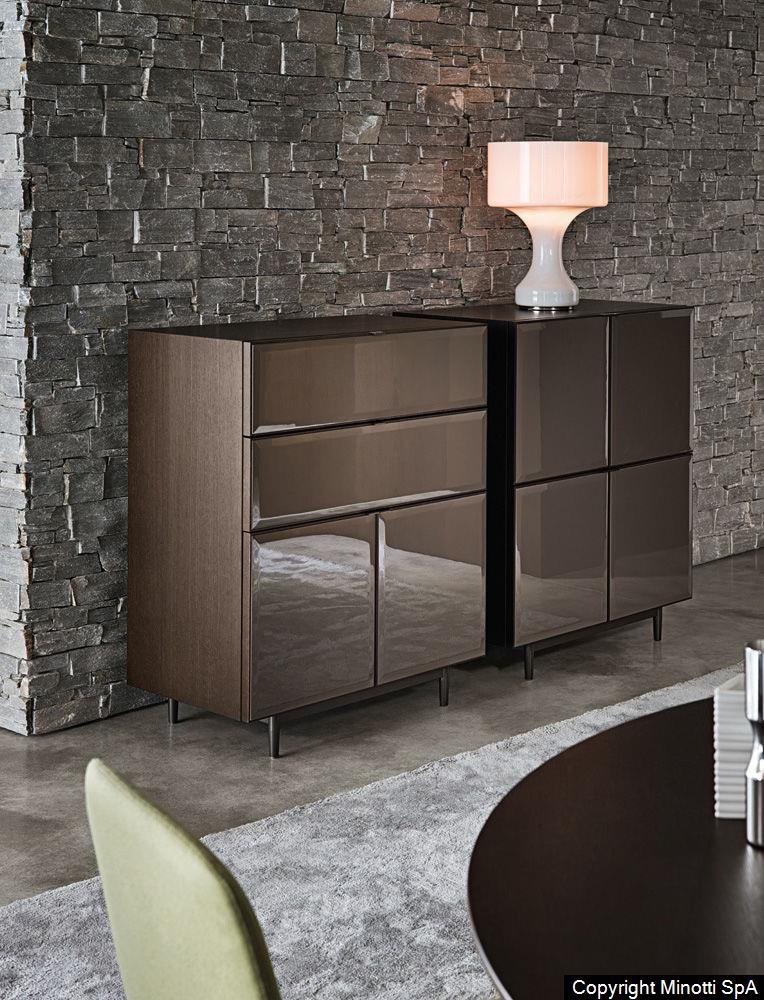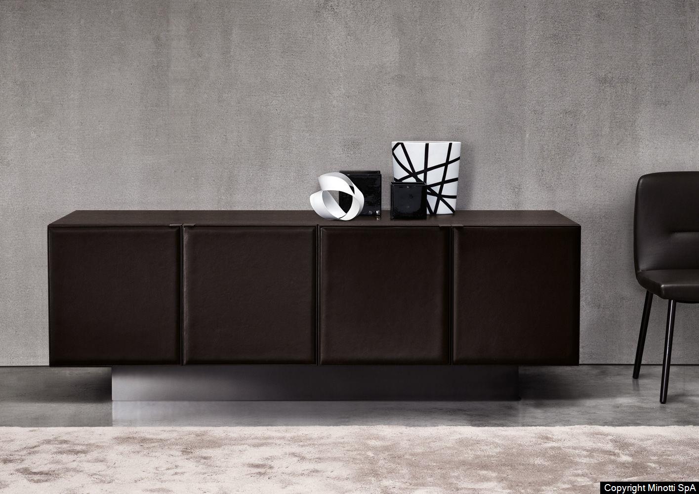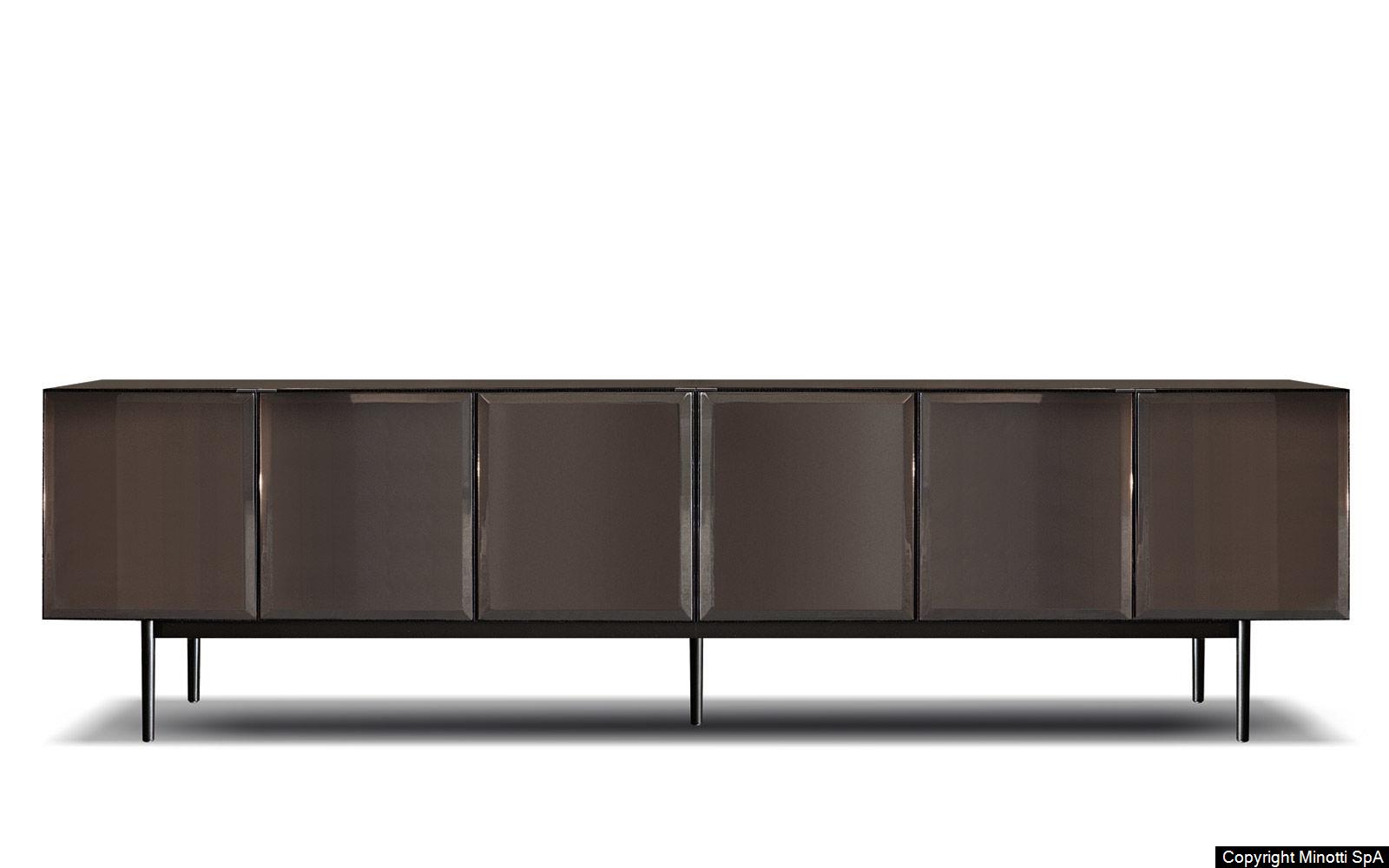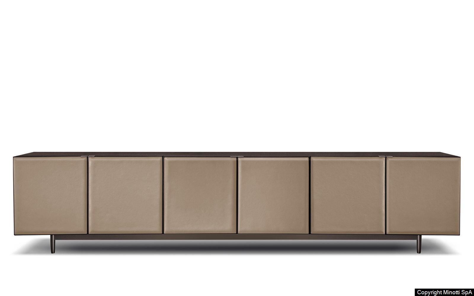 The Morrison base comes in three versions: on the floor, or in heights of cm 12 and 25. The new oak open-pore finish has been added in a Tobacco stained color which goes to join the Moka. The beveled edge running around the perimeter defines the line of the doors and front section of the drawers which, in addition to the leather-lined version, also come in a glossy lacquered finish in Sand, Celadon, Mud, Granite and Moka. There is also a version with all-oak Tobacco doors and a structure in lacquered satin-finish Mud.