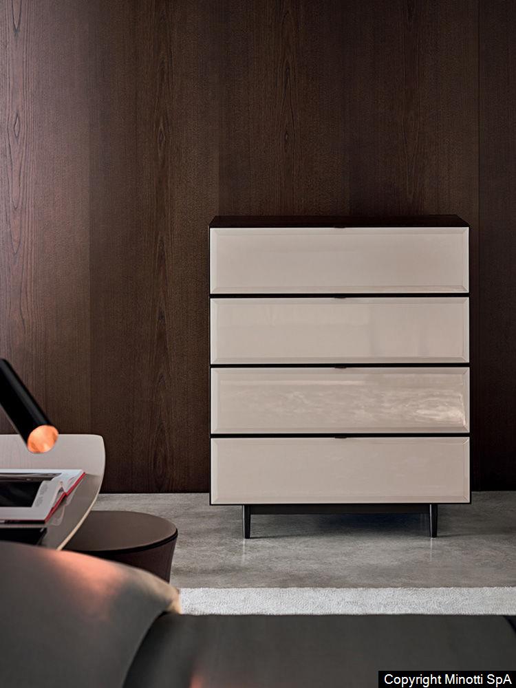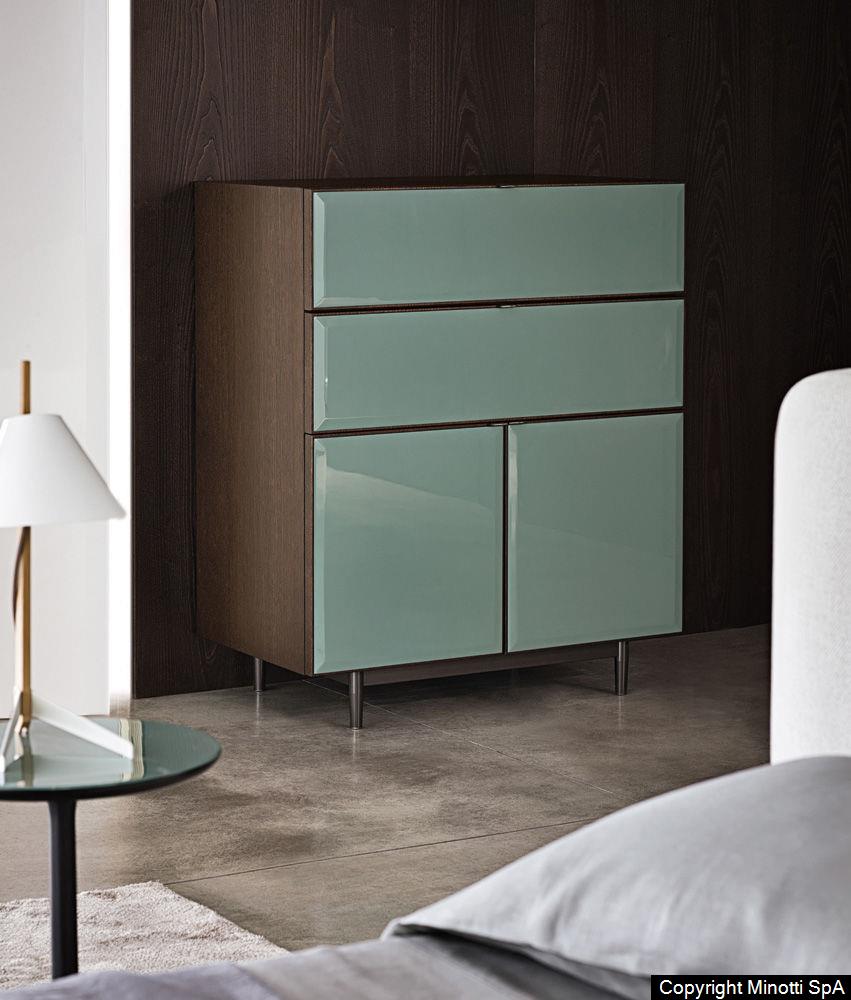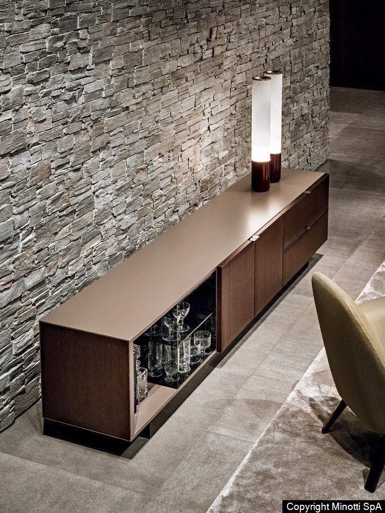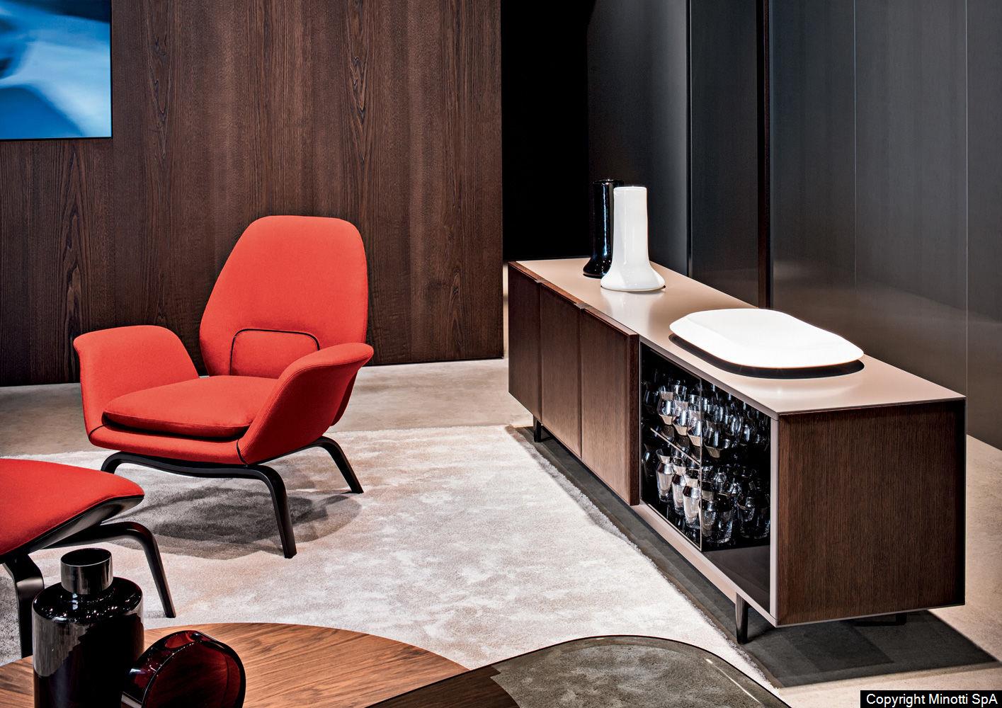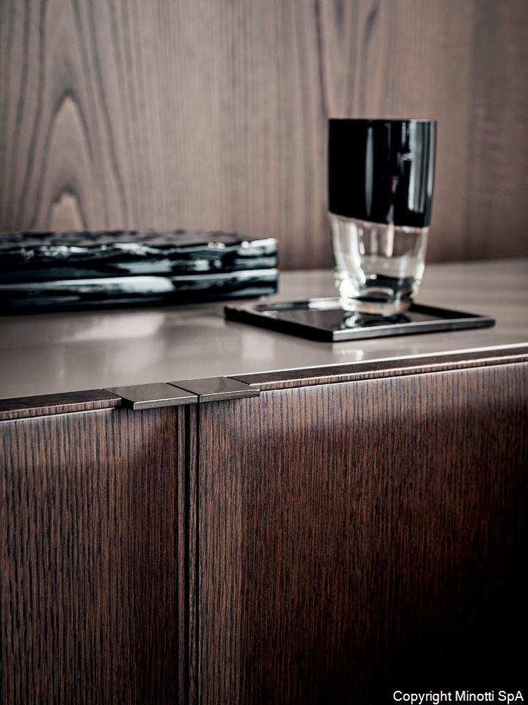The Morrison base comes in three versions: on the floor, or in heights of cm 12 and 25. The new oak open-pore finish has been added in a Tobacco stained color which goes to join the Moka. The beveled edge running around the perimeter defines the line of the doors and front section of the drawers which, in addition to the leather-lined version, also come in a glossy lacquered finish in Sand, Celadon, Mud, Granite and Moka. There is also a version with all-oak Tobacco doors and a structure in lacquered satin-finish Mud.