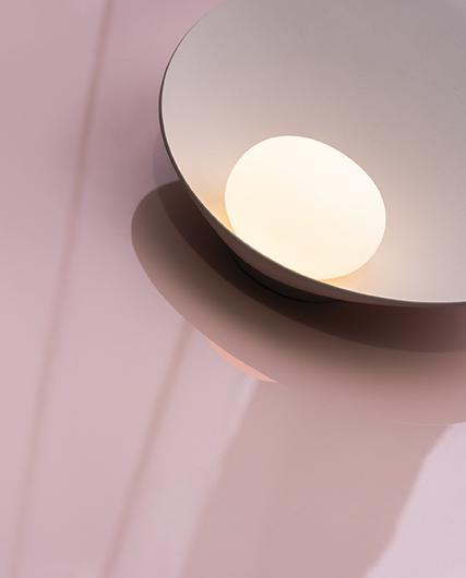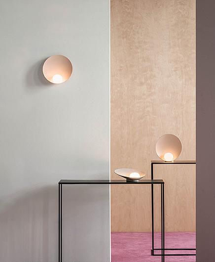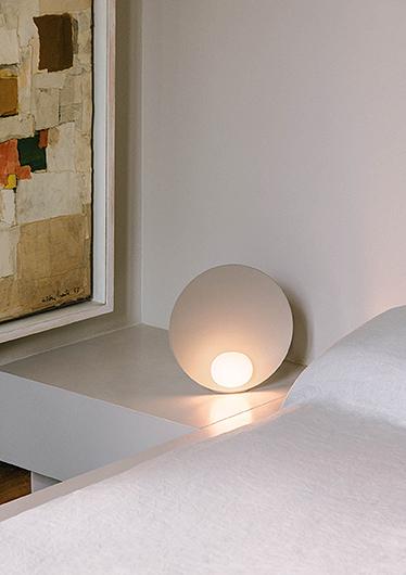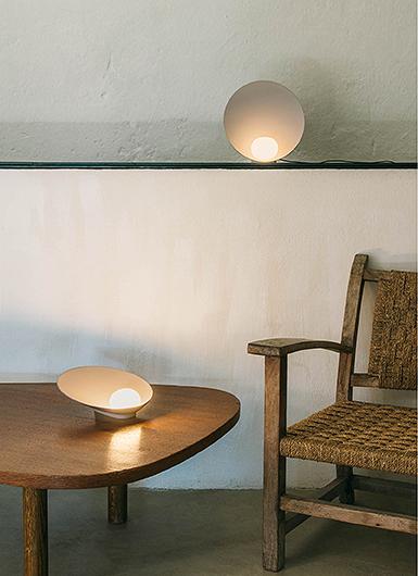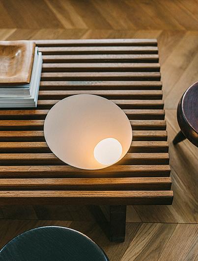 A delicate and elegant design where a symbiotic interaction is established between the small hand was blown opal glass sphere and the dish that holds and reflects it. Designed as a table lamp there is also a portable model with its own battery ending it complete autonomy. Its capacity of being able to work anywhere underlines its poetic physical form.