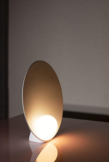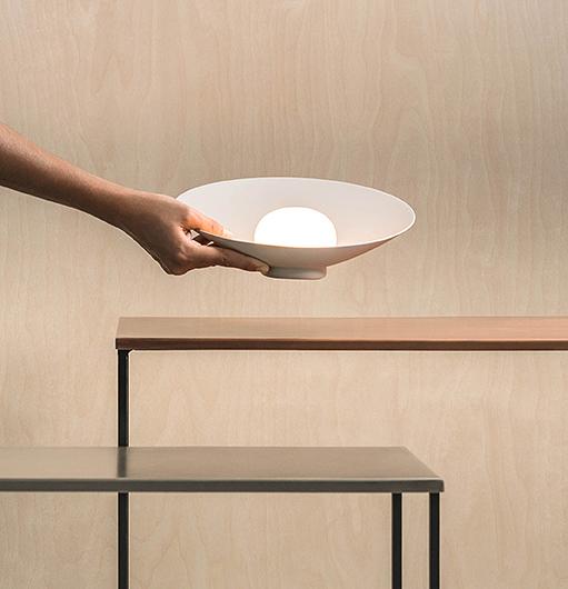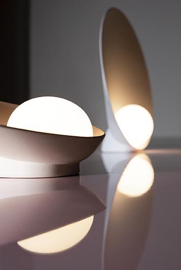 A delicate and elegant design where a symbiotic interaction is established between the small hand was blown opal glass sphere and the dish that holds and reflects it. Designed as a table lamp there is also a portable model with its own battery ending it complete autonomy. Its capacity of being able to work anywhere underlines its poetic physical form.