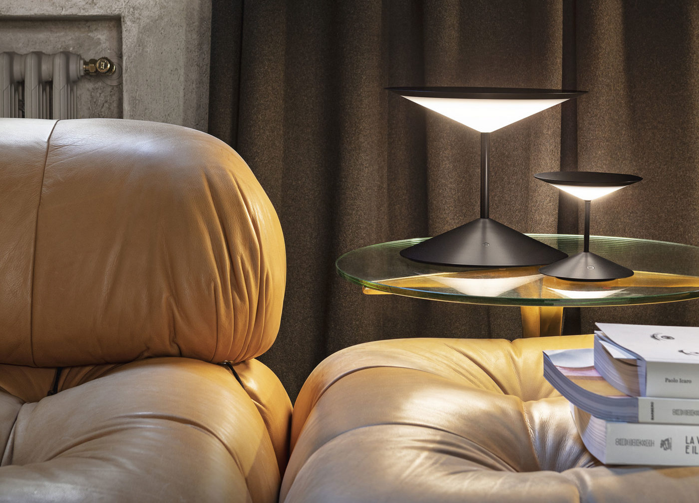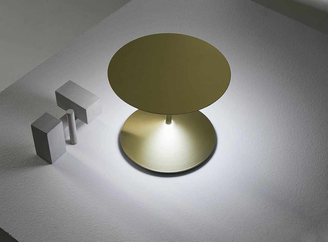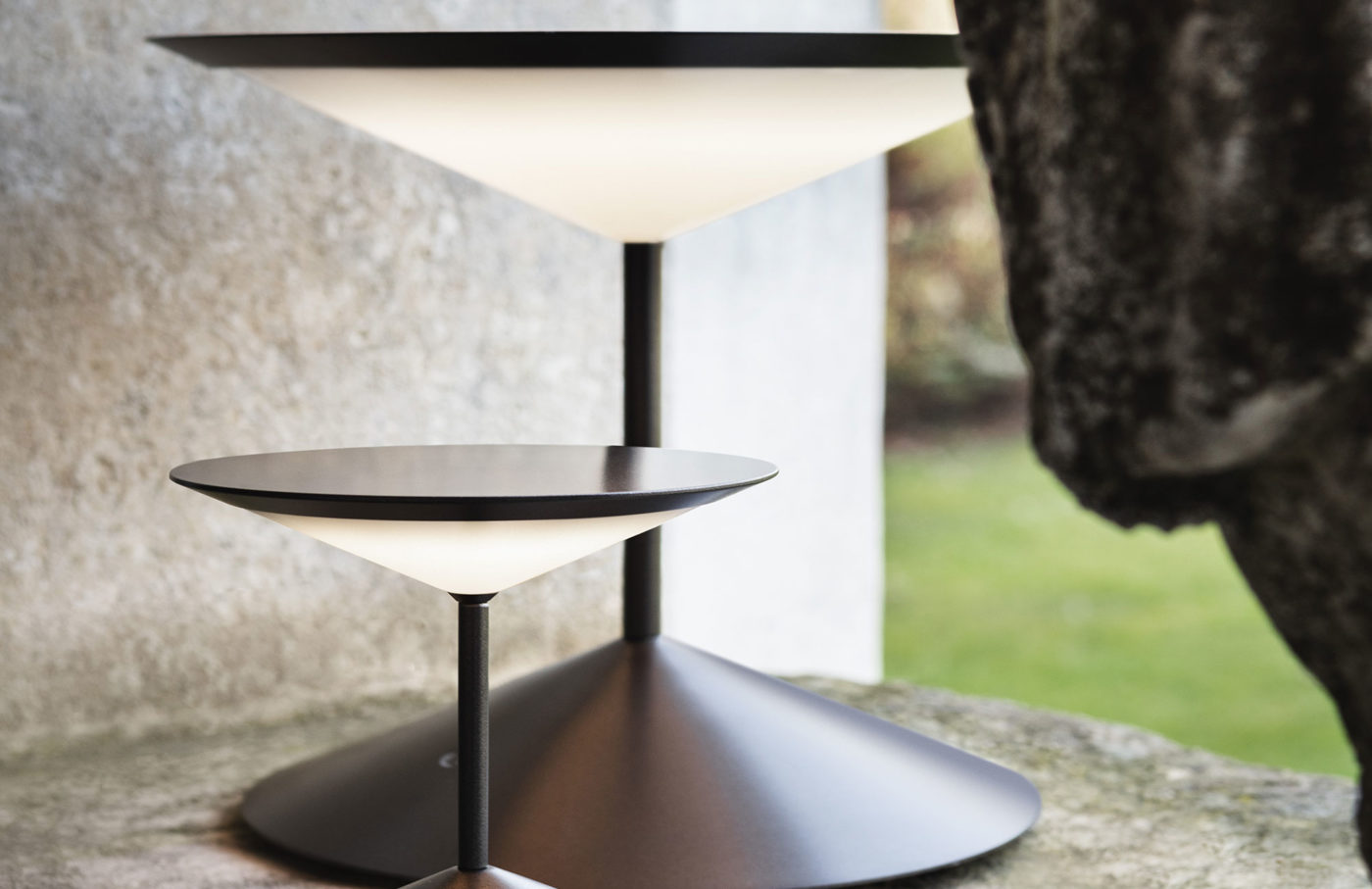 As in the classic myth Narciso looks at his image reflected in the water, likewise the cone of this lamp splits up to spread and reflect the delicate light of the lighting body. The table version is a tribute to music, complete with bluetooth audio speakers.