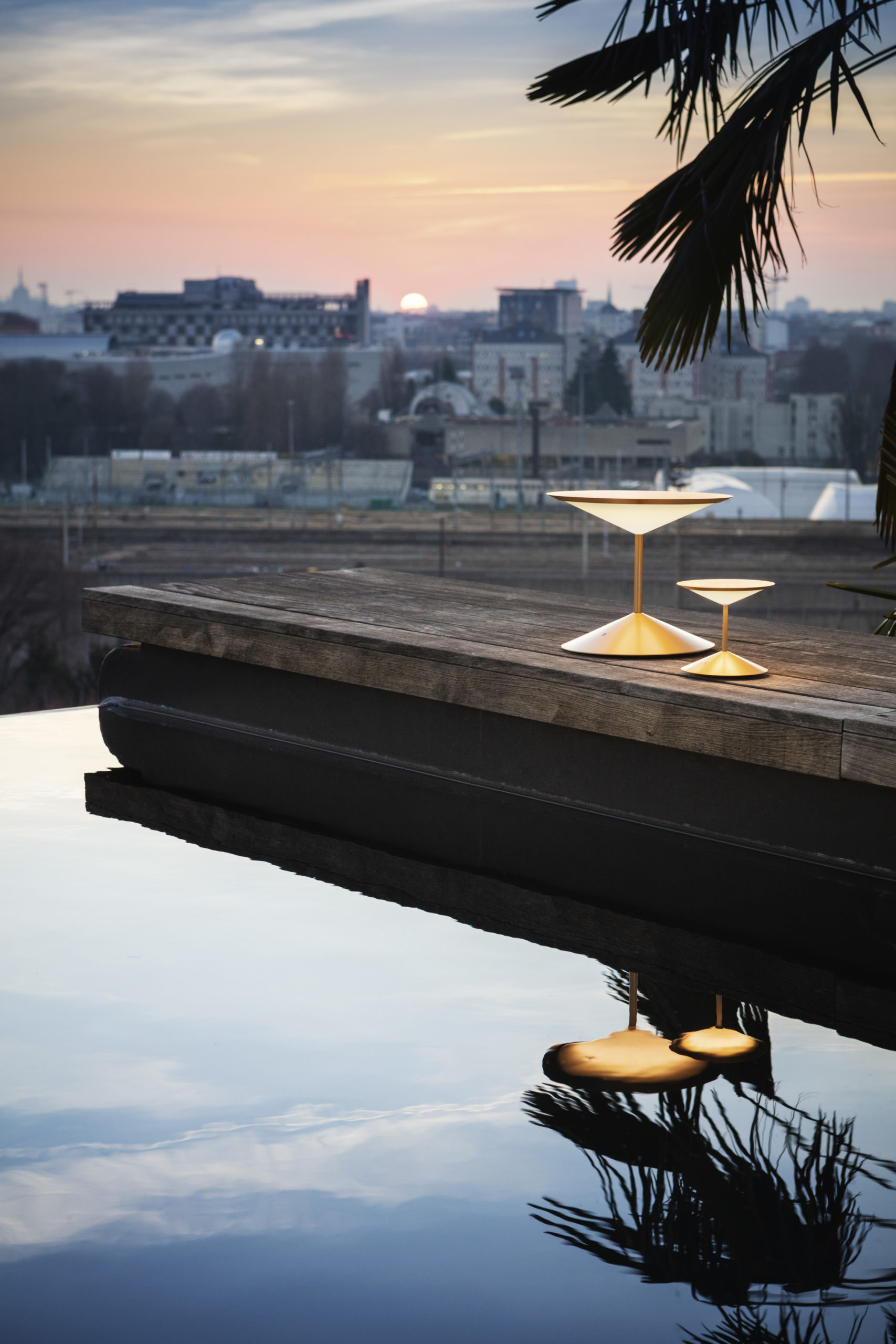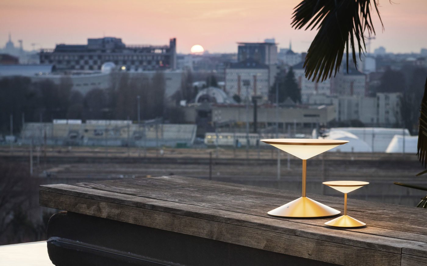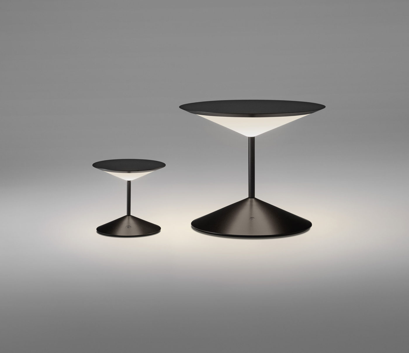 As in the classic myth Narciso looks at his image reflected in the water, likewise the cone of this lamp splits up to spread and reflect the delicate light of the lighting body. The table version is a tribute to music, complete with bluetooth audio speakers.