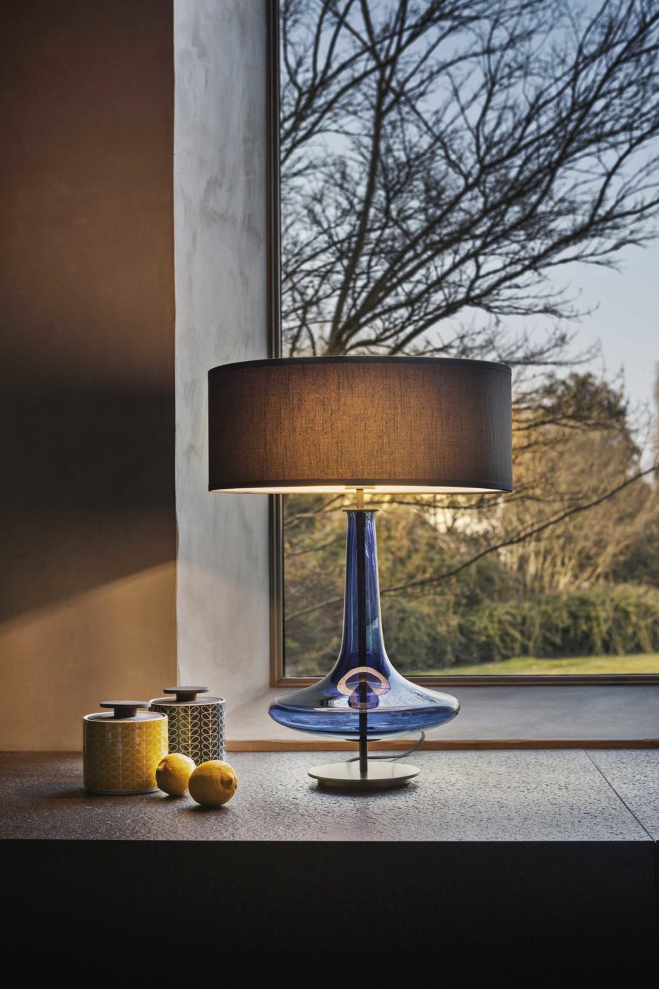 Glamorously reinventing the table lamp, New classic has a glass bottle in different shapes as a base and a shade of fabric or translucent material, for a fresh,