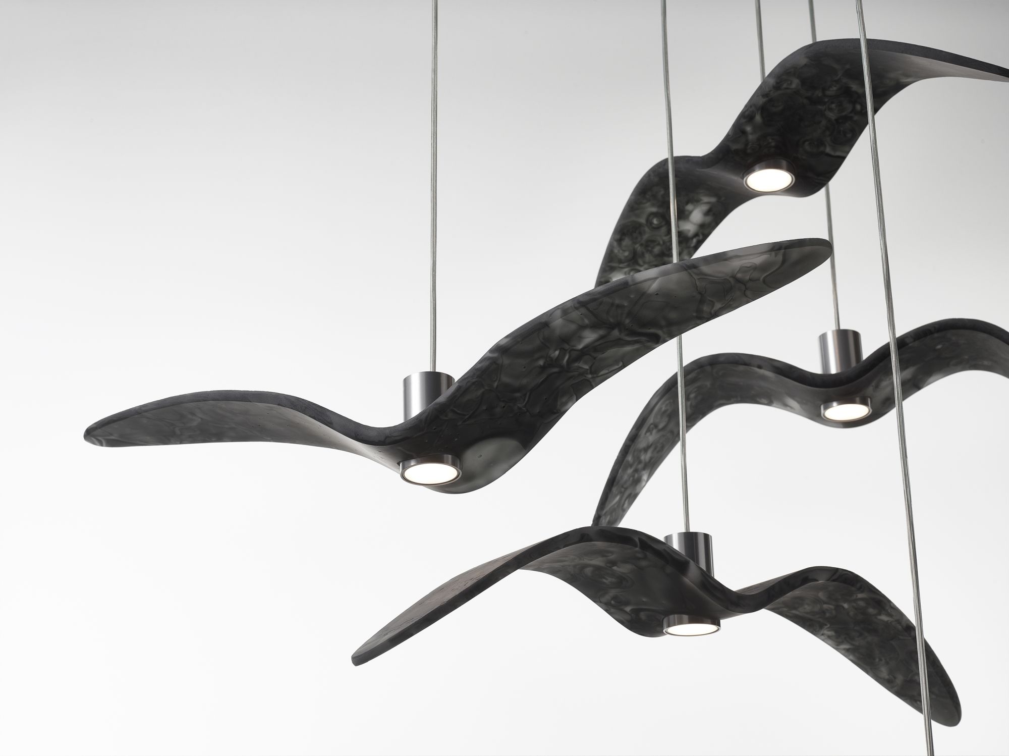 Inspired by the abandon and freedom of bird flight, the innovative Night Birds suspension lights impart poetic enchantment and unparalleled dynamism to any interior. Night Birds differ from the other collections in the unique technology applied in production, which involves melting glass into a mould and then bending it. The process makes it possible to instil delicate nuances in the shape of the wings and achieve a coloration of the glass that is different and wholly unique each time.