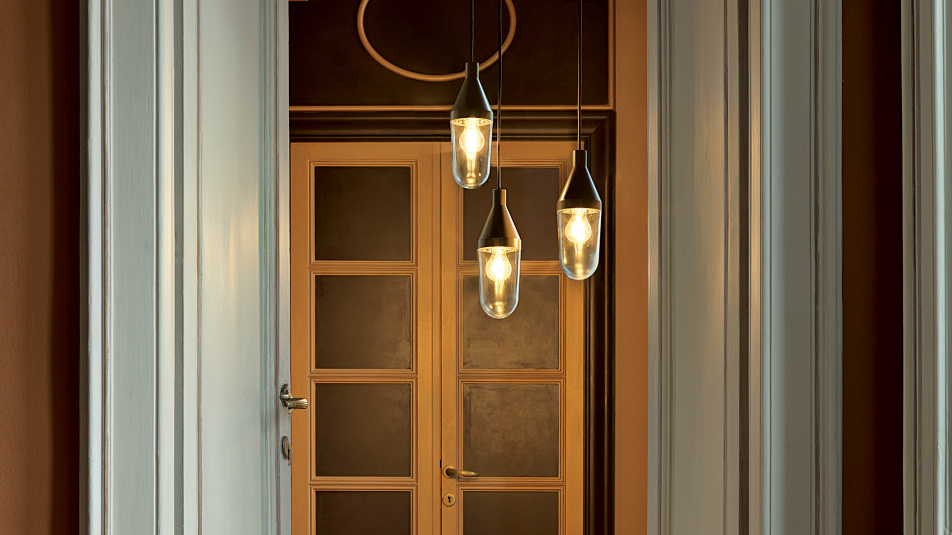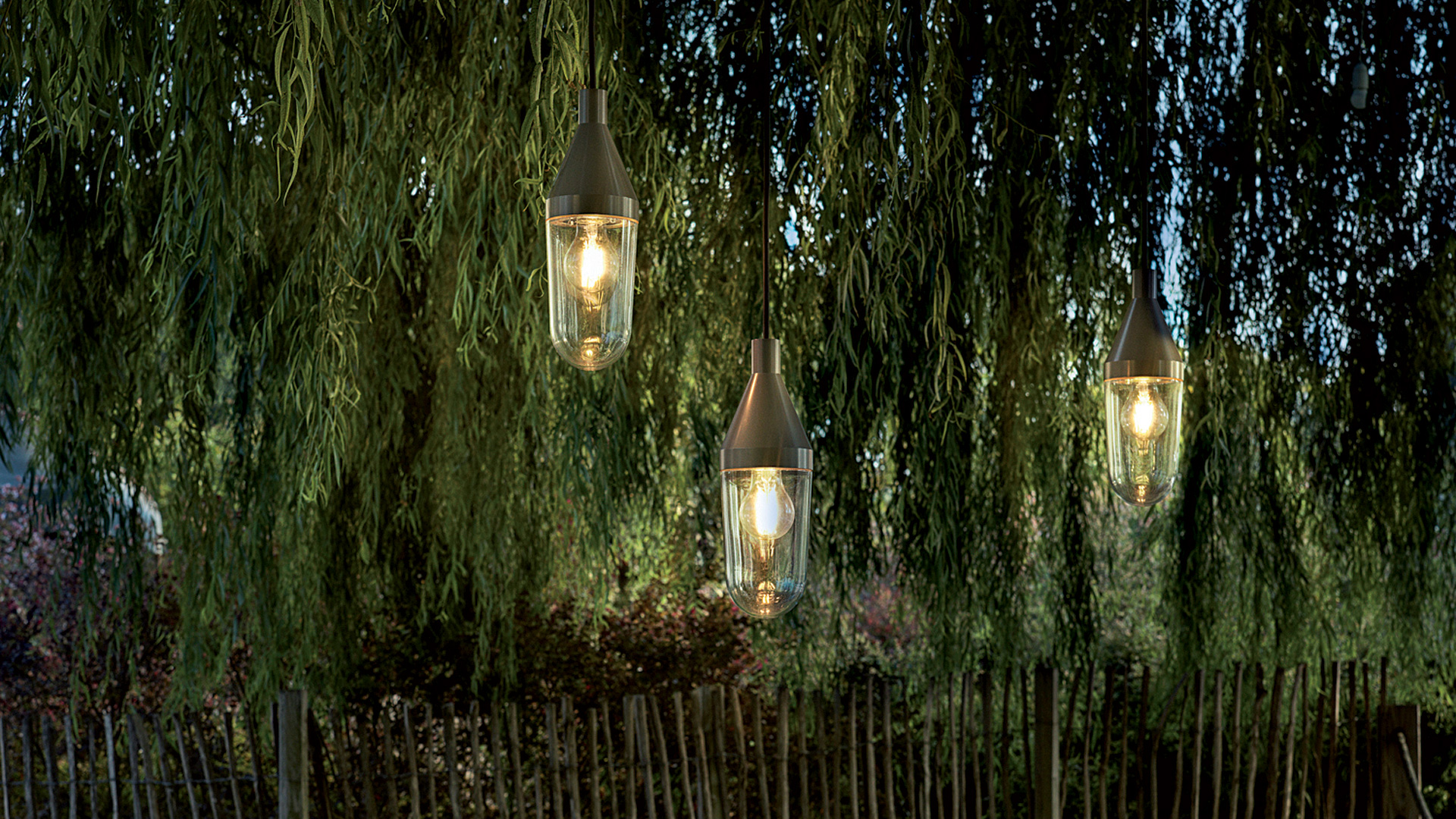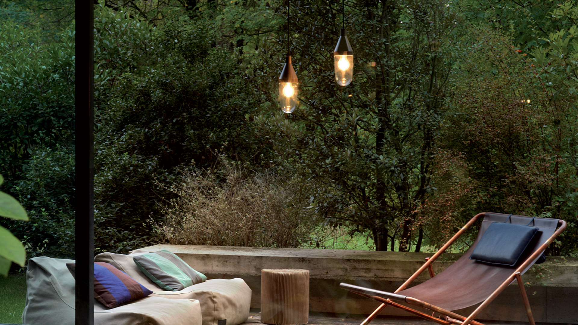 The light bulb is protected by a glass bell and both are fixed to a metal cone, available in several different versions according to the type of lamp: cable-suspended in the indoor suspended version, fastened to a metal bracket in the indoor/outdoor wall version – and with a free line cable in the outdoor version, where Niwa reveals a nomadic soul, lending itself to a wide range of applications, coiled around a tree branch or resting, free, on a green English lawn.