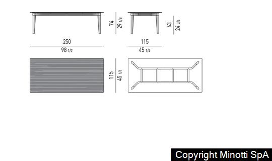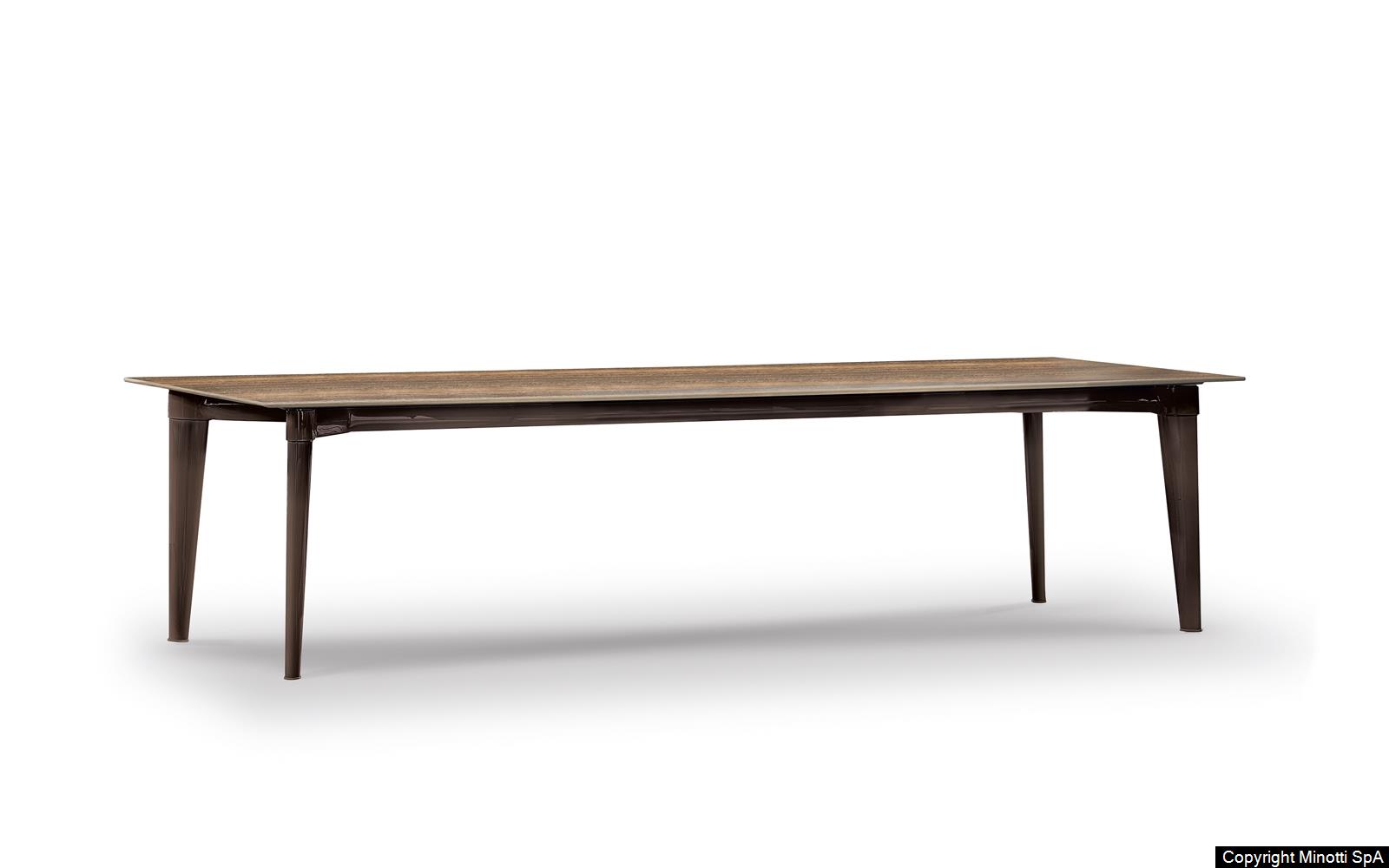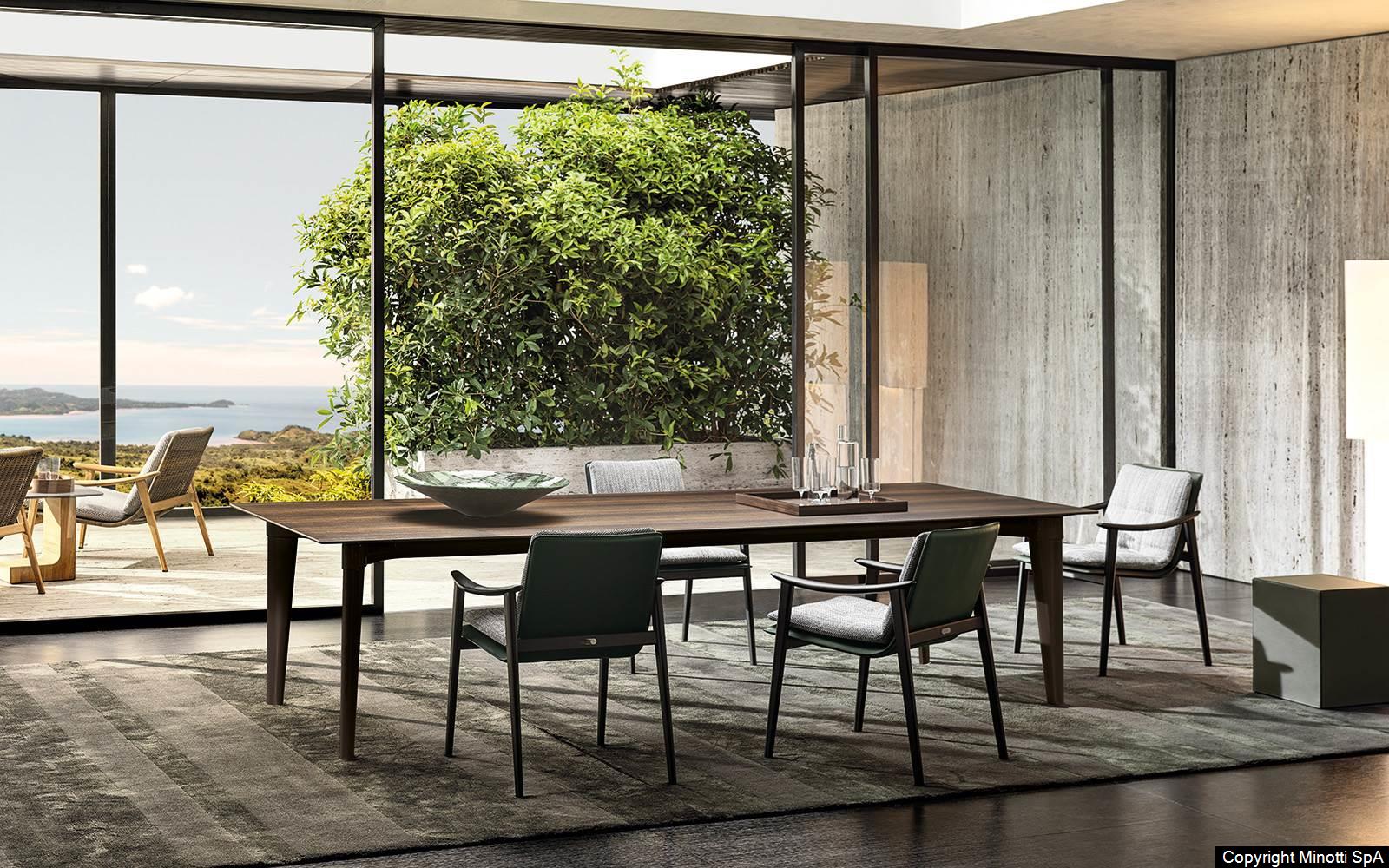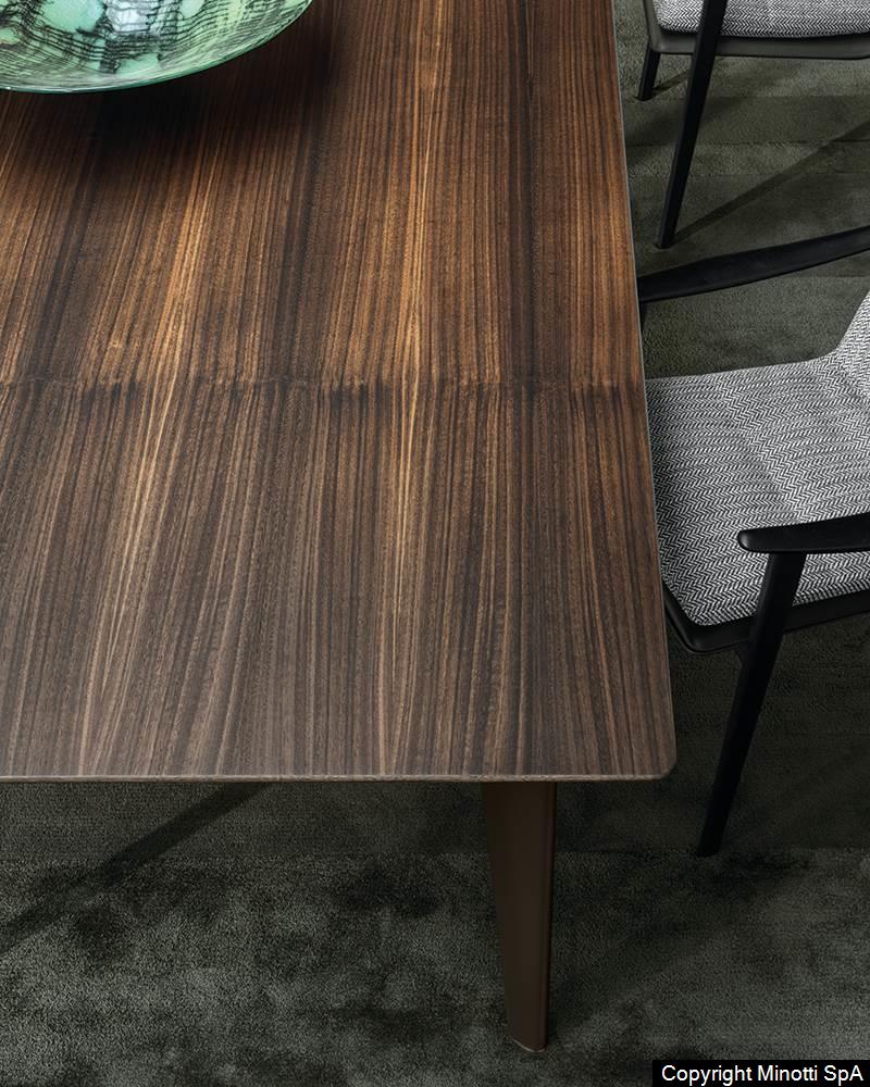 The colour of the legs in polished Pewter and the choice of a textured, pictorial wood define its sophisticated elegance, revealing an apparently minimalist, linear design. The tapered leg, also featured on the outdoor Terrace table designed by Rodolfo Dordoni, endows the piece with dynamism and a sensation of absolute lightness.