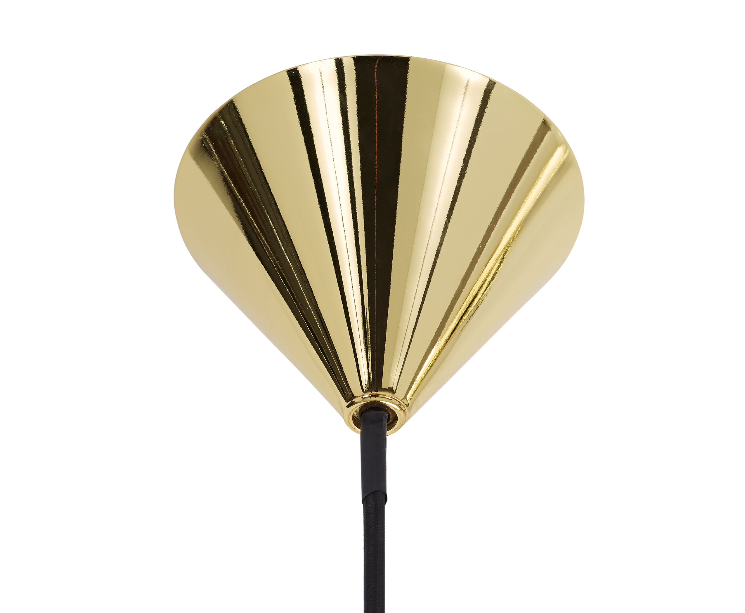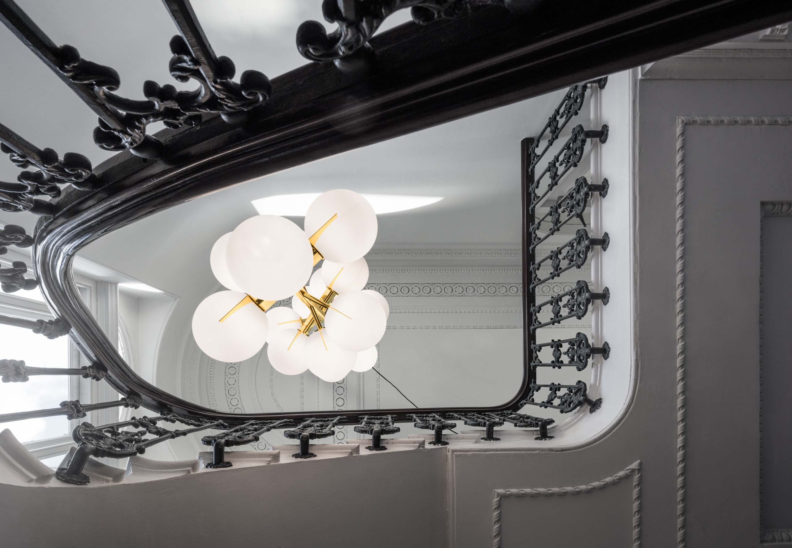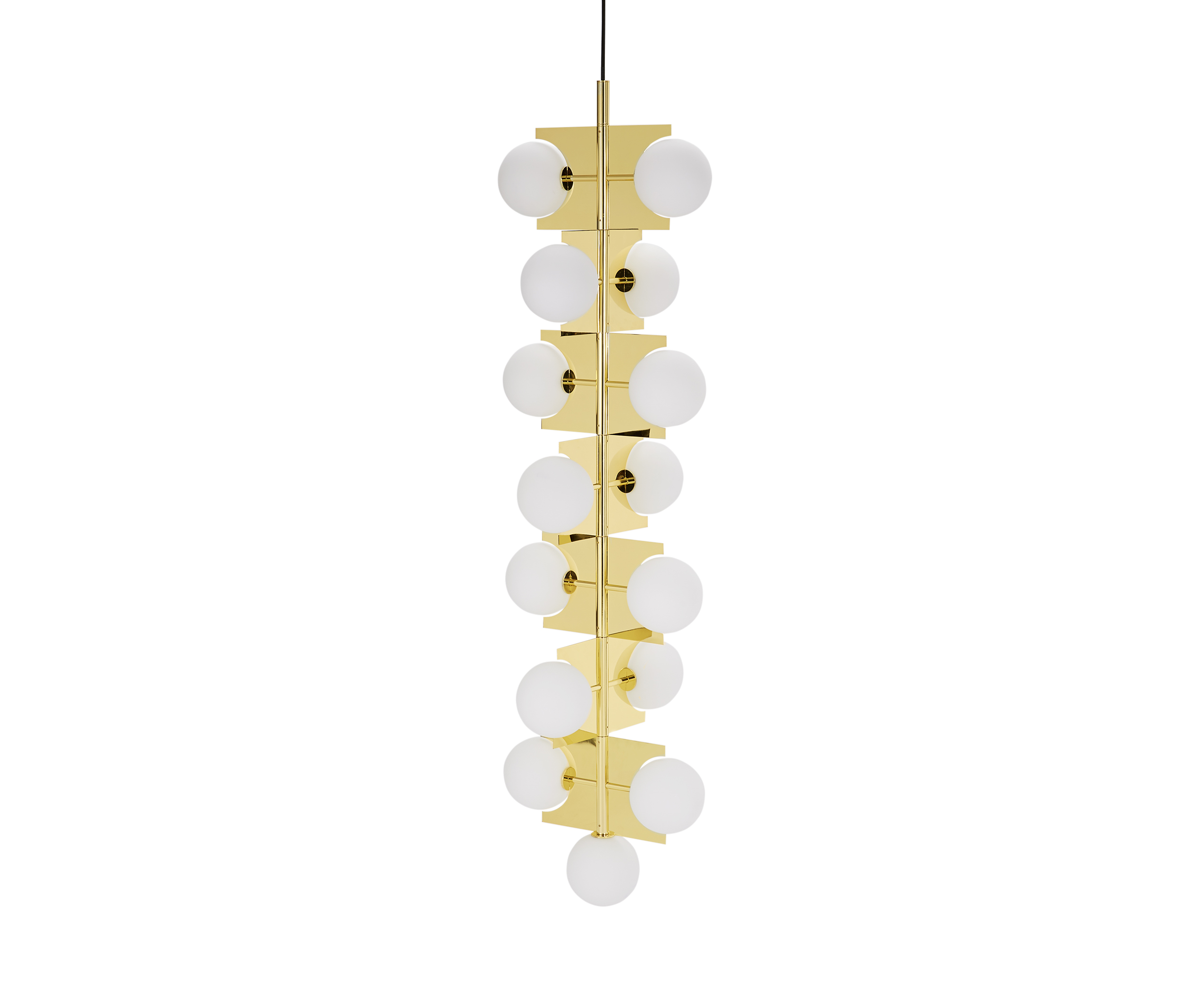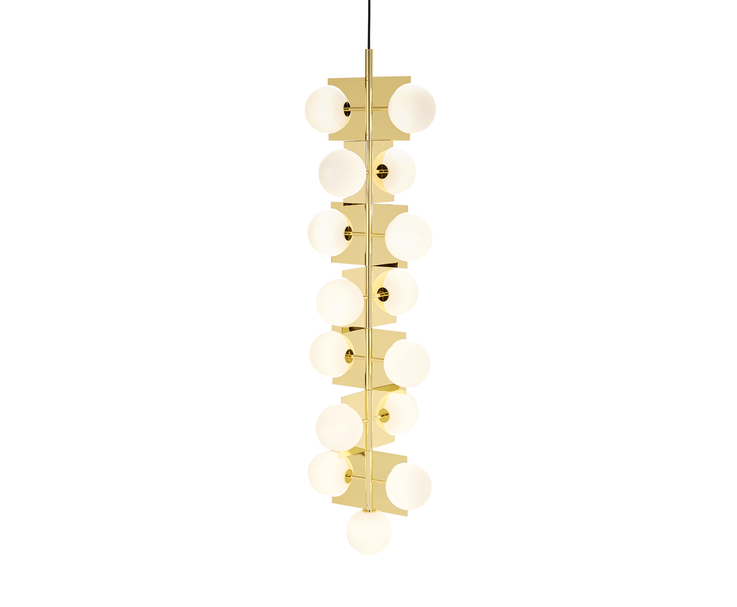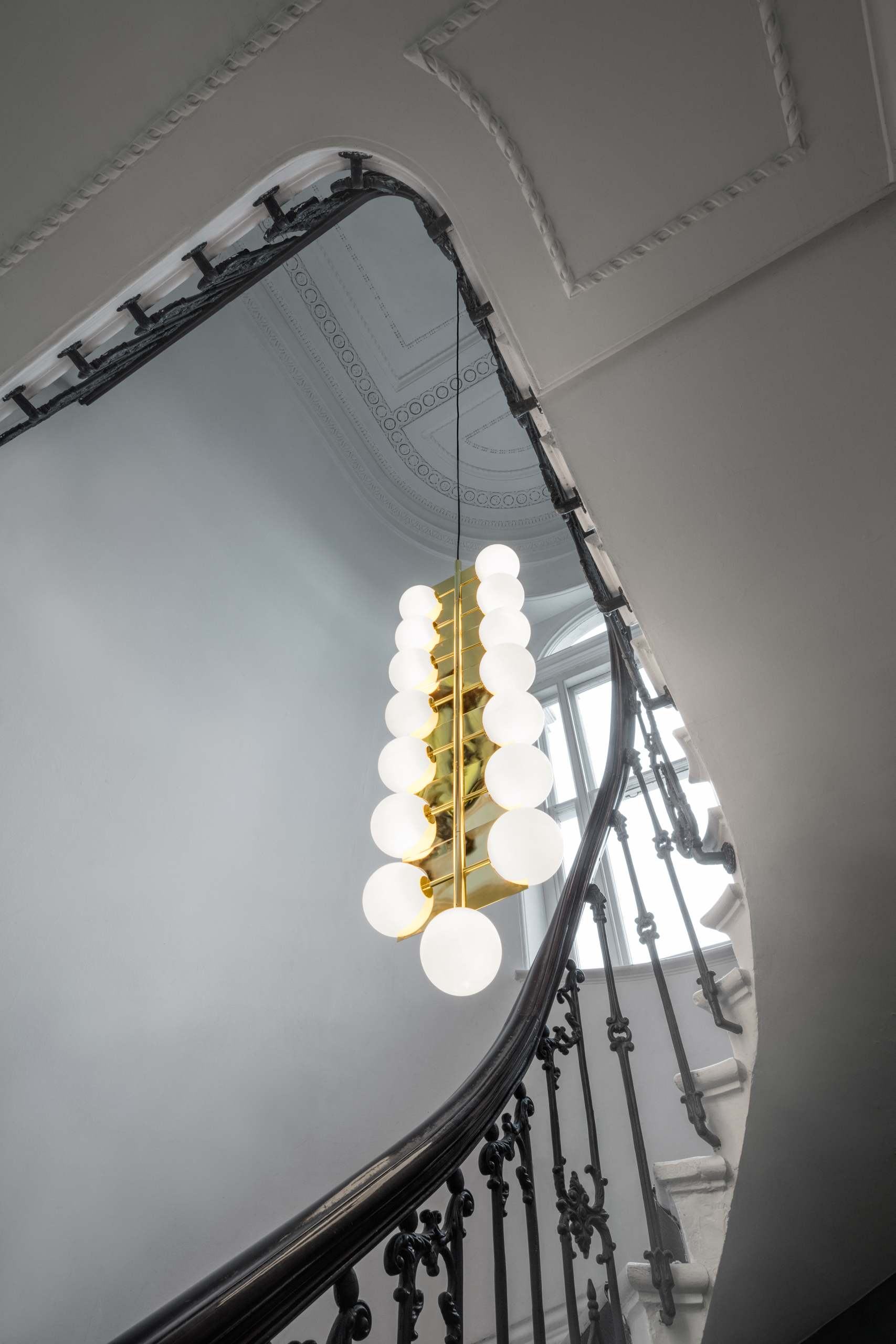 A brass-plated statement drop chandelier comprising of 15 double-layered white glass spheres distributed seven rotating planes. This space-filling chandelier creates a dramatic feature in any staircase, lobby, atriums or high-ceilinged environments.