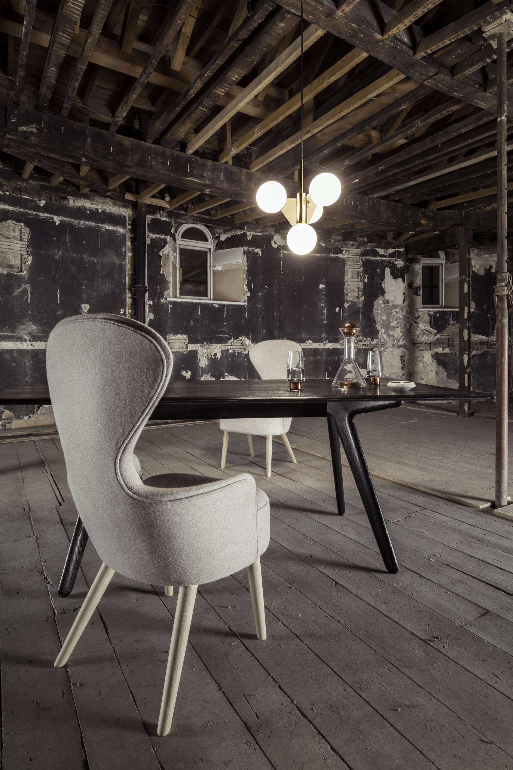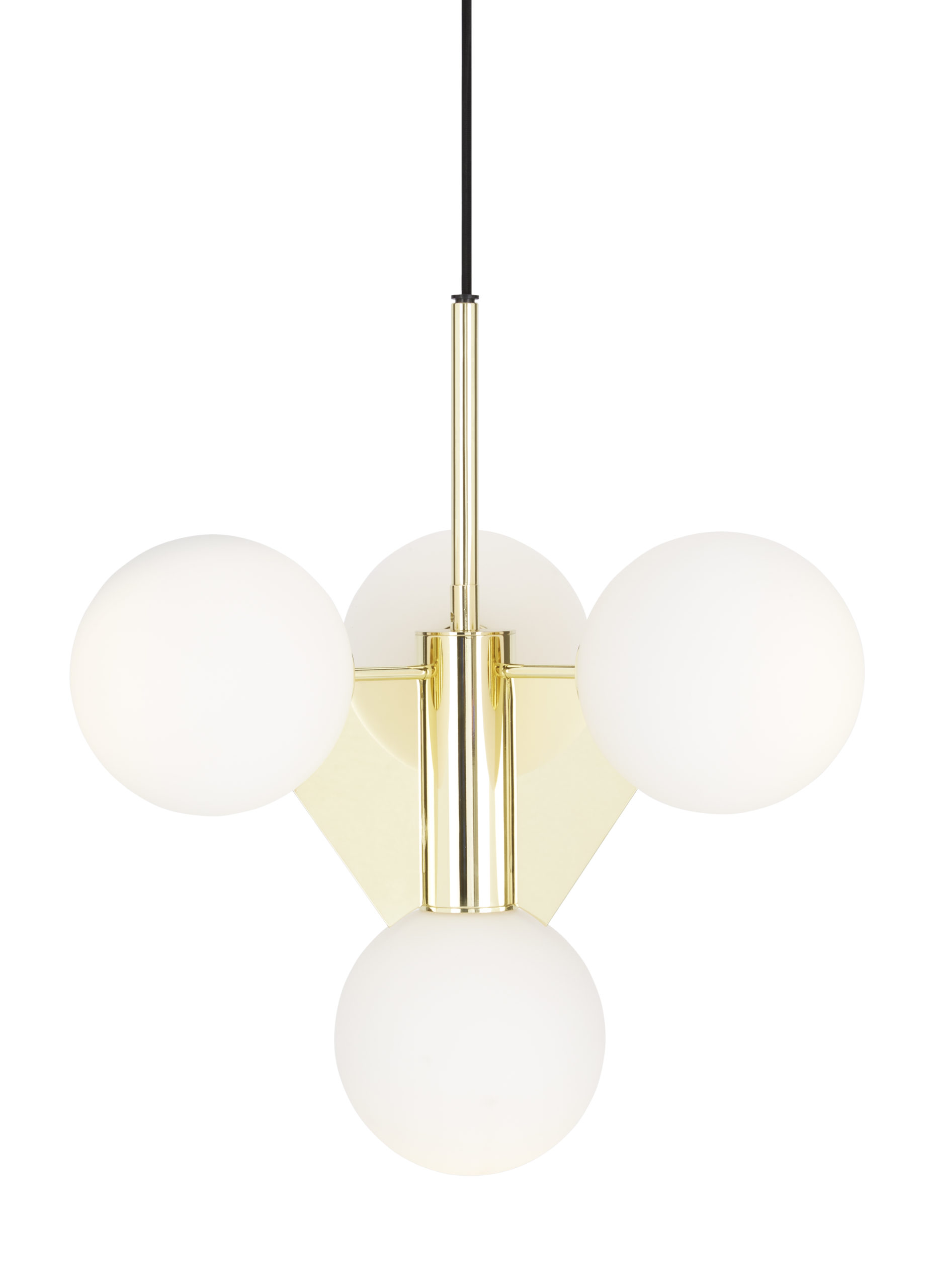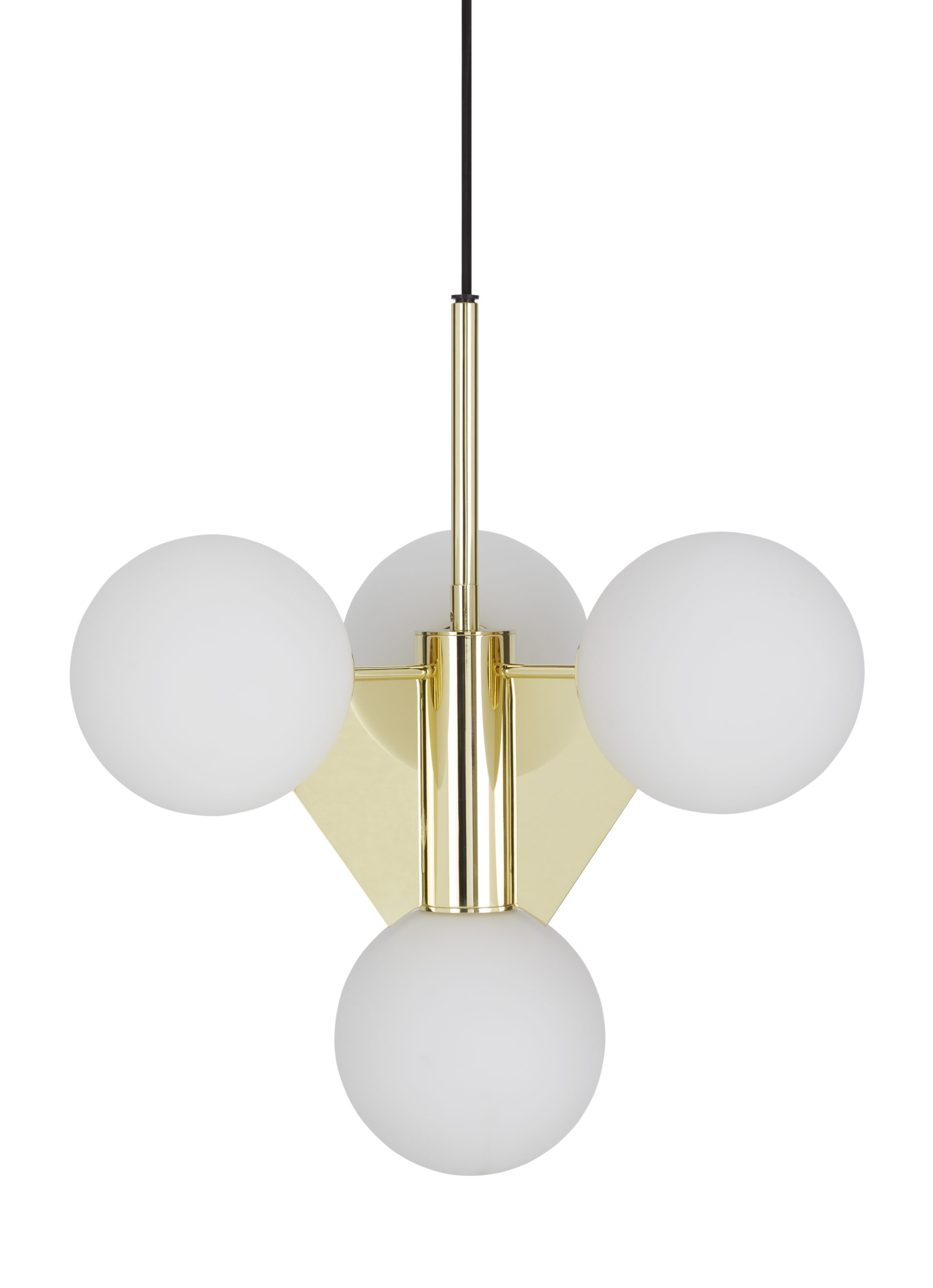 This new short version of the original Plane Chandelier still retains the dramatic features of the original. A brass-plated steel frame clutching 4 glass spheres that creates a statement feature in more intimate settings such as above dining tables, in restaurants or smaller lobby spaces. It also works well with multiples hung in a row.