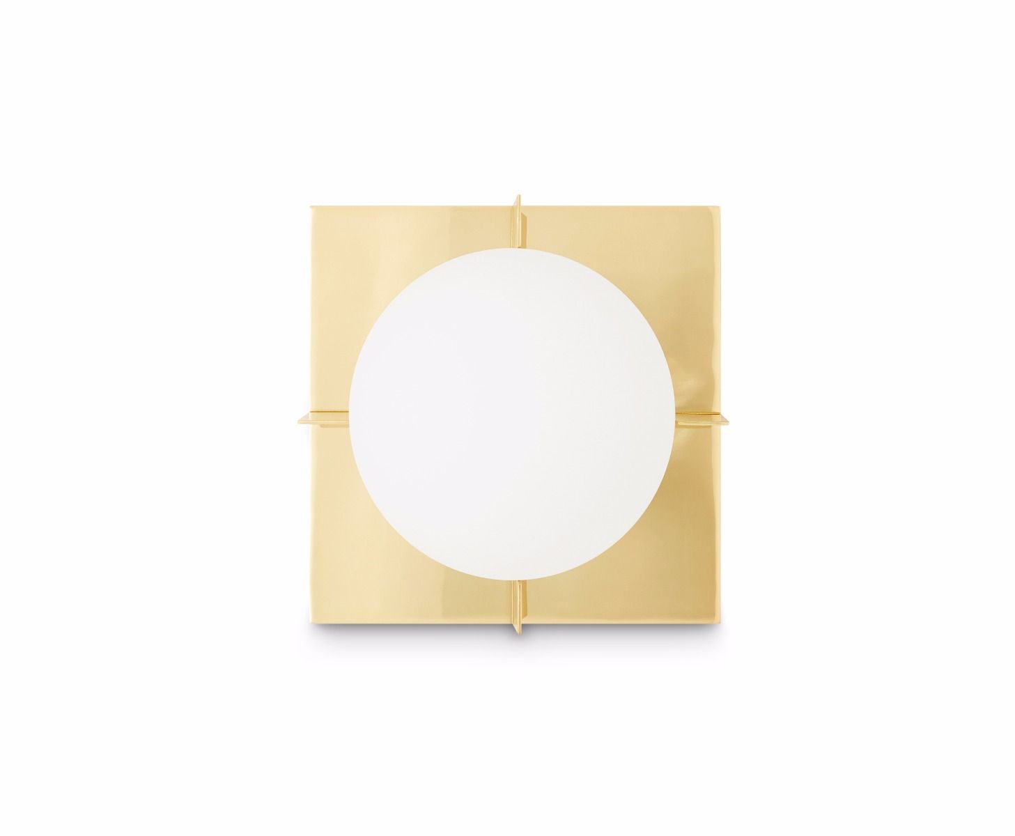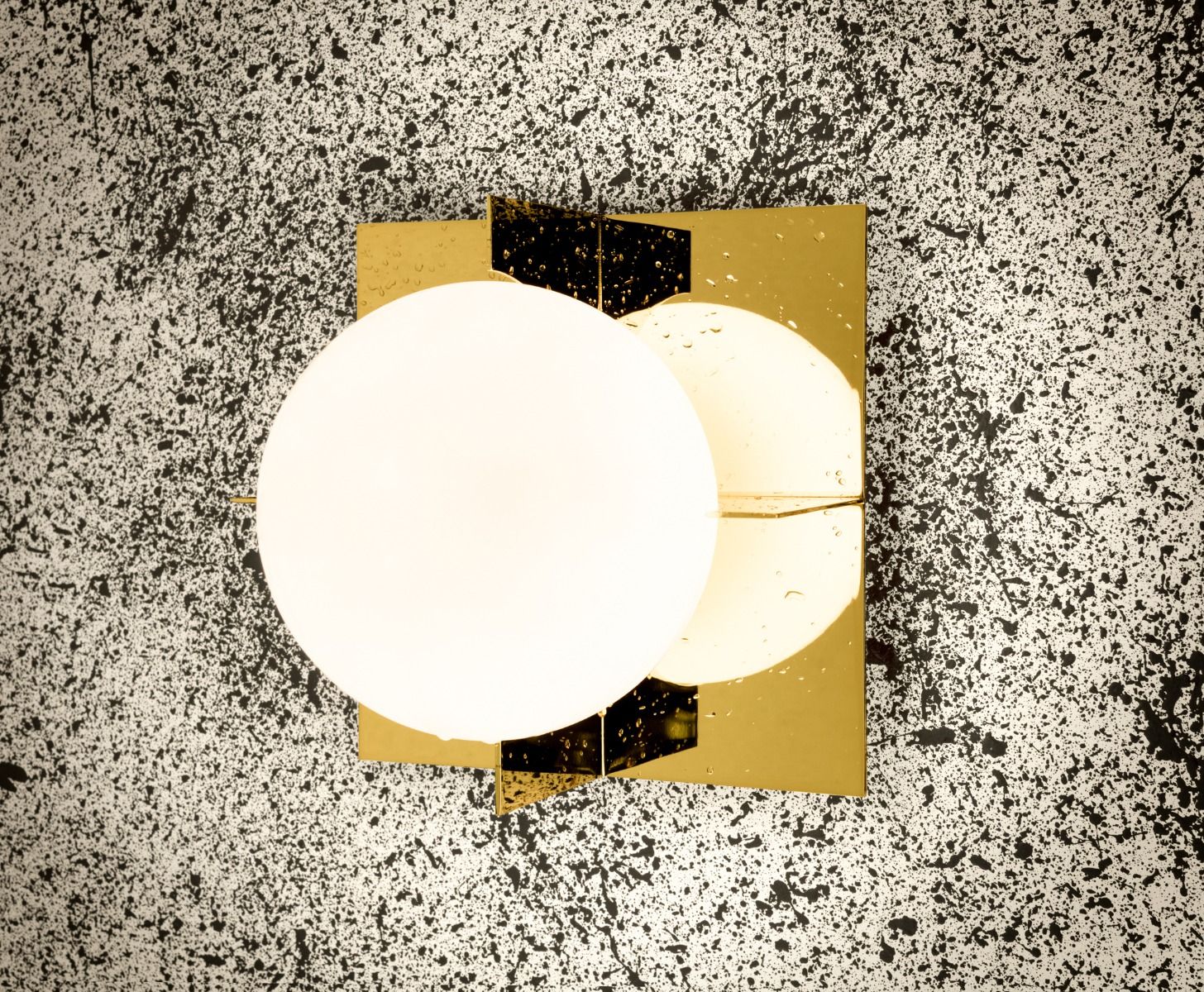 Minimalist yet expressive, our Plane wall lamp is constructed from two interlocked square brass-plated steel frames that enclose a double-layered white glass sphere. Plane wall emits a soft ambient light and can be used in multiple configurations either on the wall or on the ceiling.