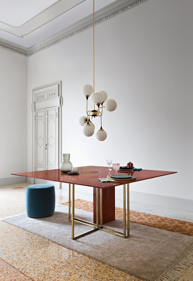 Dining tables with metal base with plinth. Tops in different models and dimensions.