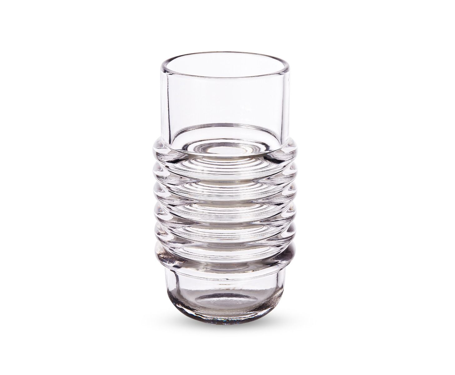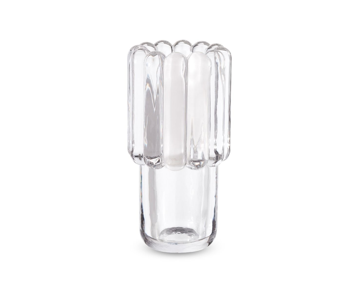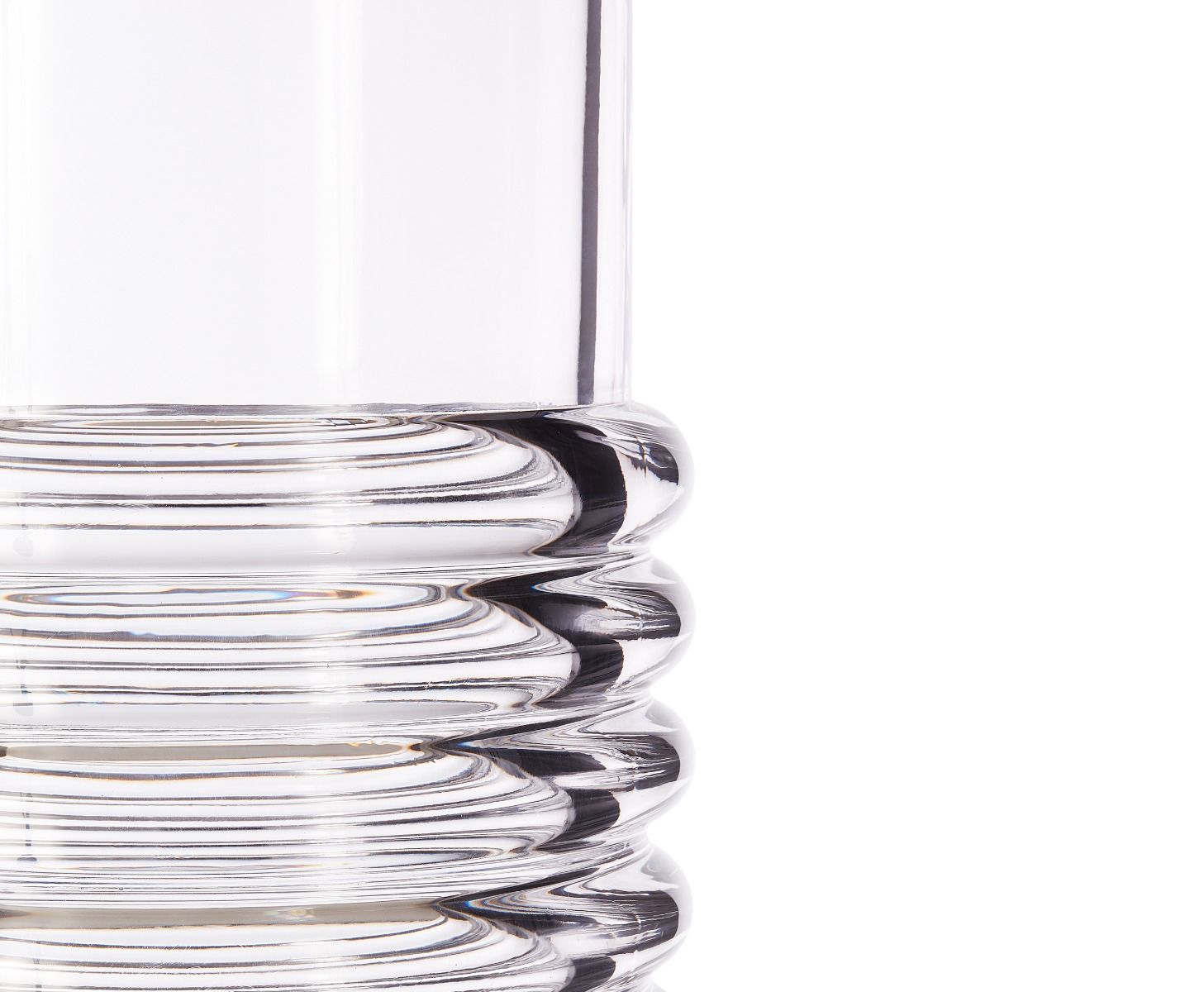 The thickest industrially Pressed glass artefacts designed and engineered to catch and refract light, and to last for ever. Press is a series of heavyweight grooved vases, bowls and candleholders made of fat, chunky coils of pure and clear transparent glass. Bold in silhouette and simple in function they are manufactured by dropping big globs of molten glass at 1,200 degrees centigrade and Pressed in two or three part iron moulds to create immediately familiar silhouettes.