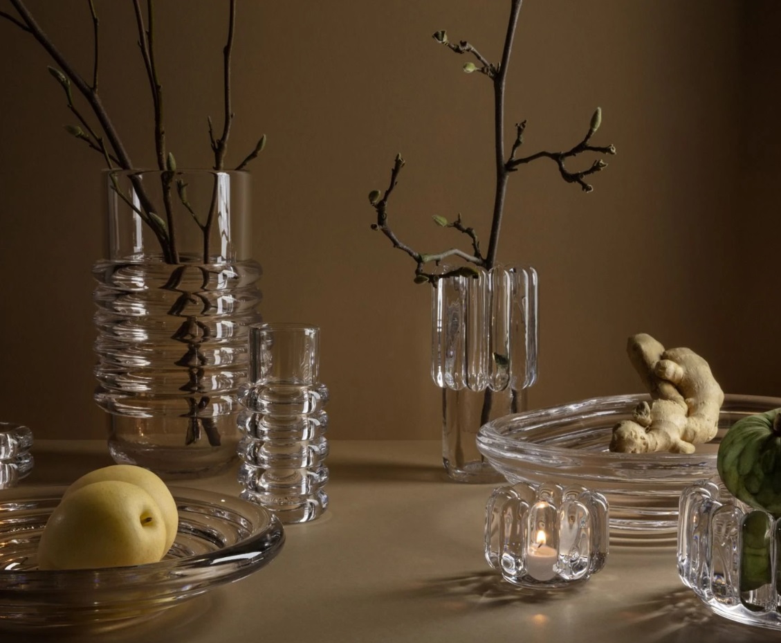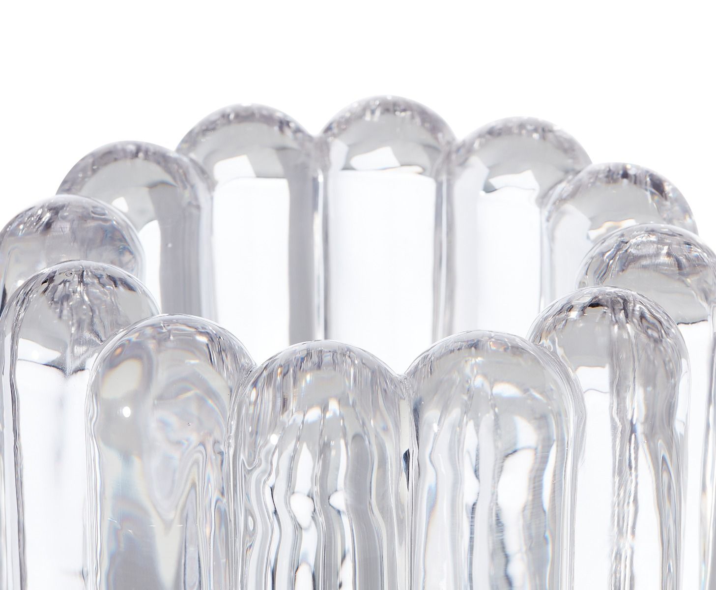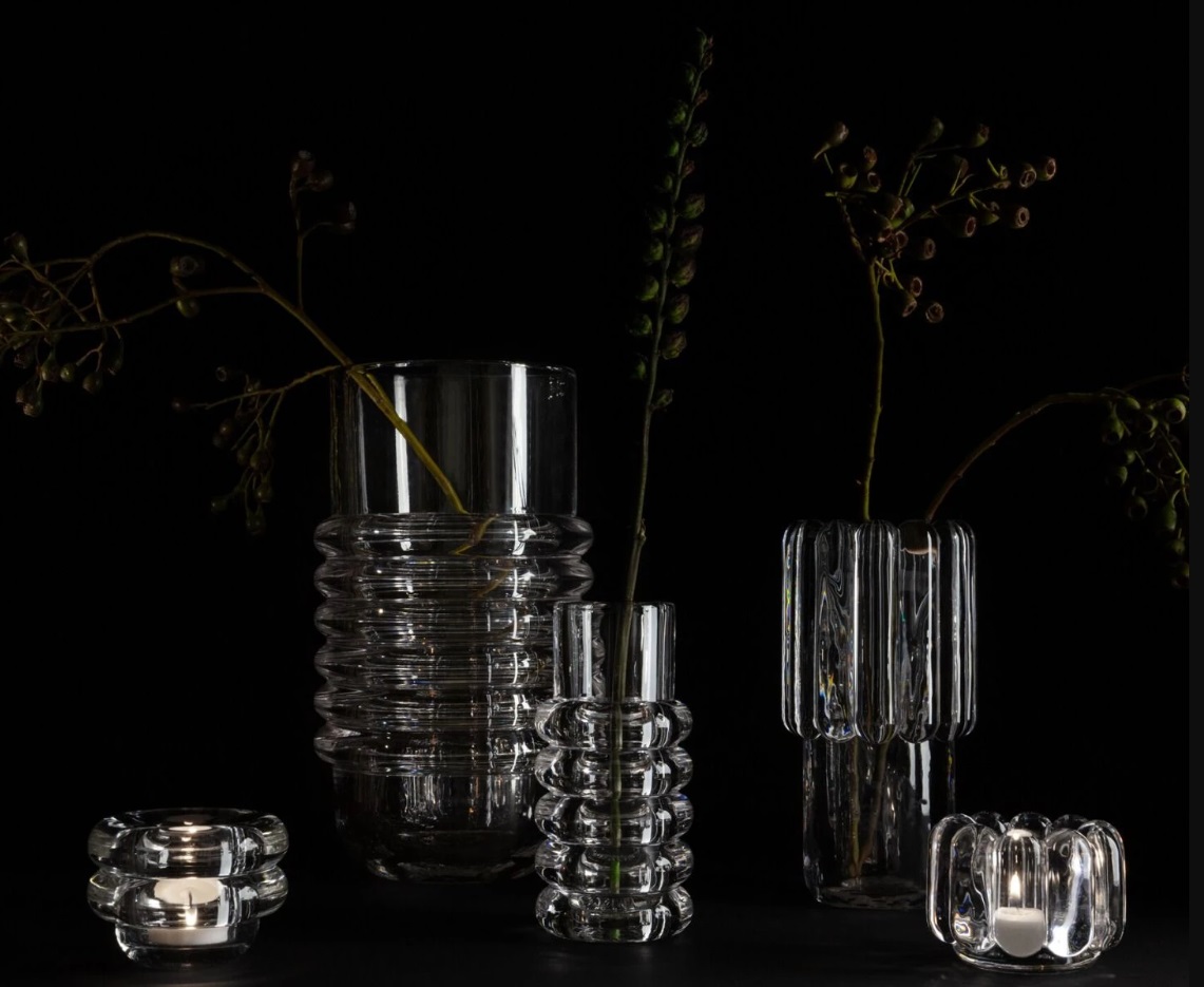 The thickest industrially Pressed glass artefacts designed and engineered to catch and refract light, and to last for ever. Press is a series of heavyweight grooved vases, bowls and candleholders made of fat, chunky coils of pure and clear transparent glass. Bold in silhouette and simple in function they are manufactured by dropping big globs of molten glass at 1,200 degrees centigrade and Pressed in two or three part iron moulds to create immediately familiar silhouettes.