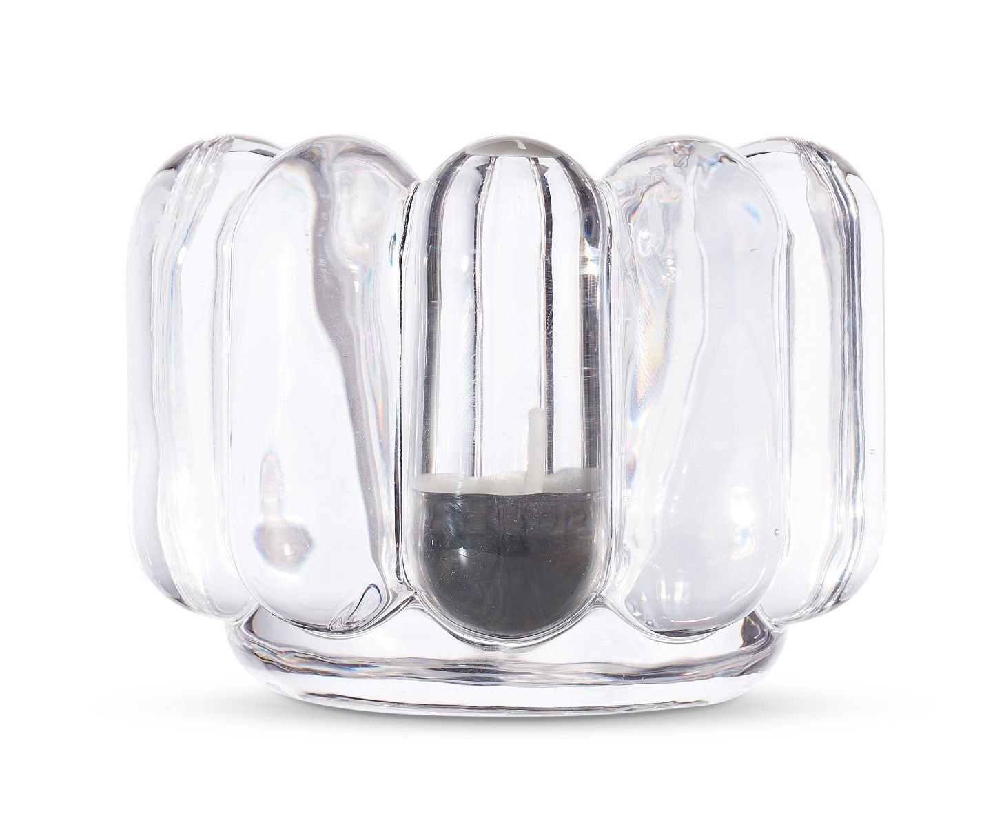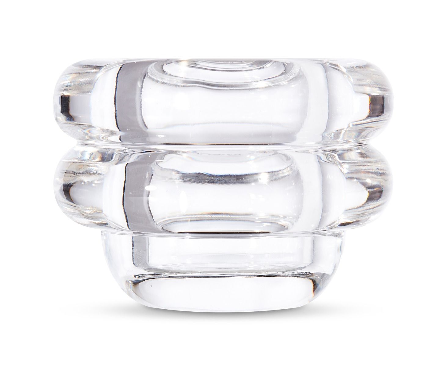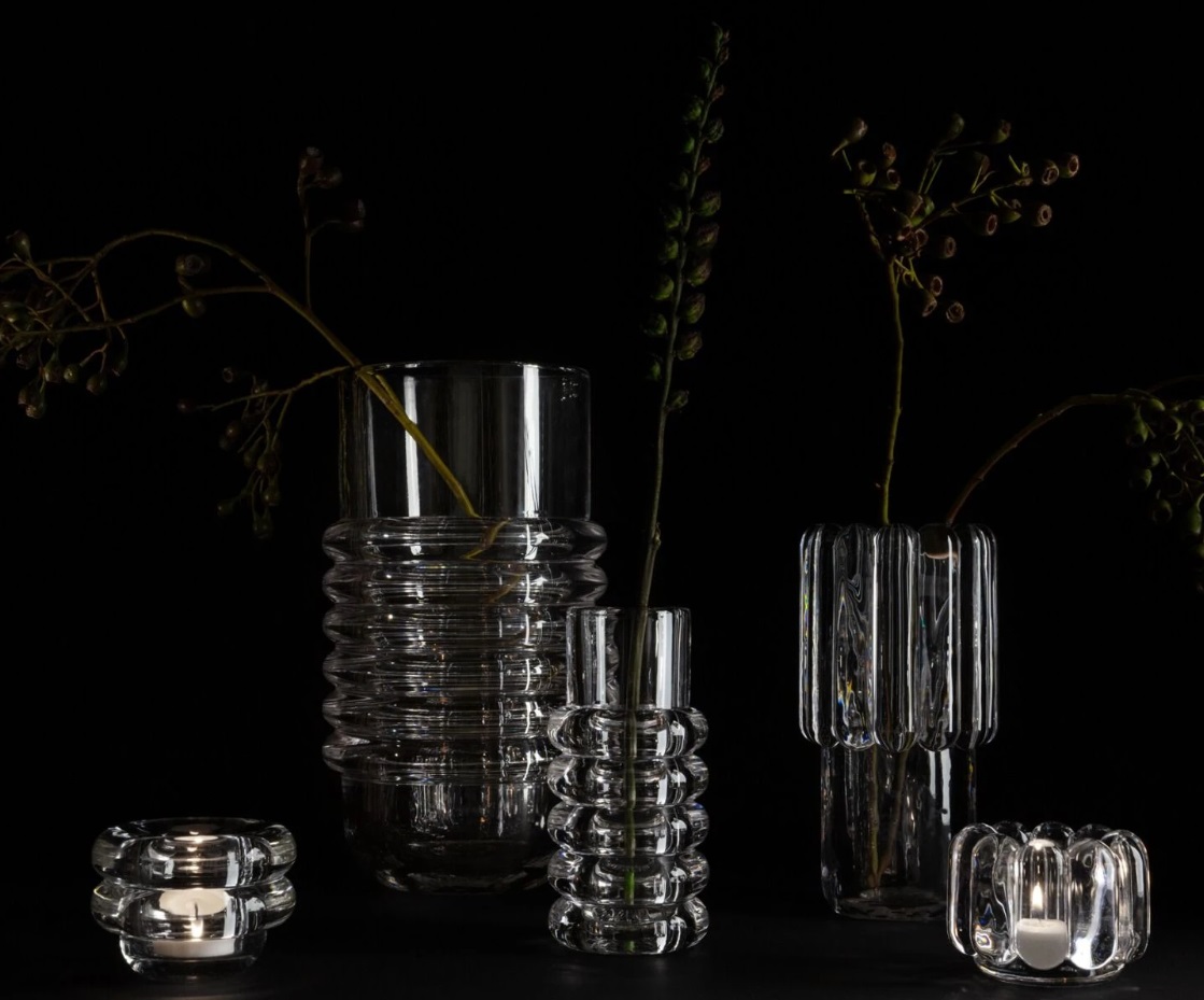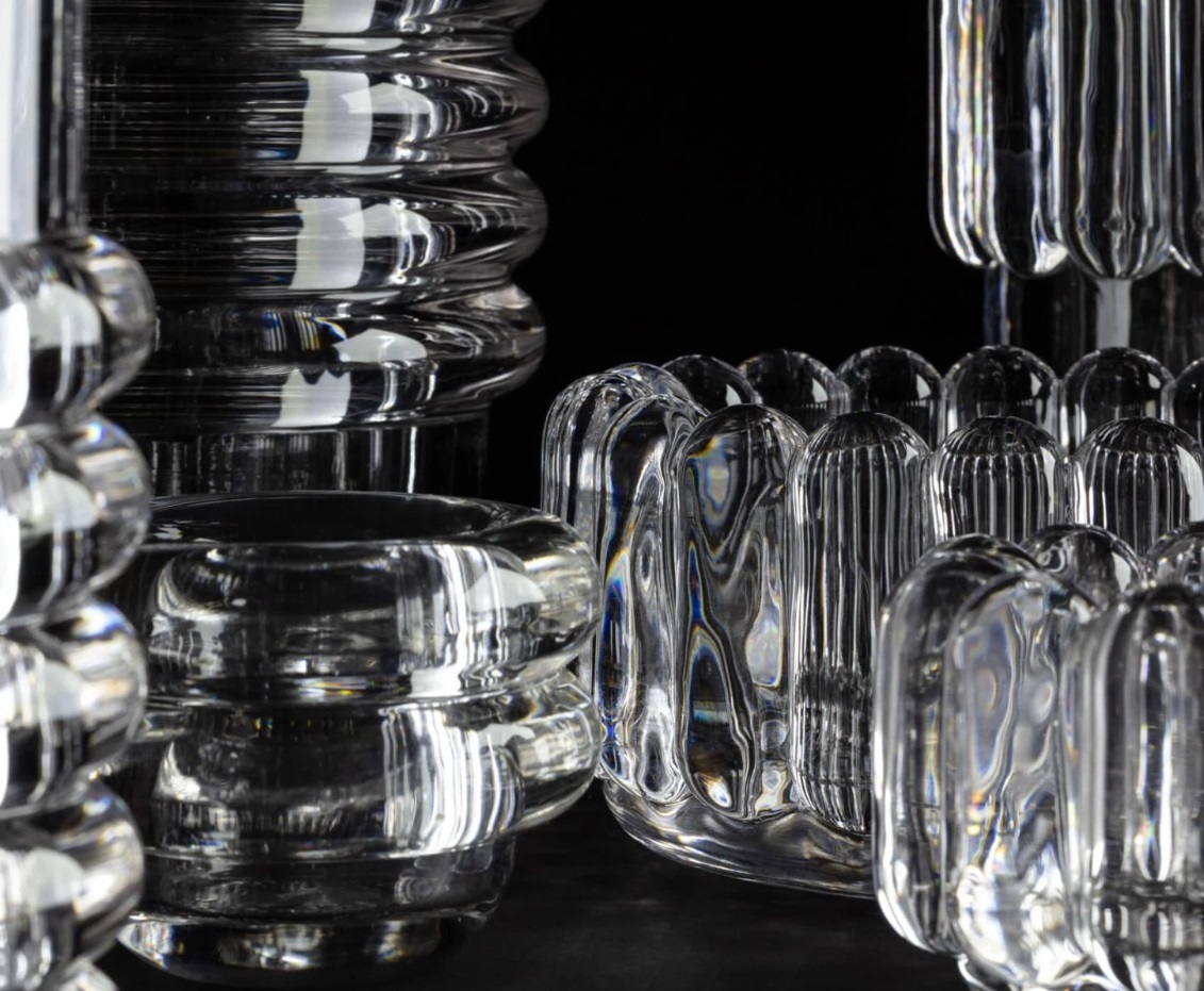 The thickest industrially Pressed glass artefacts designed and engineered to catch and refract light, and to last for ever. Press is a series of heavyweight grooved vases, bowls and candleholders made of fat, chunky coils of pure and clear transparent glass. Bold in silhouette and simple in function they are manufactured by dropping big globs of molten glass at 1,200 degrees centigrade and Pressed in two or three part iron moulds to create immediately familiar silhouettes.