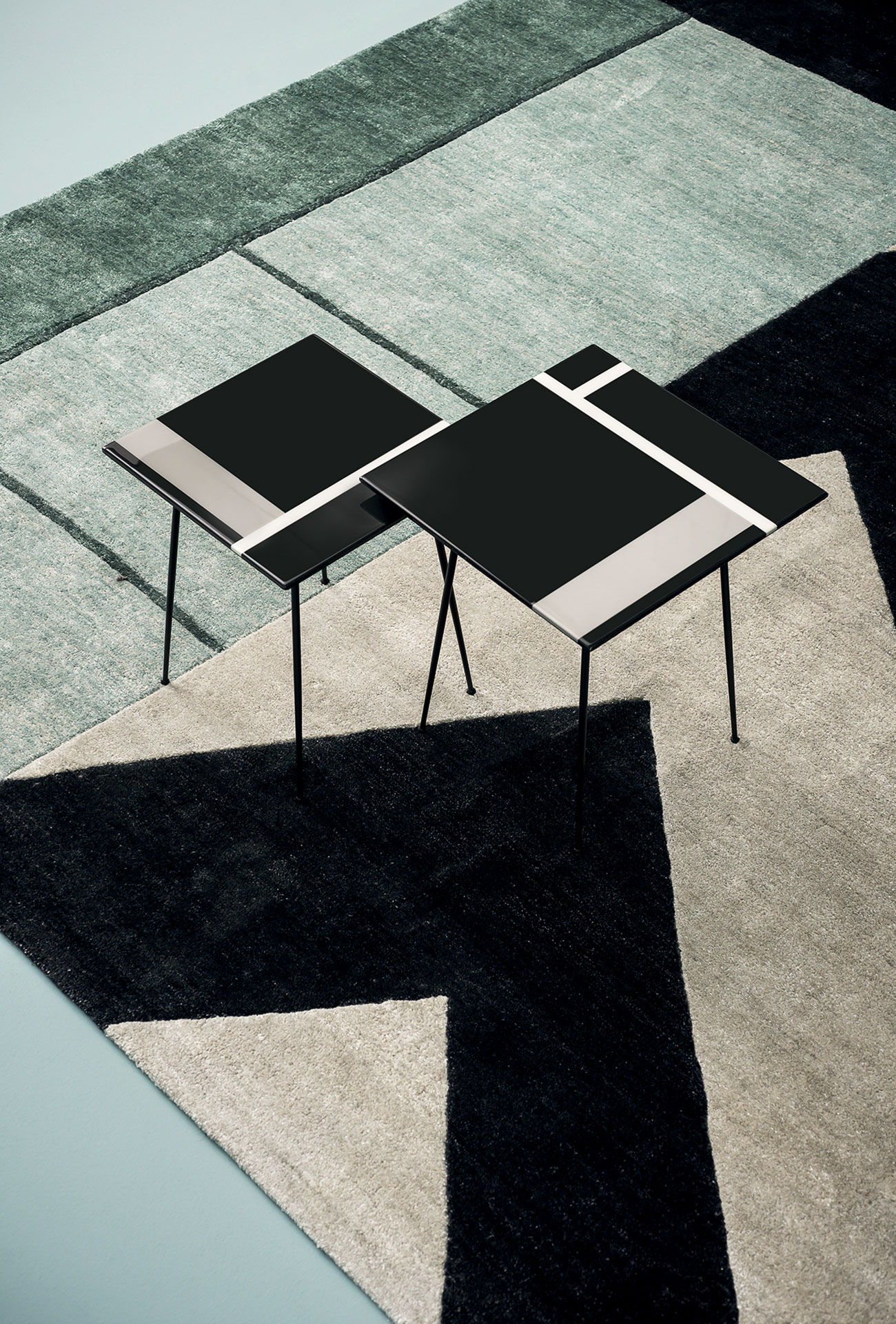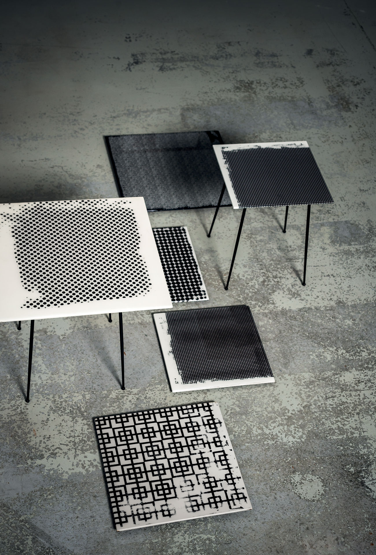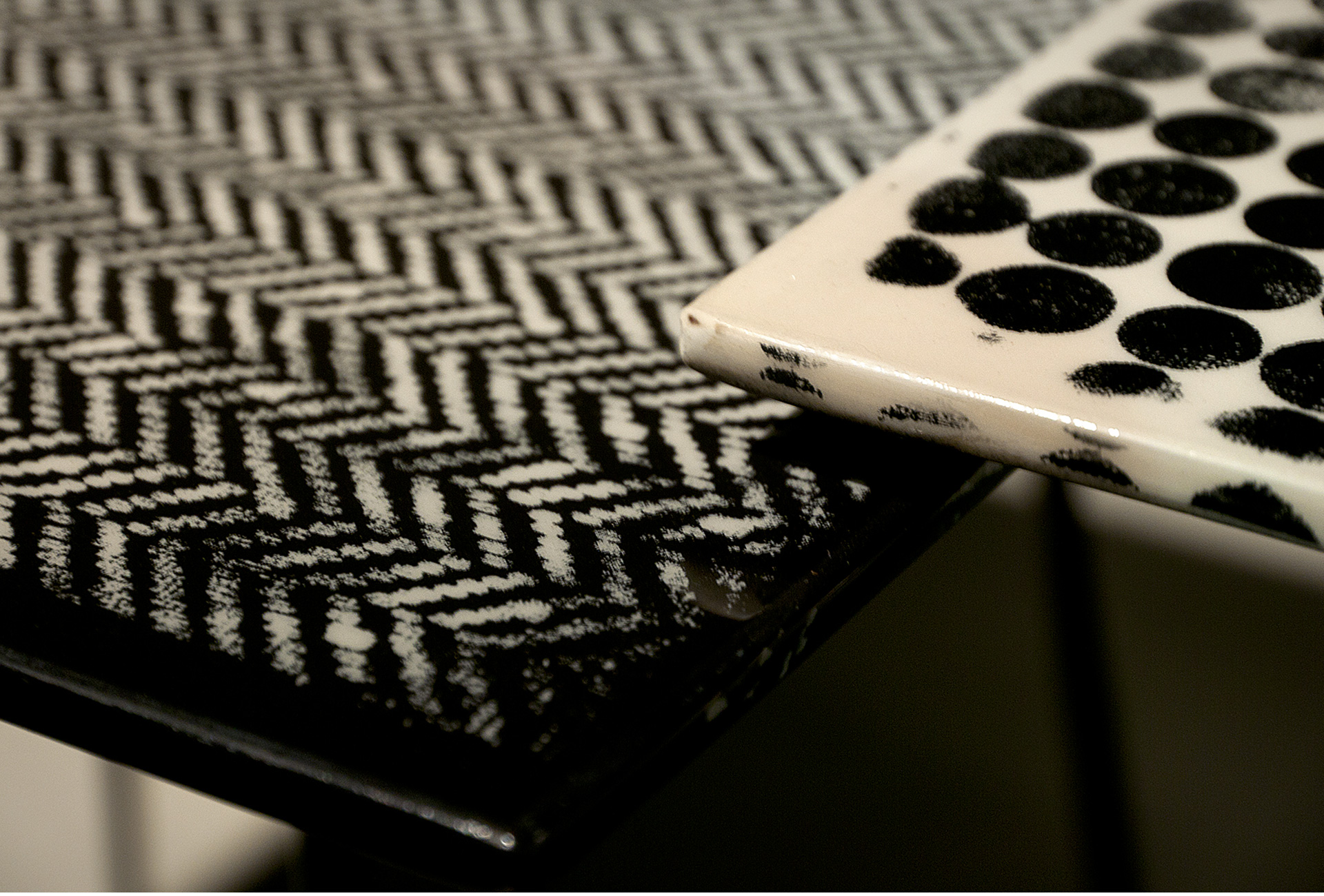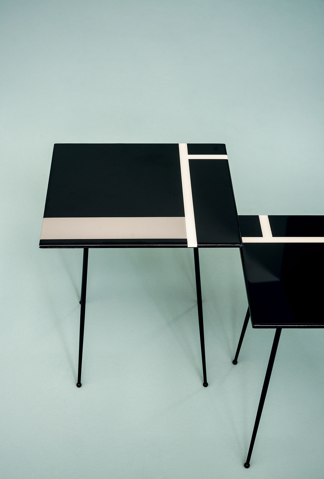 Black satin-finish lacquered base. Smoothed MDF top, 19 mm thickness, decorated by hand with resins in line with the artist’s creativity and lacquered. Surfaces created by hand as “pictures”; each item will therefore be different and unique.