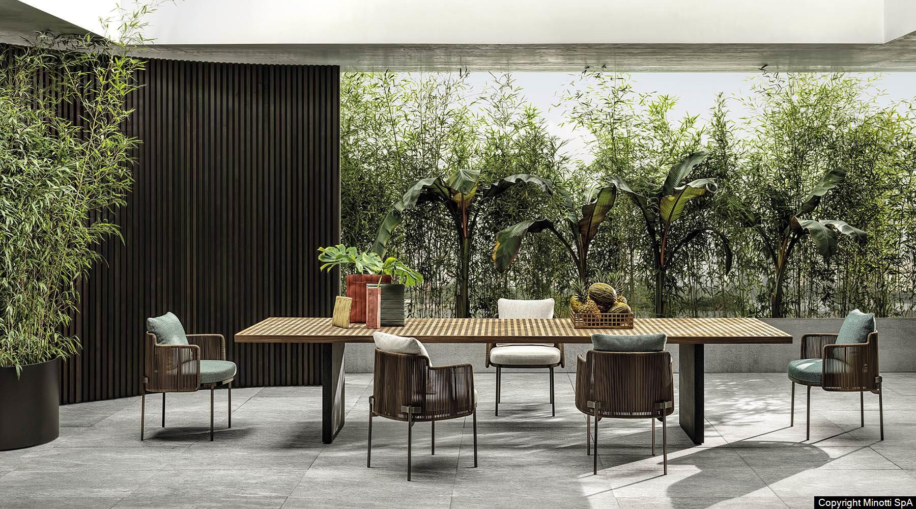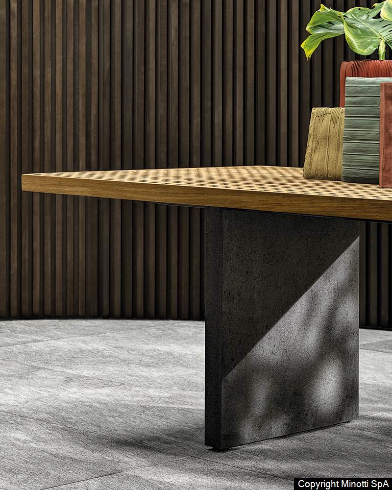 The table comes in three dimensions, and features a top set on aluminium legs, designed as two panels that cross it on the short side. It sports a striking Lava Stone Powder finish, generating an interesting contrast between the surfaces and the Teak wood of the top.