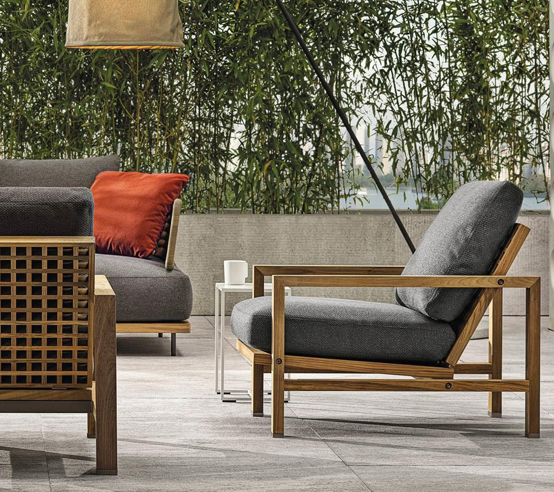 The Teak structure, with metal details in Bronze finish, have straight armrests and accommodate the padded cushions of the backrest and seat.