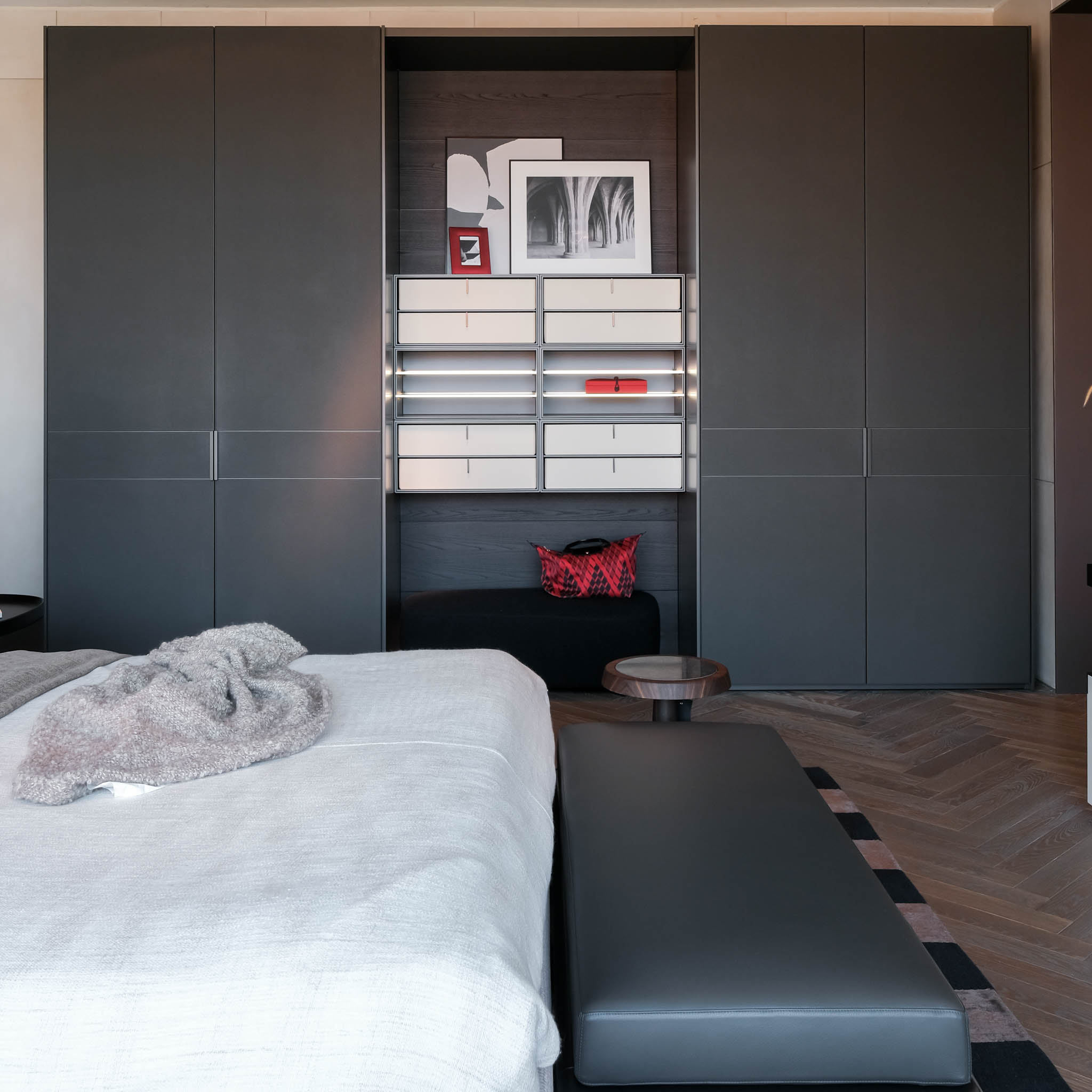 Finishing: Structure/Back Panel: Mat Ardesia 02, Wall Paneling: Black Elm (for Quid) & BackPanels/Structure: Canvas Grigio Mel. Front Edge Canvas Grigio Mel., Equipment: Canvas Grigio Mel, Side Finish: Mat Visone 48, Handle Finish: M197 Fitted Ardesia €M1 M207 Fitted Ardesia Anta Cover (for Cover)
