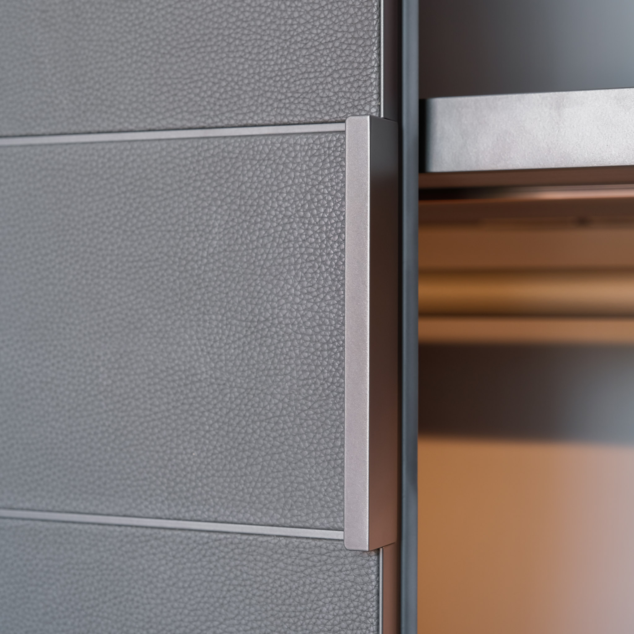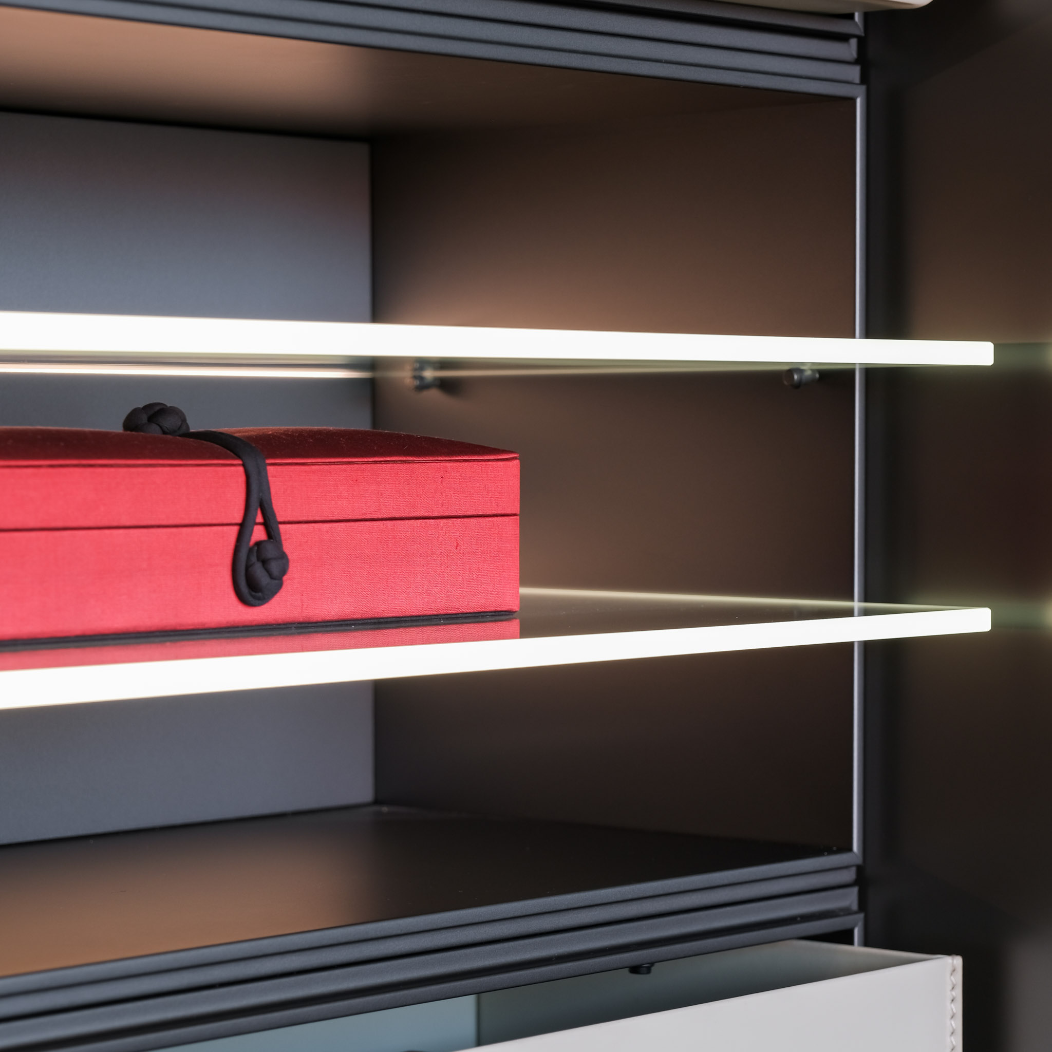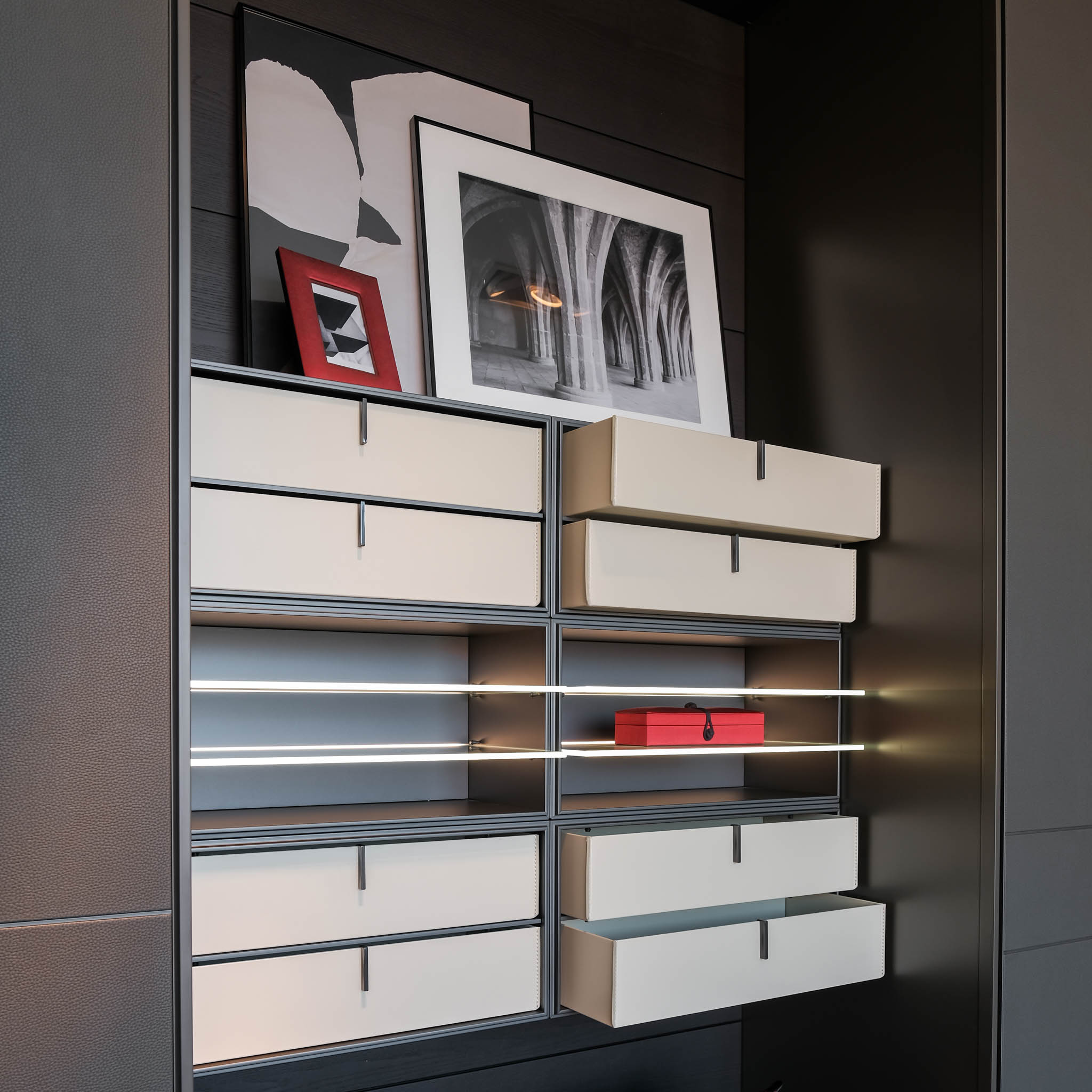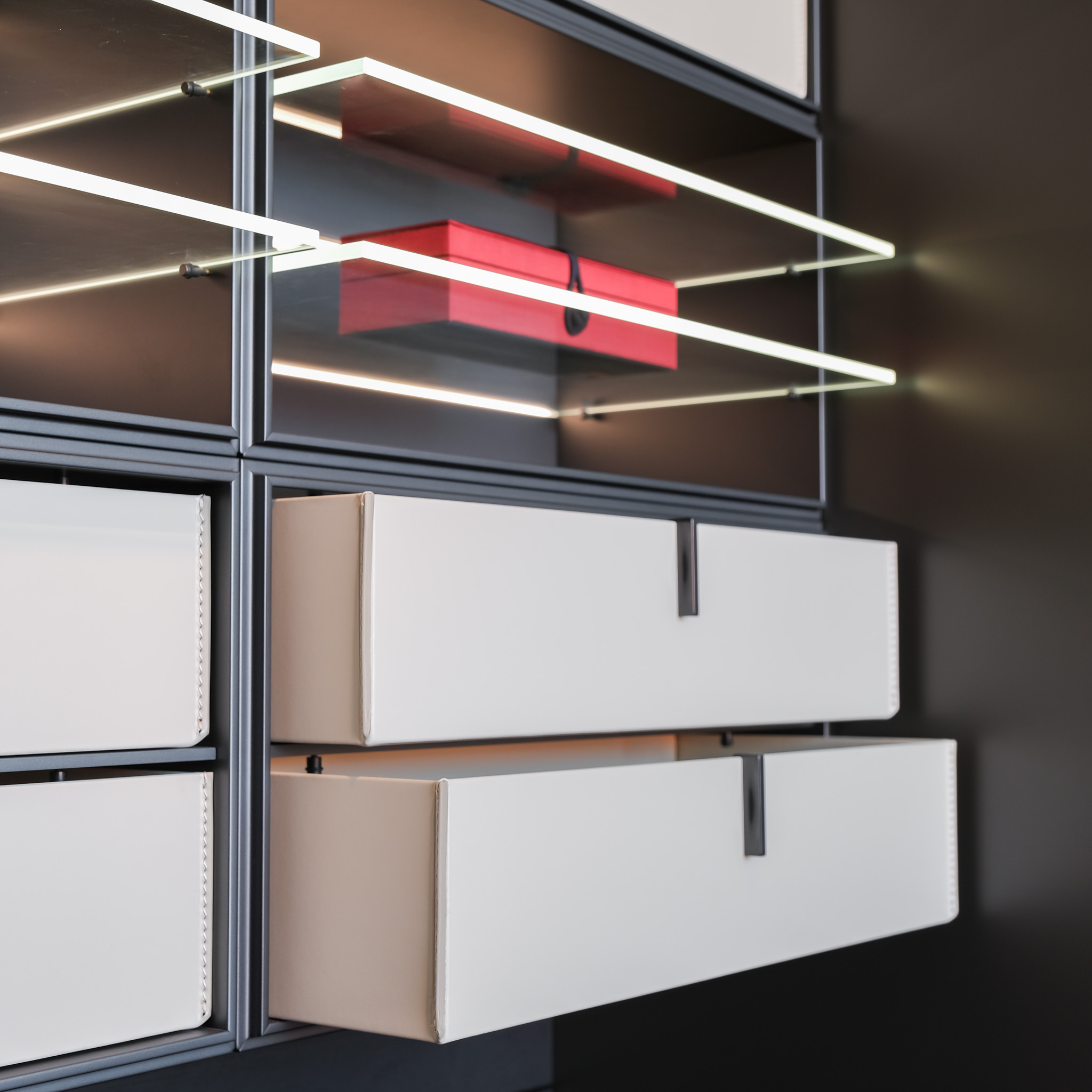 Structure: Glass Shelves: Mat Ardesia 02, Profile/Drawers: Glossy Brown Nickel (for Quid) & Glass Shelves: 3050 Glass Fume, Wooden Doors: B-T.Pelle 01 Elefante, Shelves: Canvas Grigio Mel, Bottom Top Quid: Mat Visone 48, Plinth/Hardware: Ardesia, Profiles: Front Mat Visone 48 mm.27, Handle Chest of Drawers: Track, Front Chest of Drawers: Roller Ardesia €1 Ardesia Mel. (for Cover)