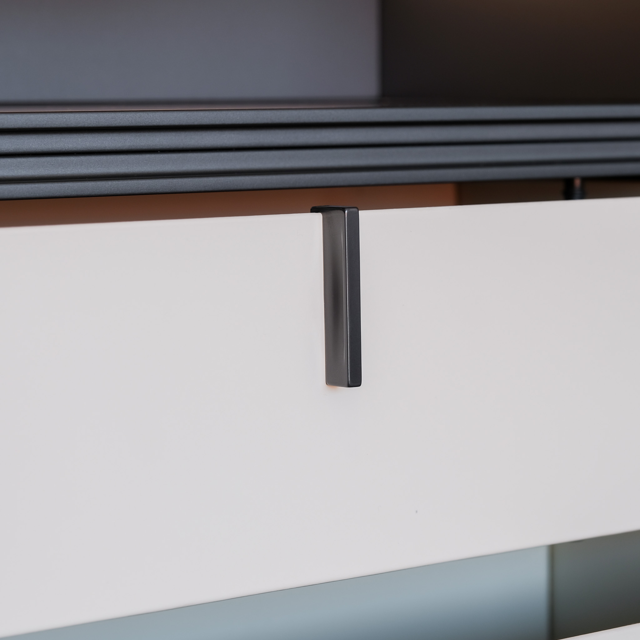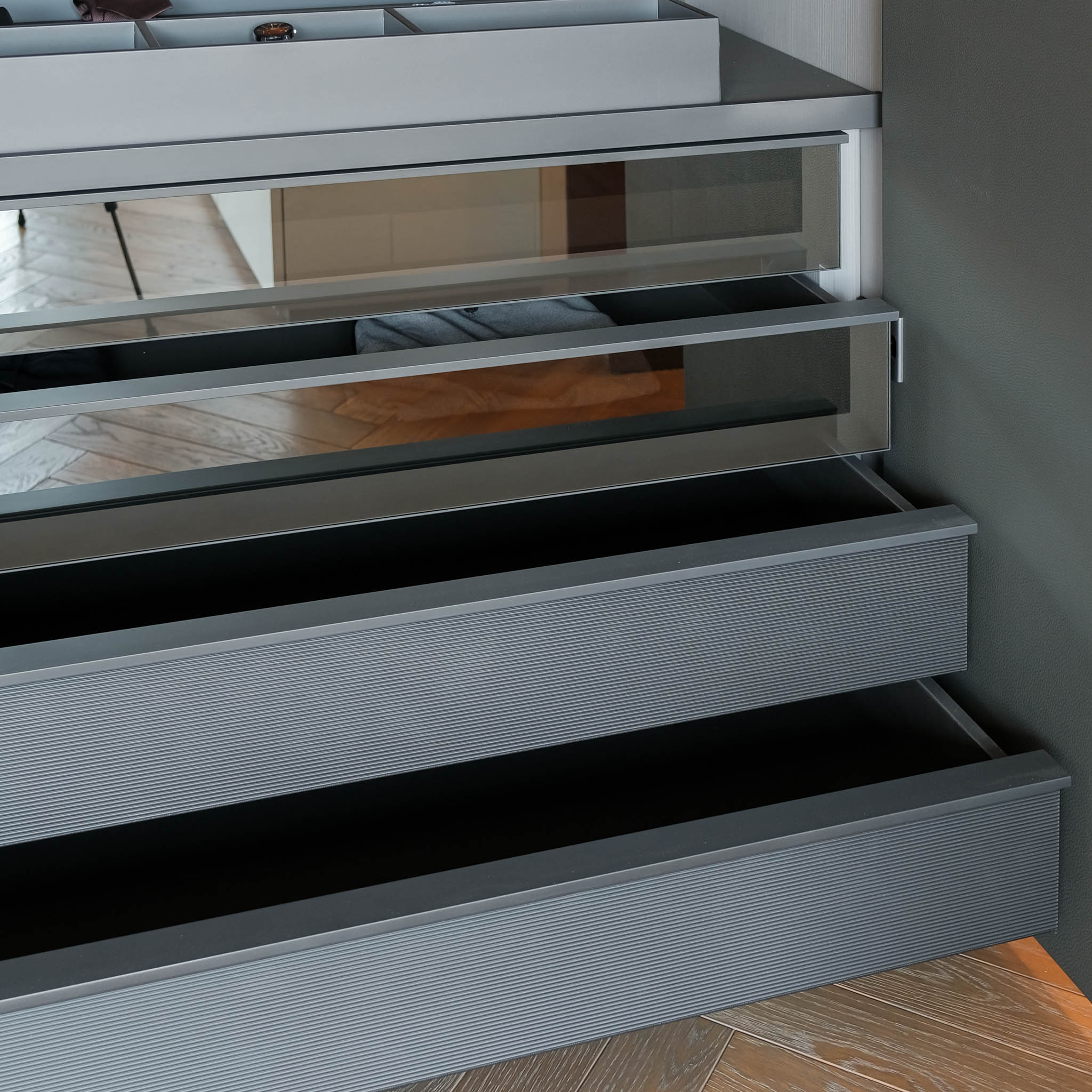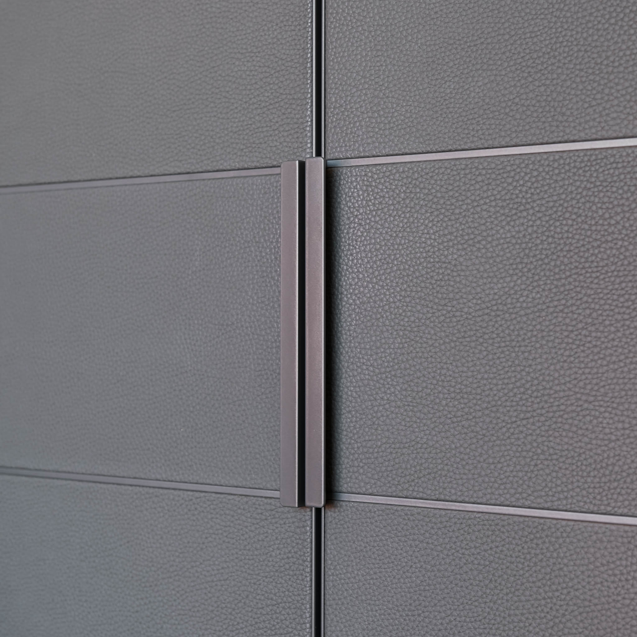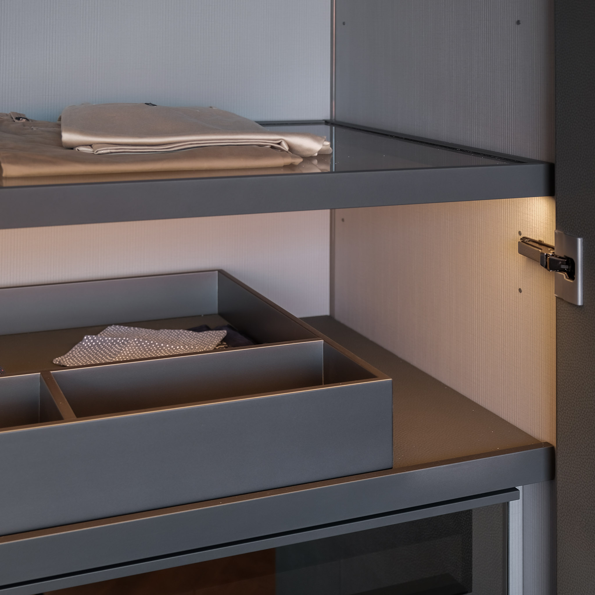 Structure: Glass Shelves: Mat Ardesia 02, Profile/Drawers: Glossy Brown Nickel (for Quid) & Glass Shelves: 3050 Glass Fume, Wooden Doors: B-T.Pelle 01 Elefante, Shelves: Canvas Grigio Mel, Bottom Top Quid: Mat Visone 48, Plinth/Hardware: Ardesia, Profiles: Front Mat Visone 48 mm.27, Handle Chest of Drawers: Track, Front Chest of Drawers: Roller Ardesia €1 Ardesia Mel. (for Cover)