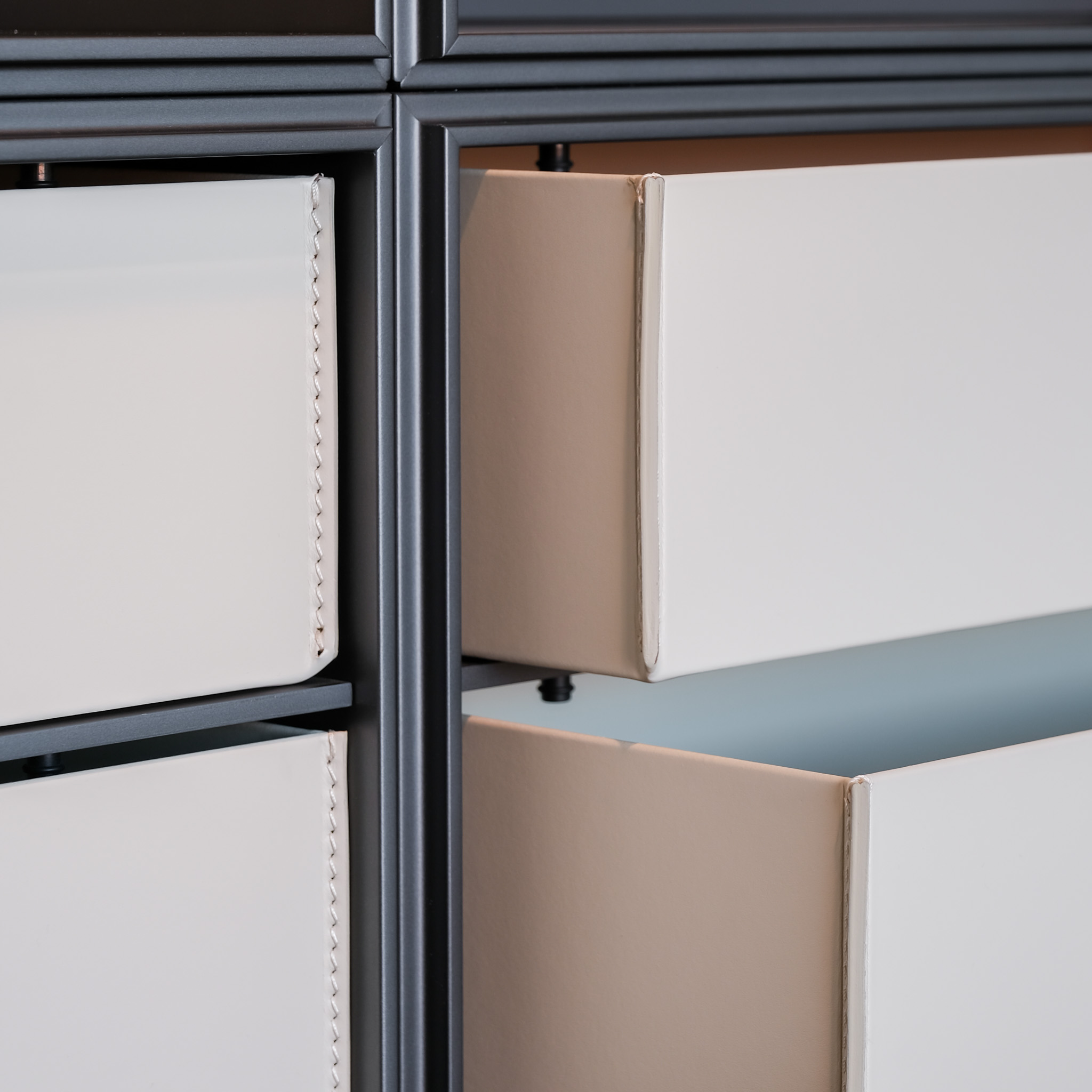 Upholstery: Display Cases Hide Boxes: Hide 28 Avorio (for Quid) & BottomCov/Shelves/Top:B-TPelle01Elefante (for Cover)