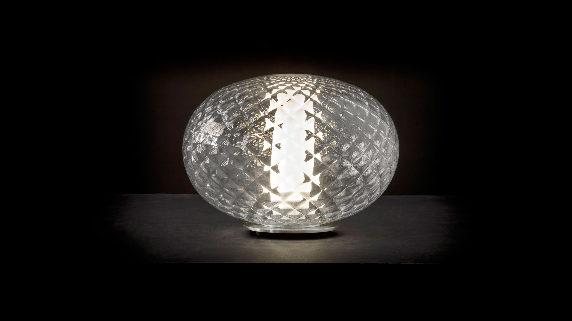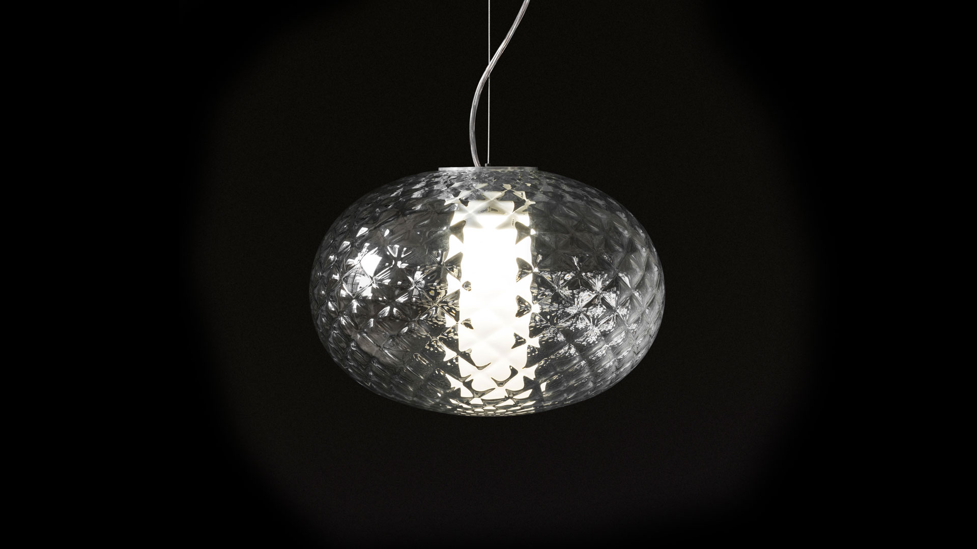 Recuerdo, design by Mariana Pellegrino Soto, is part of a round solid in transparent glass, with an elegant crystal matelassé or quilted effect, inside which the LED light source is protected by a frosted glass cylinder, creating plays of light and reflections inside the space. Recuerdo includes a single suspension lamp version and a table lamp, where the sphere is supported by a chrome metal disc.