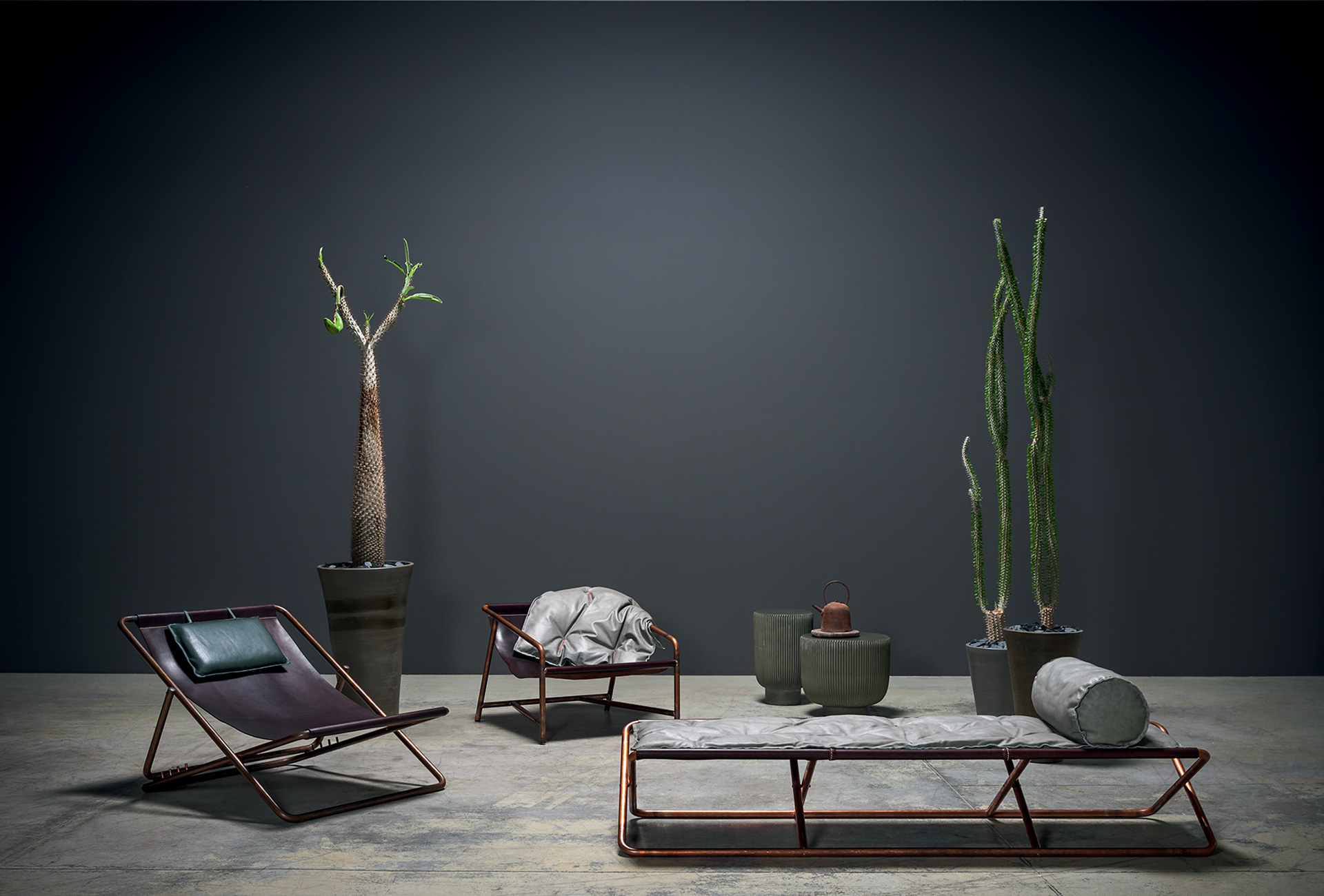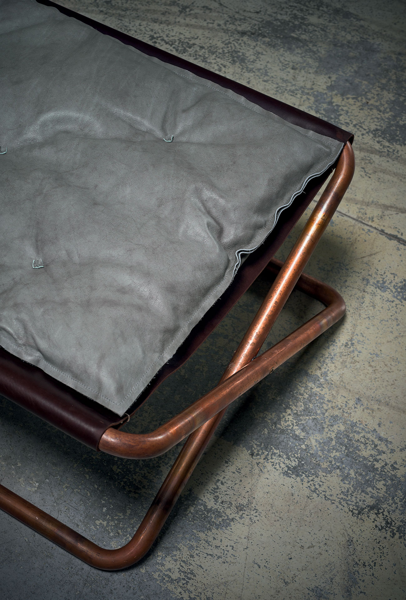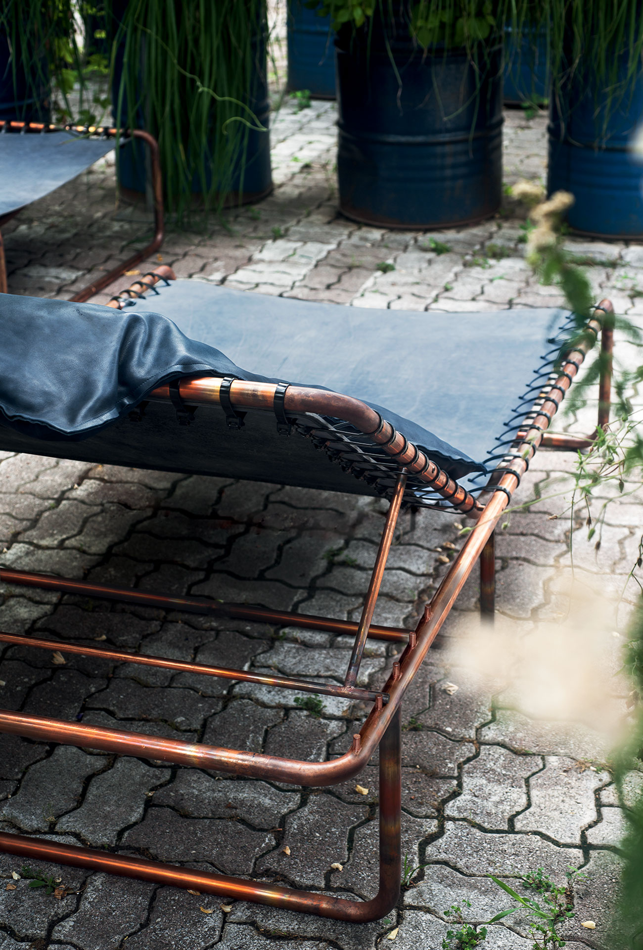 Reclining beach lounger. Etched copper tubular frame. Seat and backrest are fastened to the structure through some polyamide clamps resistant to UV rays.
