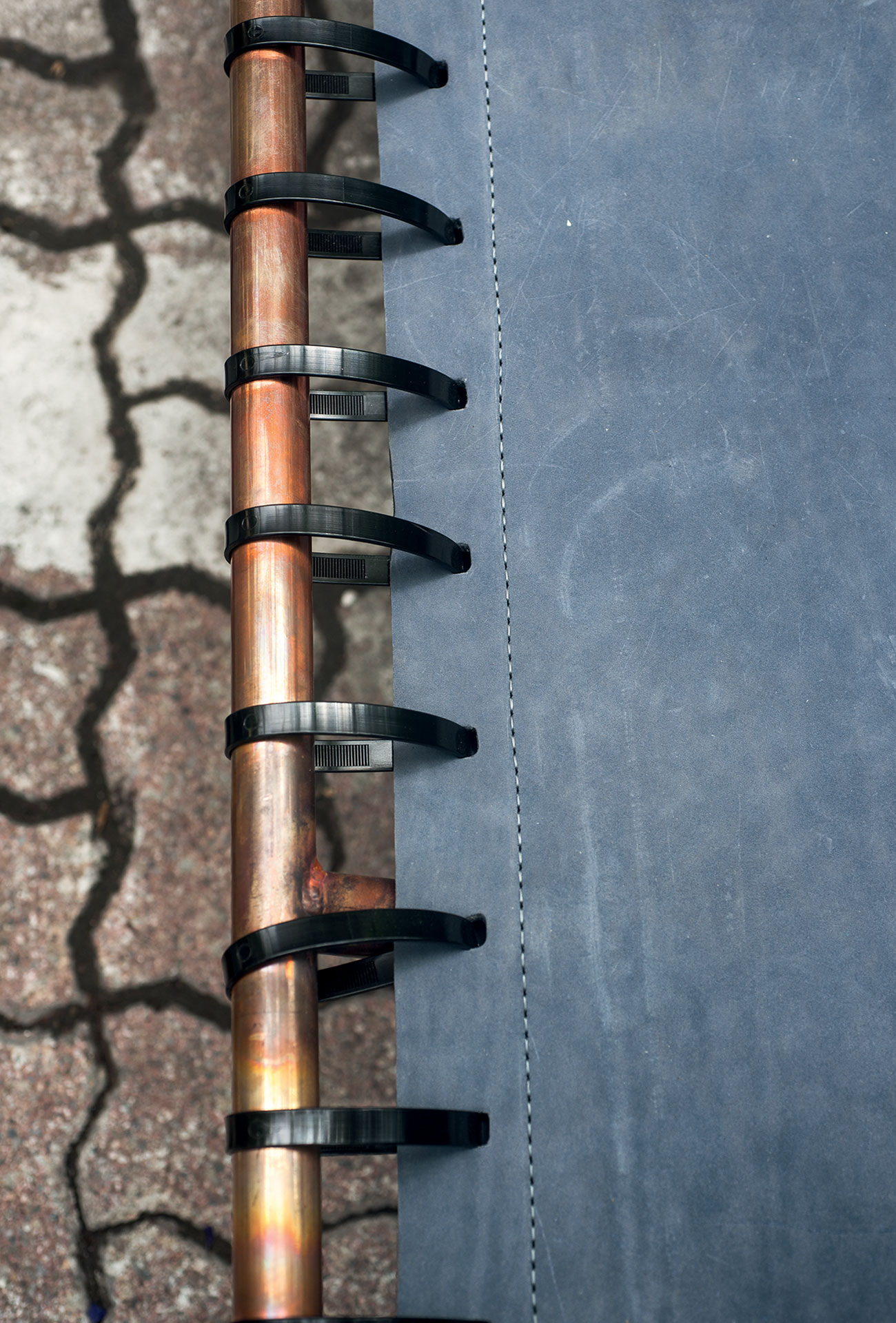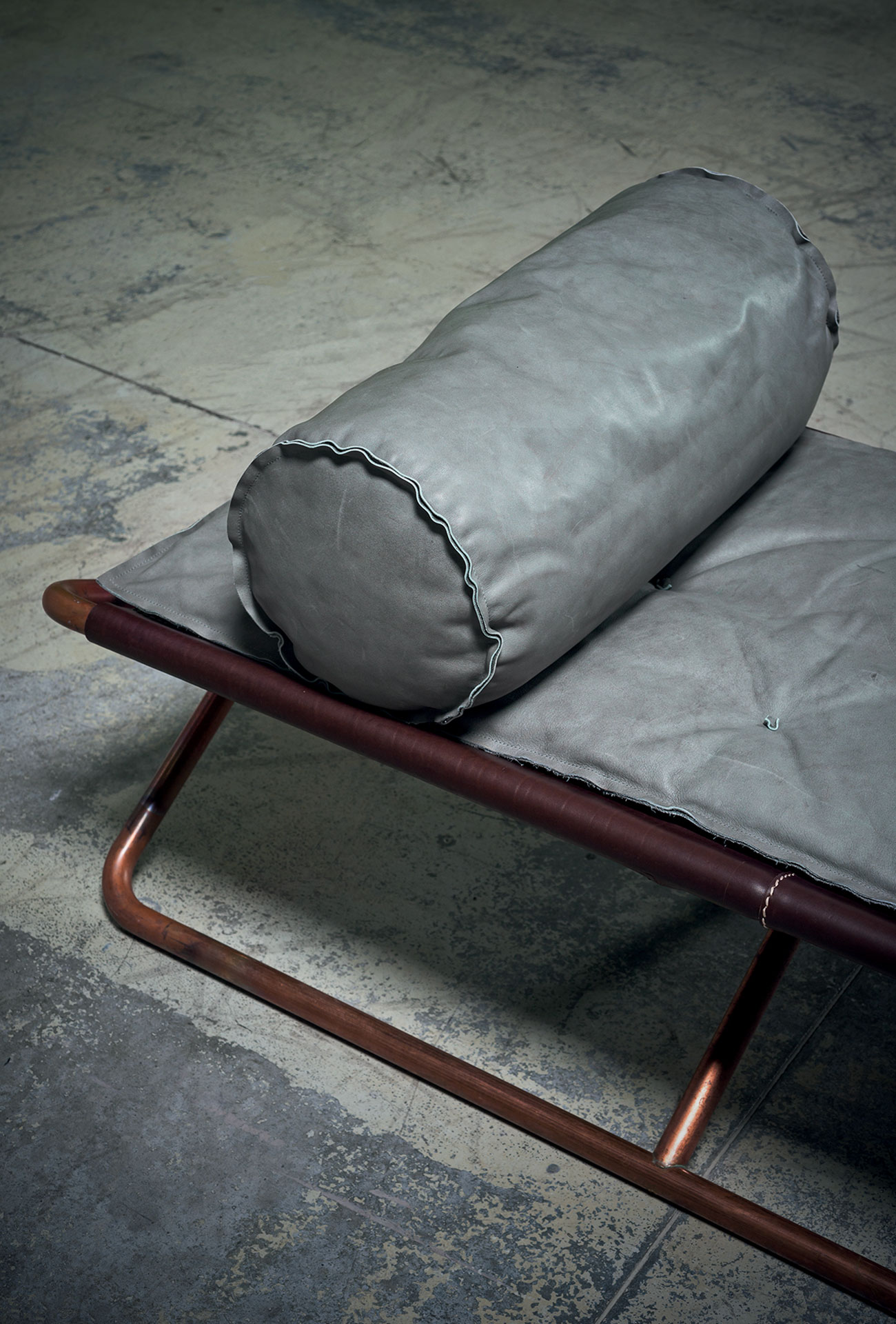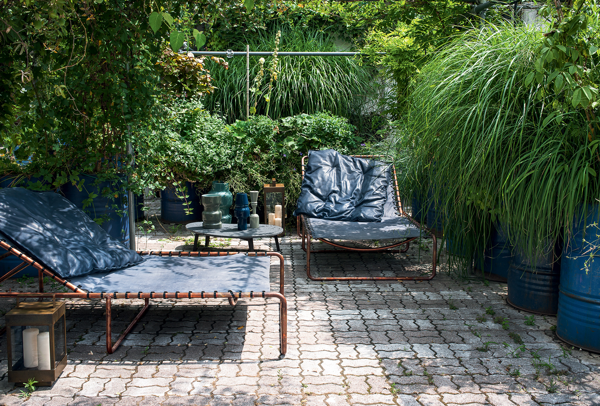 Reclining beach lounger. Etched copper tubular frame. Seat and backrest are fastened to the structure through some polyamide clamps resistant to UV rays.